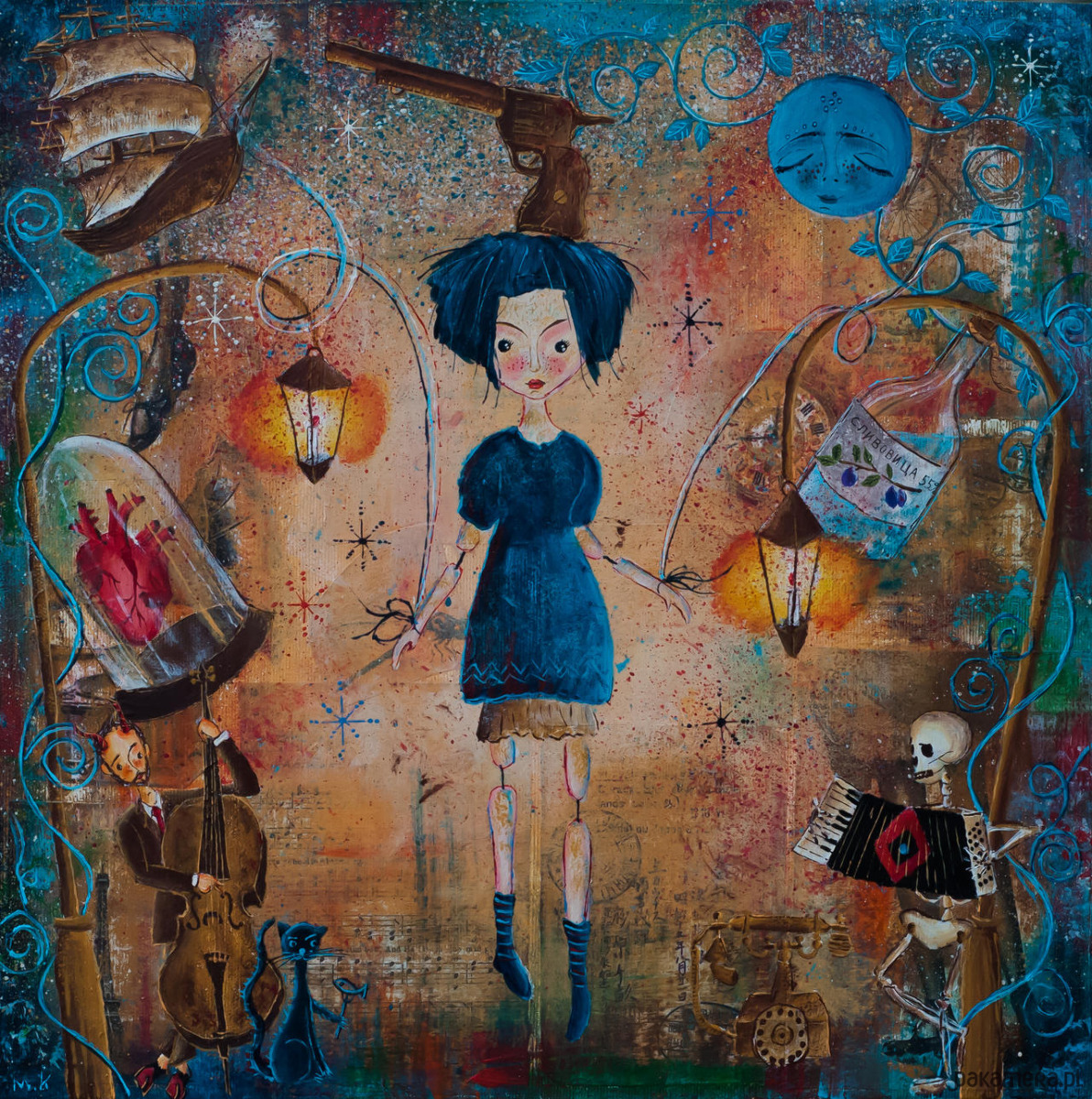 "Wendy" - akryle i kolaż na płótnie. Wystawiony przedmiot to wydruk na płótnie naciągniętym na drewnianą ramę, gotowy do powieszenia na ścianę. 40x40 cm.