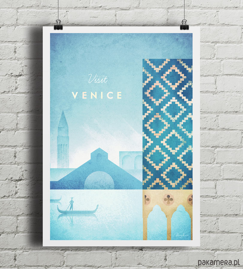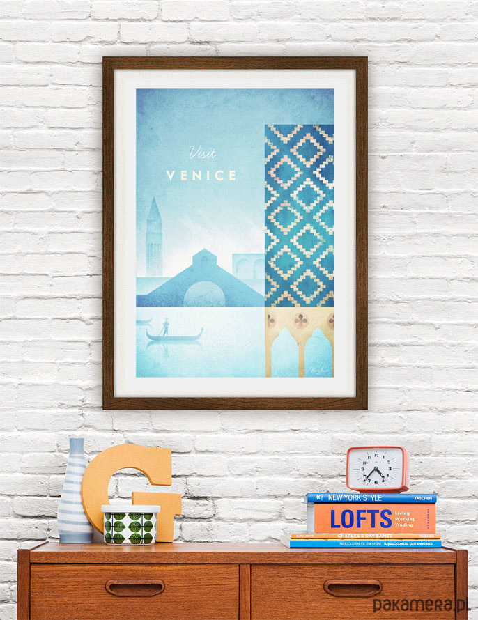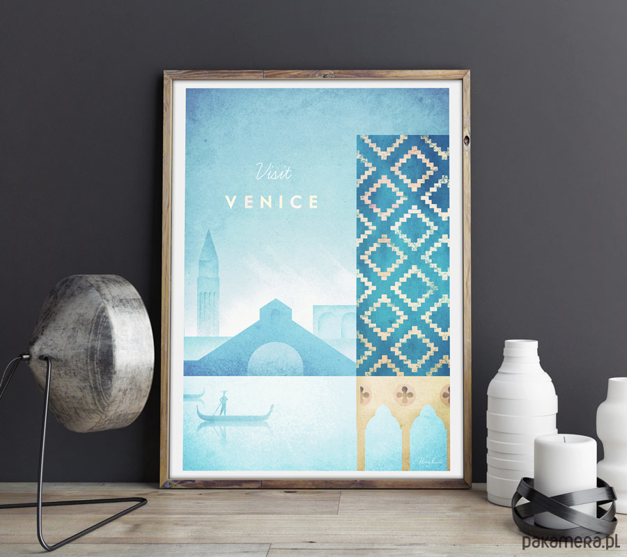 Plakat w stylu vintage przedstawiający gondolię przepływającą po weneckim kanale. Na pierwszym planie widnieje Pałac Dożów, w tle widoczny jest Most Rialto oraz ikoniczna Dzwonnica św. Marka. Inspirowany plakatami podróżniczymi z lat 20-tych XX wieku.