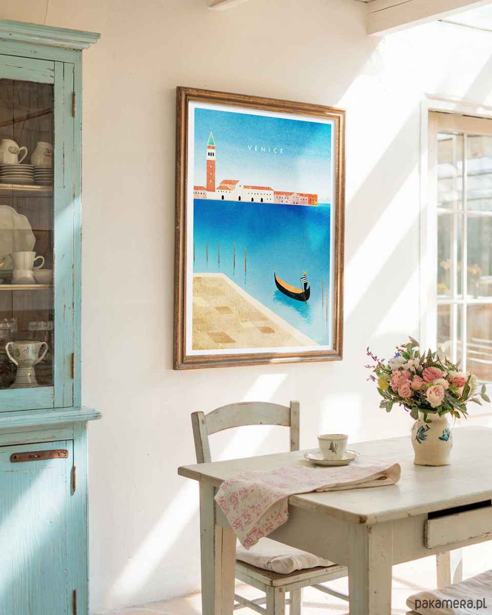 Plakat „Wenecja Włochy - Canal Grande i Dzwonnica św. Marka” przedstawia jedno z najpiękniejszych włoskich miast z rozmarzoną nostalgią. Słynny Plac św. Marka z górującą nad miastem kampanilą widziany jest z drugiego brzegu, z placu przy bazylice Santa Maria della Salute.