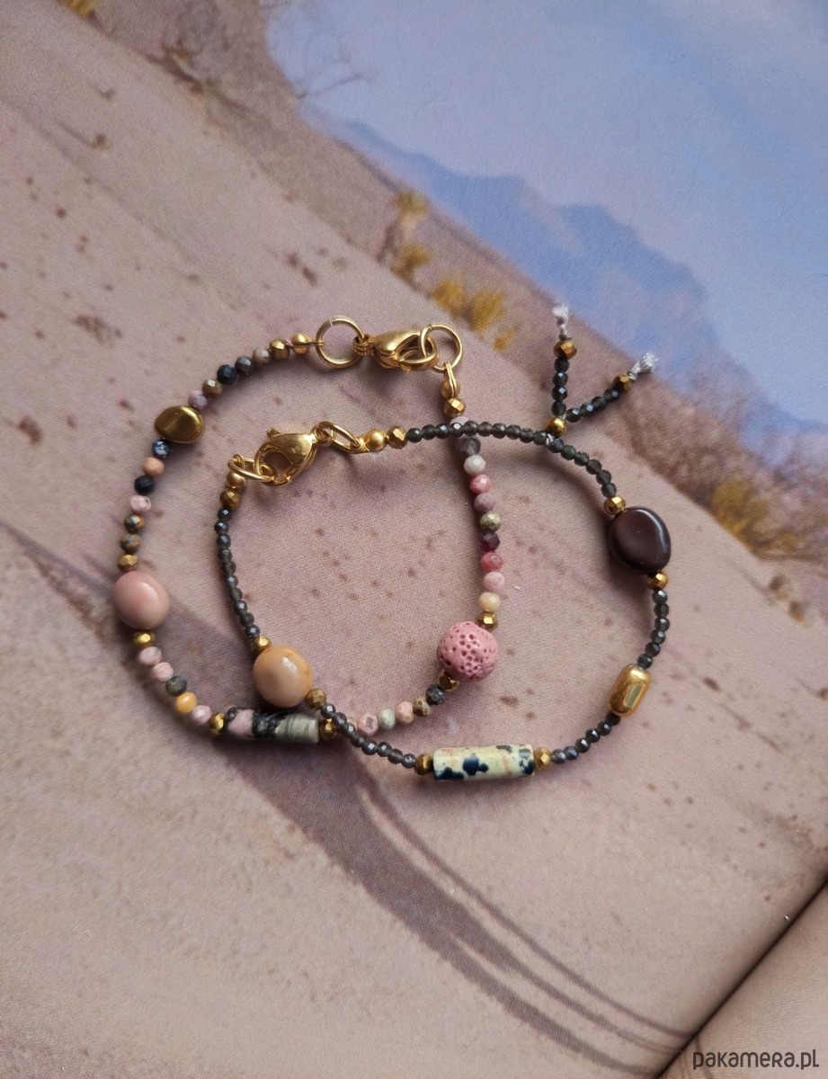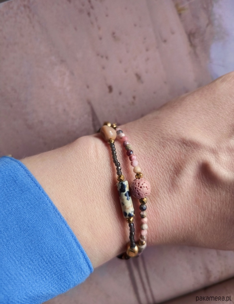 Zestaw 2 bransoletek :ciemna z obsydianu który ma właściwości uziemiające i ochronne oraz różowej z rodonitu ,jaspisu ,mokaitu i akcentu z lawy wulkanicznej