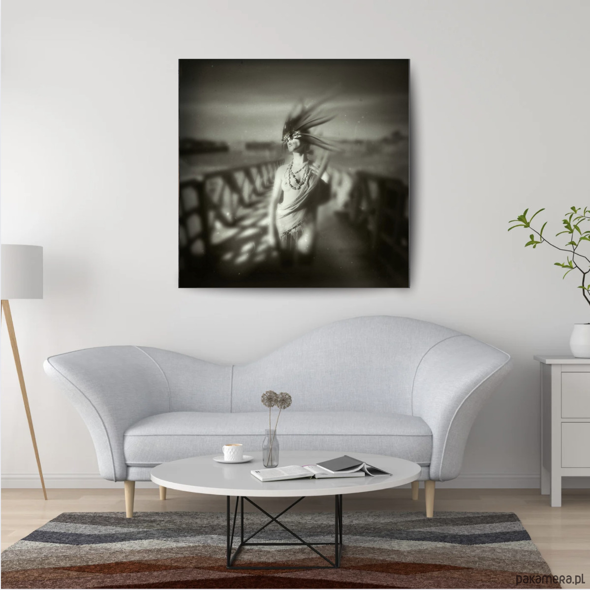 Fotografia artystyczna, akt na płótnie satynowanym 60x60 cm, gotowa do zawieszenia na ścianie -naciągnięta na solidny blejtram i utrwalona werniksem (mat lub piękny pół połysk satynowy), co daje dodatkowe zabezpieczenie przed urazami zewnętrznymi. Werniks w bardzo elegancki sposób wydobywa fakturę płótna, a pół połysk dodatkowo ożywia kolory. Dzięki werniksowi można obraz od czasu do czasu delikatnie przetrzeć na sucho z kurzu.