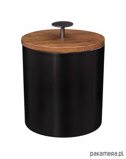 Wiaderko do kostek lodu. Całość wykonana z metalu w kolorze czarnym. Pokrywa wykonana jest z drewna.