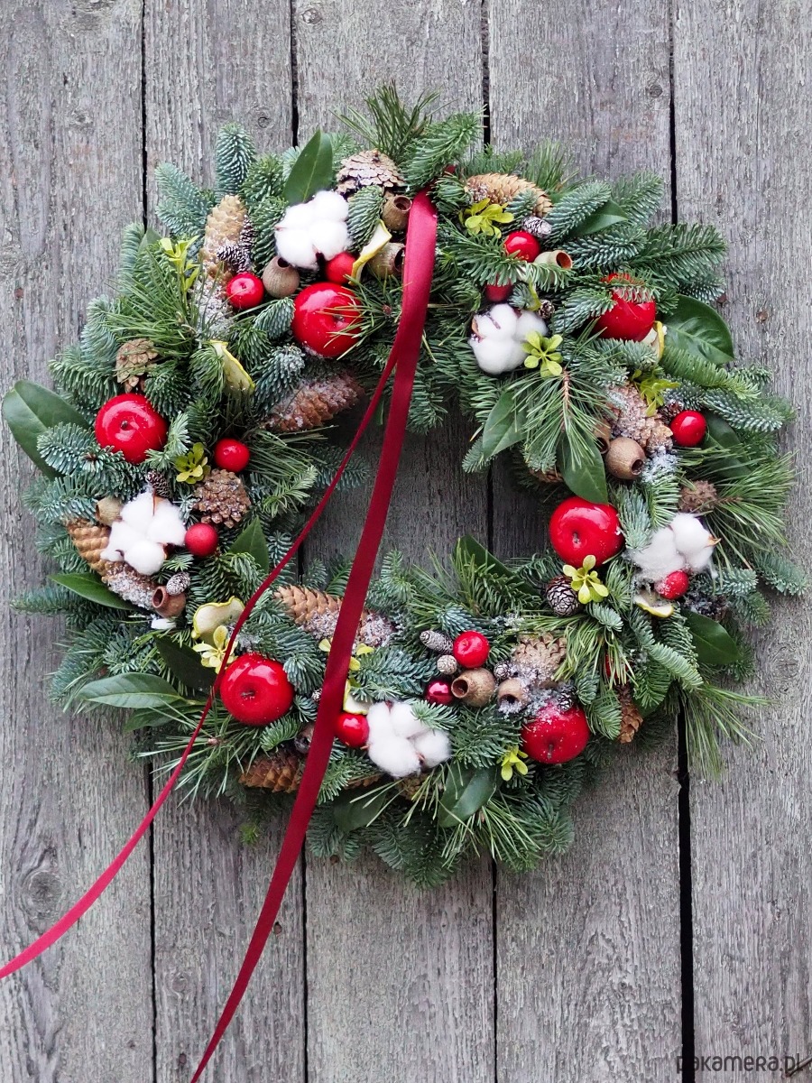 Prezentowany wianek wykonany jest z trwałych, naturalnych gałązek jodły, sosny i laurowiśni. Ozdobiony jest szyszkami, jabłkami i naturalnymi kwiatami bawełny oraz malutkimi szklanymi bombkami. Wianek jest ogromny i bardzo okazały.