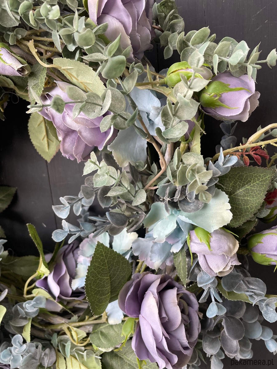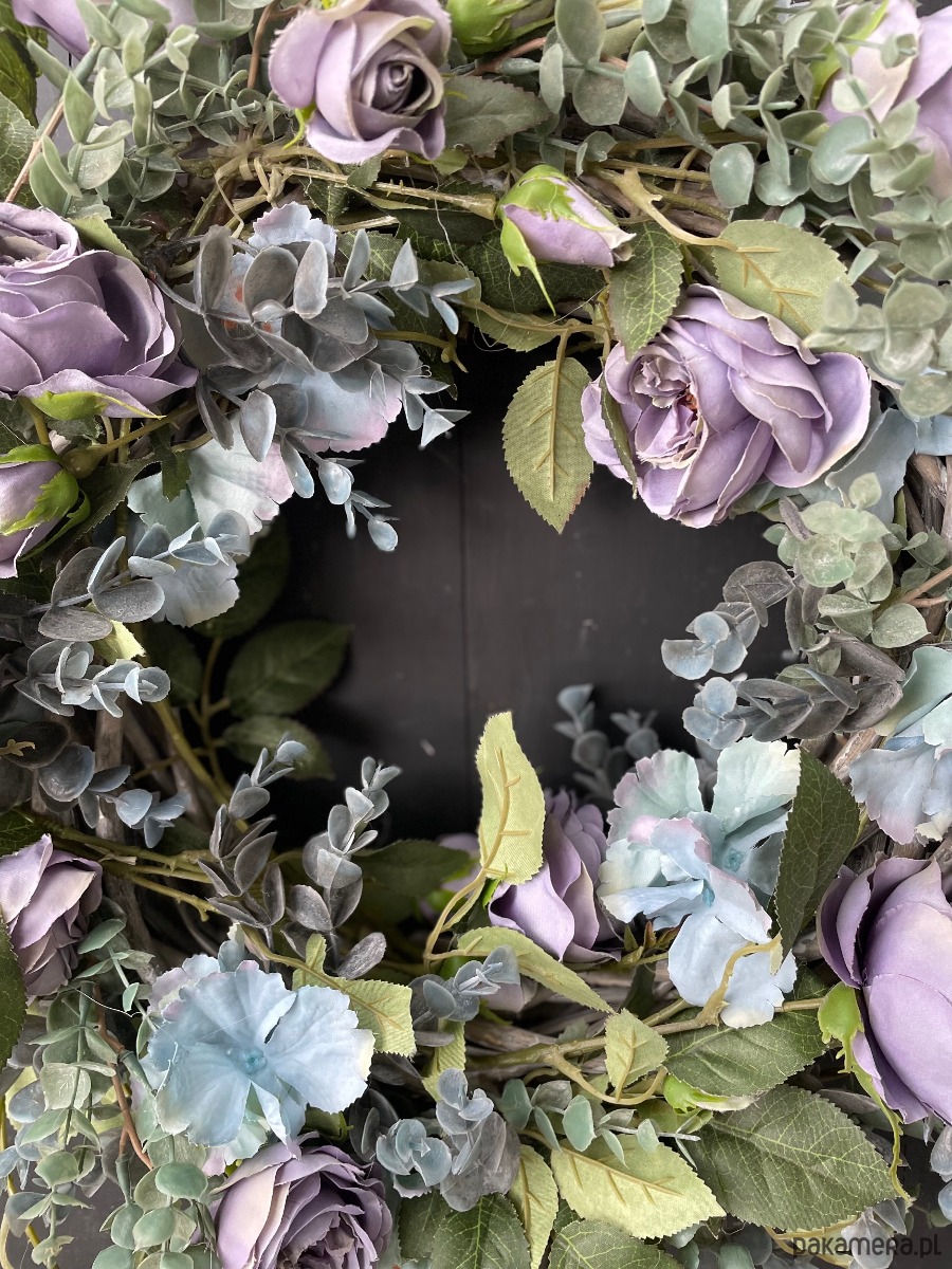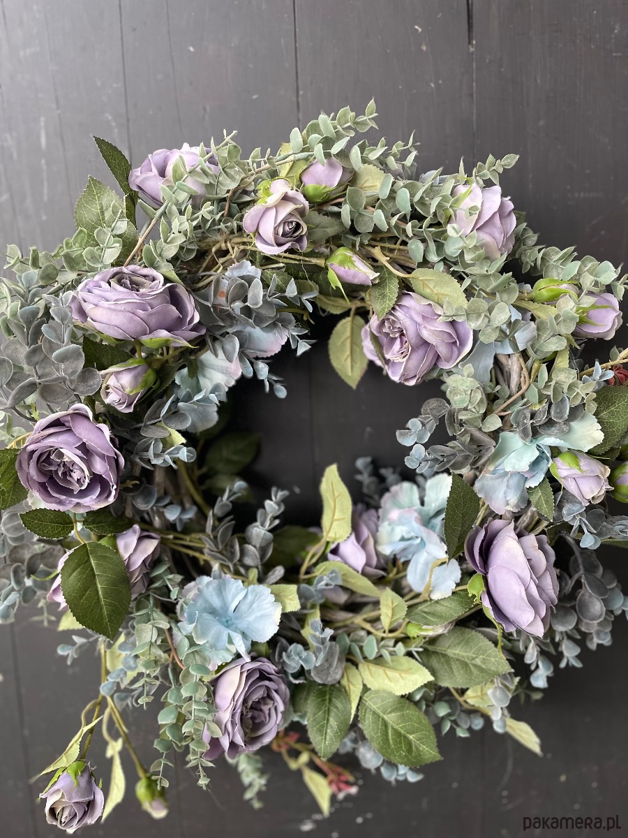 Wianek wykonany ze sztucznych róż w kolorze zgaszonego fioletu i szarych gałązek eukaliptusa. Wianek wykonany jest na rattanowym podkładzie a wszystkie pozostałe elementy są sztuczne. Średnica ok 45cm.