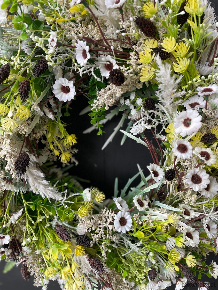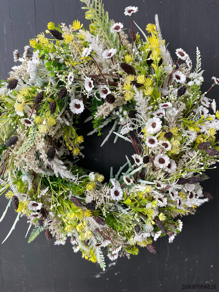 - Materiał: suszone kwiaty, wiklina, sztuczne kwiaty