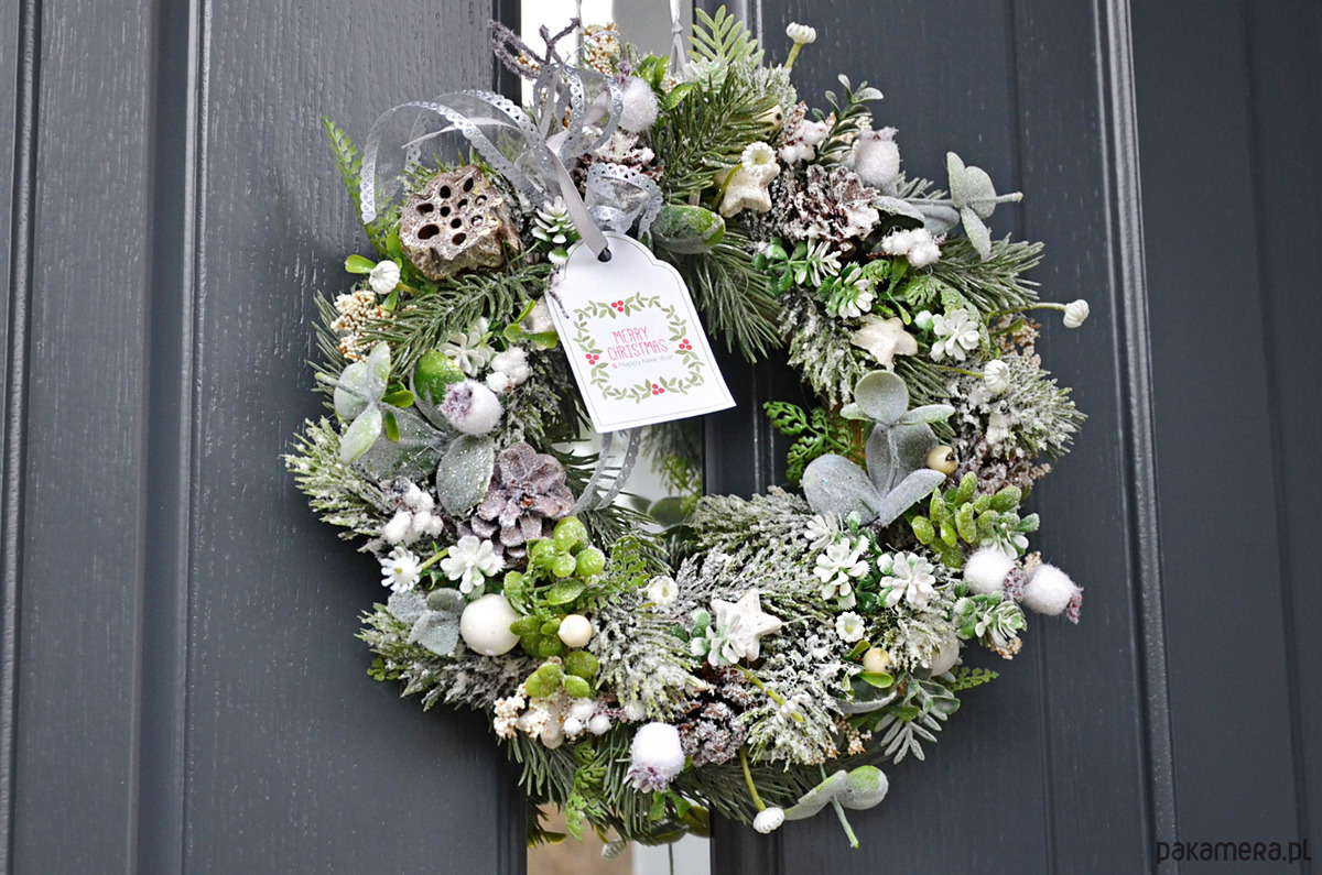 Mały, ręcznie wykonany wianek bożonarodzeniowy w zimowych mieniących się srebrem i przyprószonych sztonem zieleniach i śnieżnych bielach.Wianek przepięknie pachnie cynamonem:)Ma zawieszkę z życzeniami świątecznymi i zapakowany jest w ozdobny kartonik, co czyni z niego doskonały niezobowiązujący prezent:)