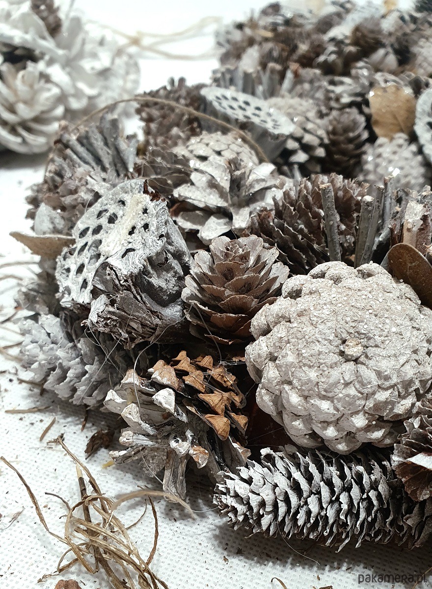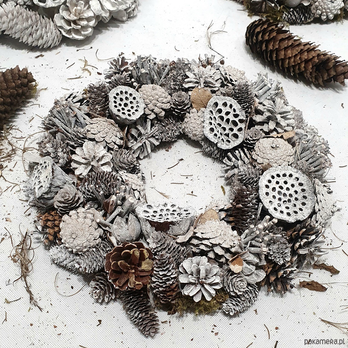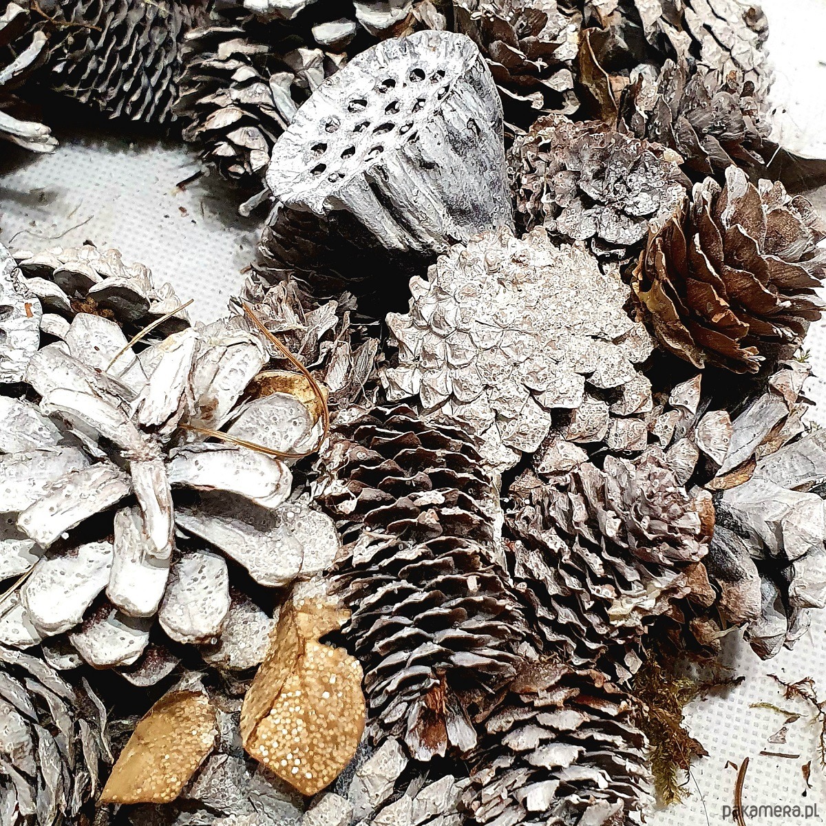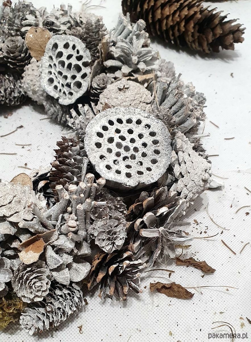 Skomponowany z naturalnych leśnych elementów, takich jak gałązki, szyszki, delikatne listki i zasuszone kwiaty, ten wianek emanuje świeżością i naturalnym pięknem.