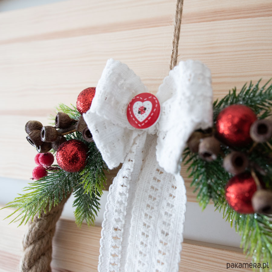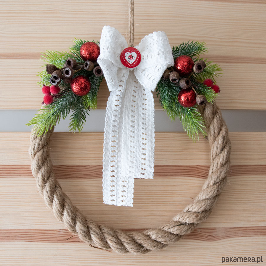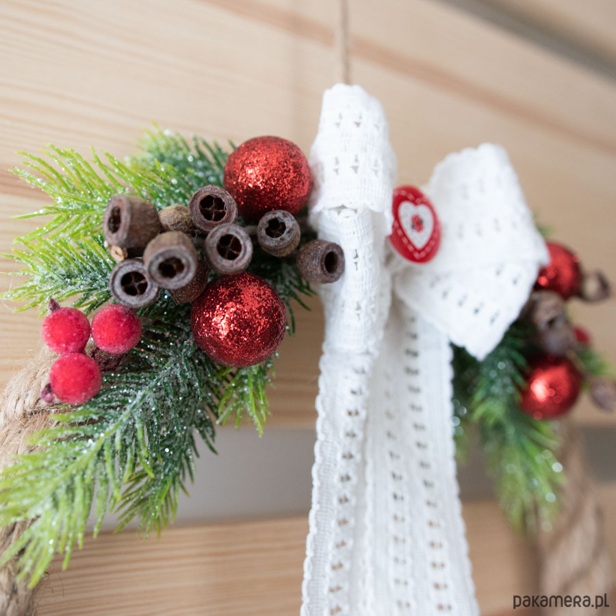 Wieniec jest wykonany z liny jutowej, sztucznych gałązek, naturalnej koronki, suszu oraz czerwonych dodatków. Posłuży na pewno wiele lat w okresie świątecznym:)