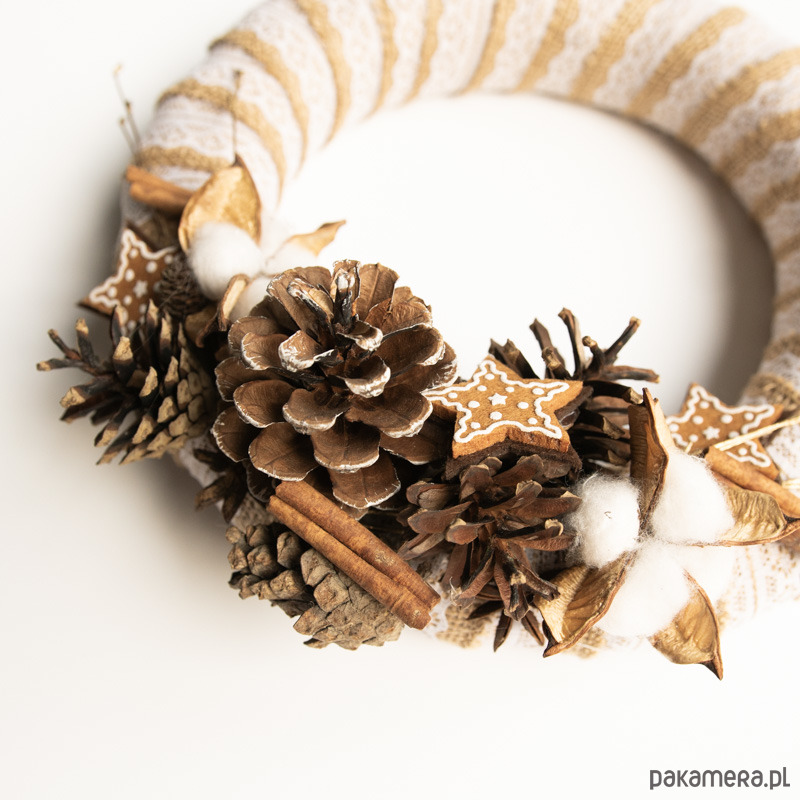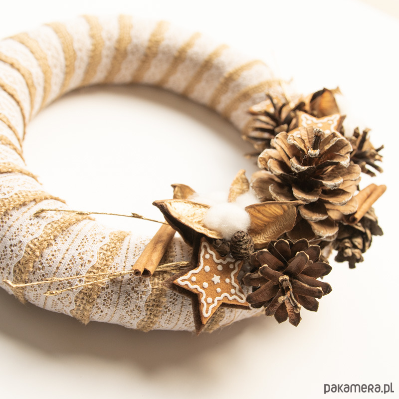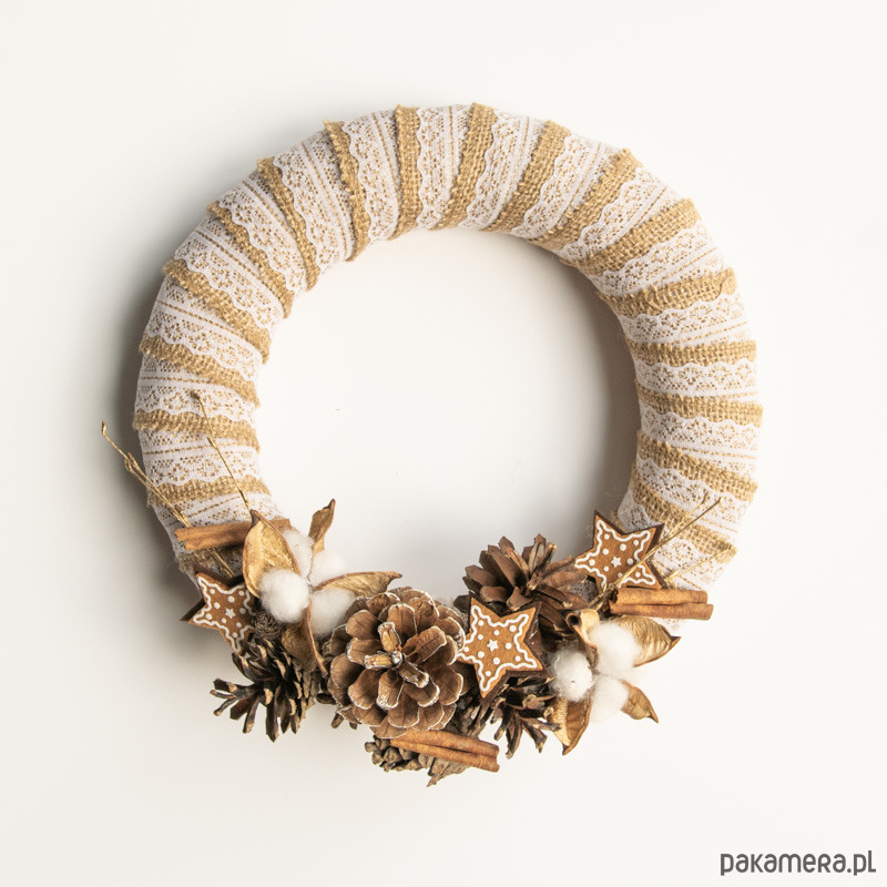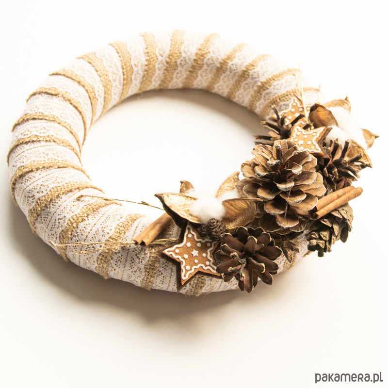 Wieniec ma ok 25cm szerokości, całość wykonana jest z juty z białą koronką, szyszek, główek bawełny, cynamonu i anyżu z dodatkiem filcowych "pierniczków".