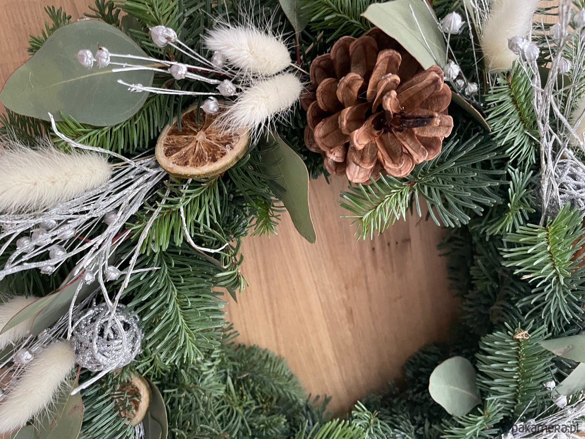 Wianek z jodły nobilis. Średnica z dodatkami to około 40 cm. Szybka wysyłka. Wianek z jodły nobilis przetrwa do 8 tygodni. Idealny na ścianę , drzwi lub stół wigilijny.