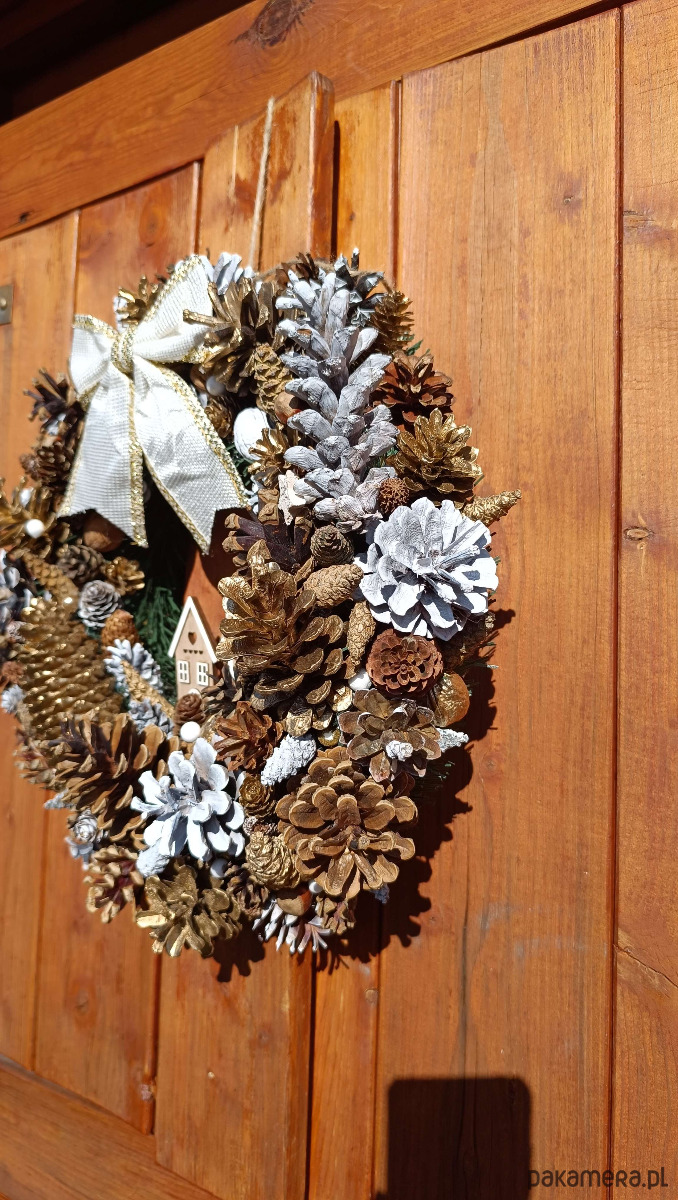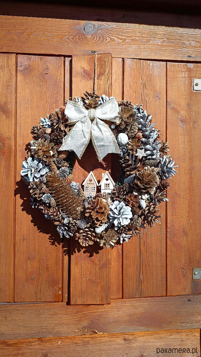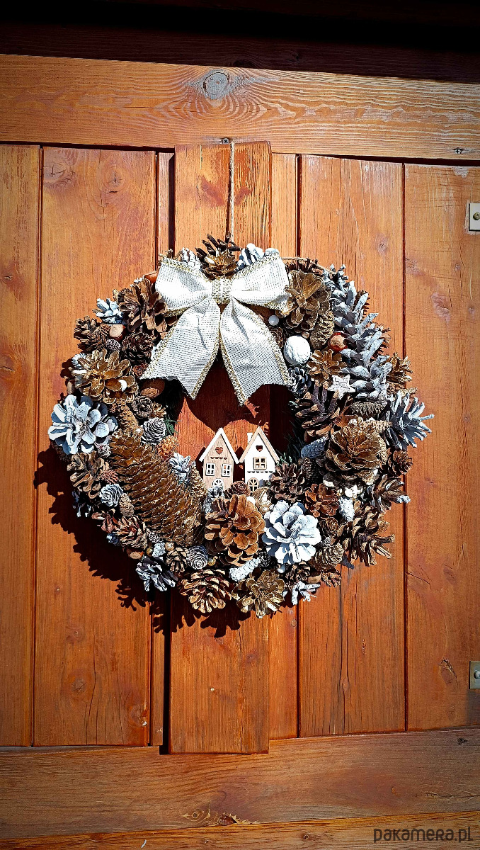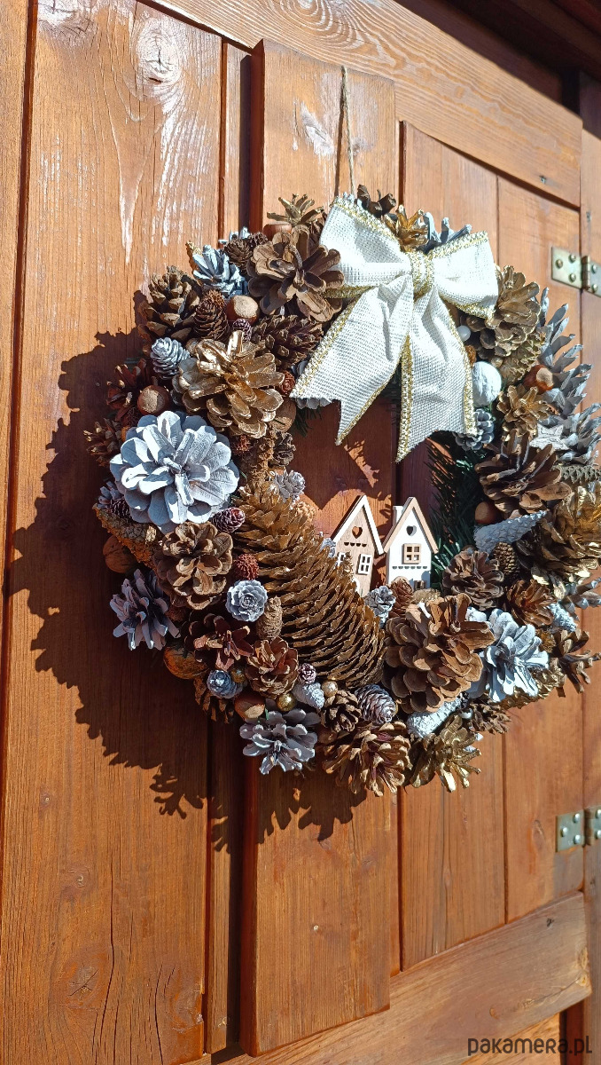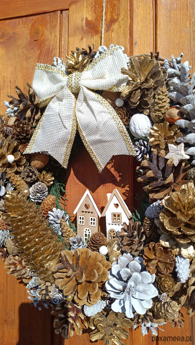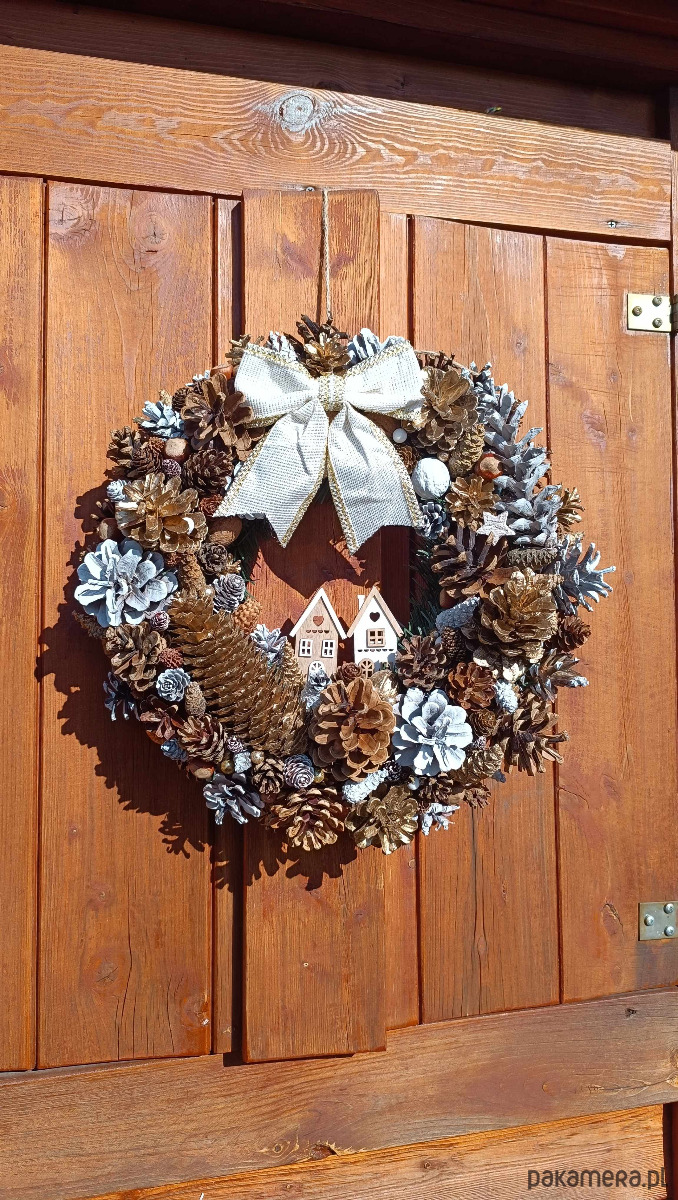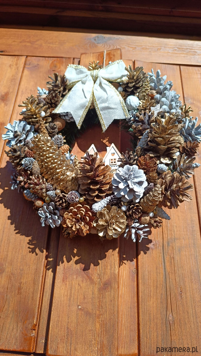 oferuję na sprzedaż własnoręcznie wykonany wianek świąteczny. Piękna naturalna dekoracja - szyszki zbierane wiosną, dobrze osuszone i oczyszczone. Malowane latem, więc zapach spray'u już zupełnie niewyczuwalny. Całość na solidnym słomianym podkładzie, średnica ok 40-45 cm, mocny sznurek do zawieszenia. Wszystko wykonane z jak największą dbałością o detale.