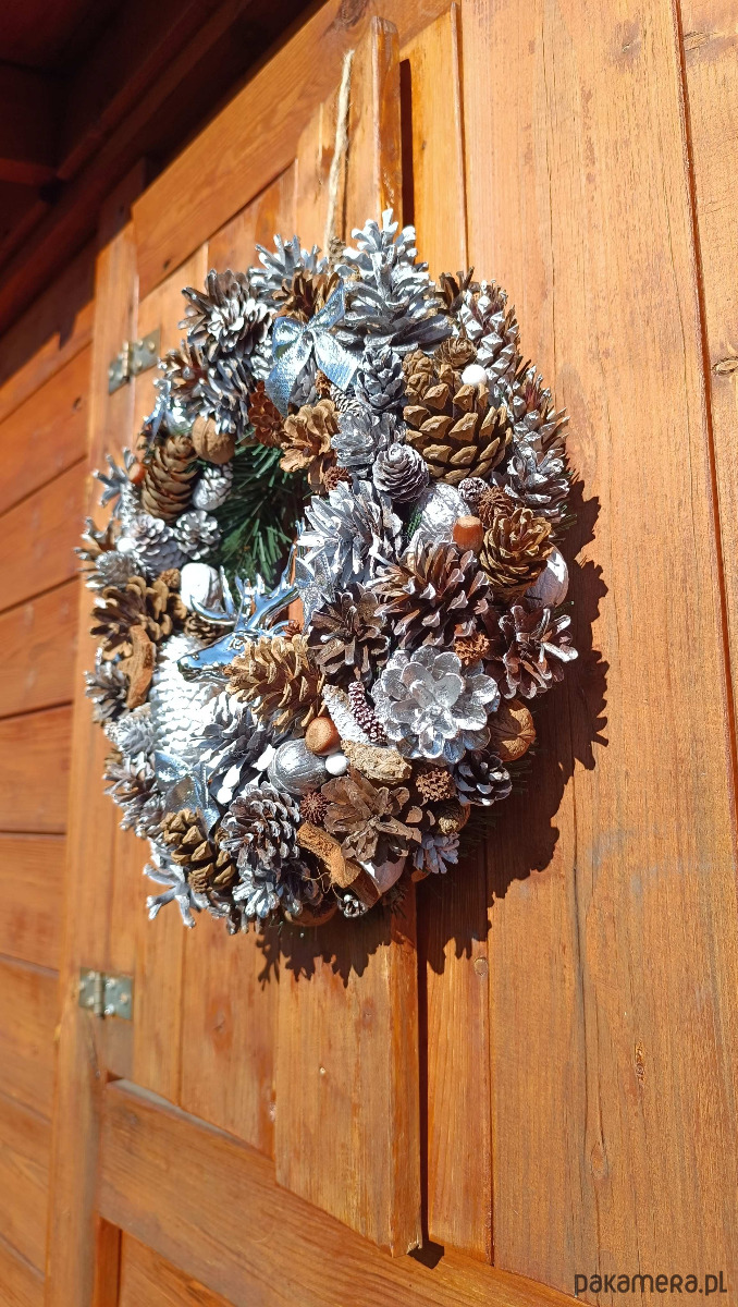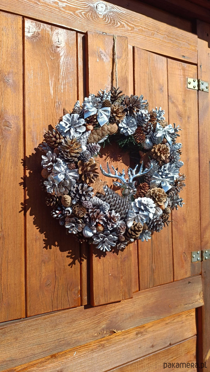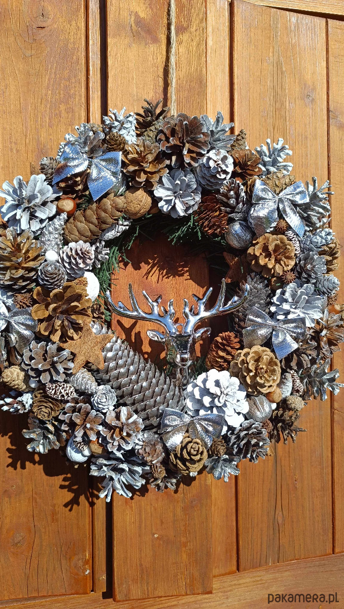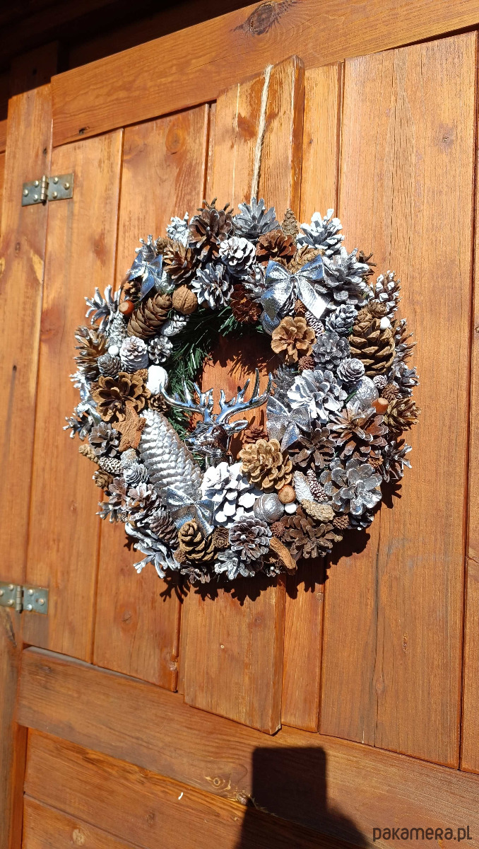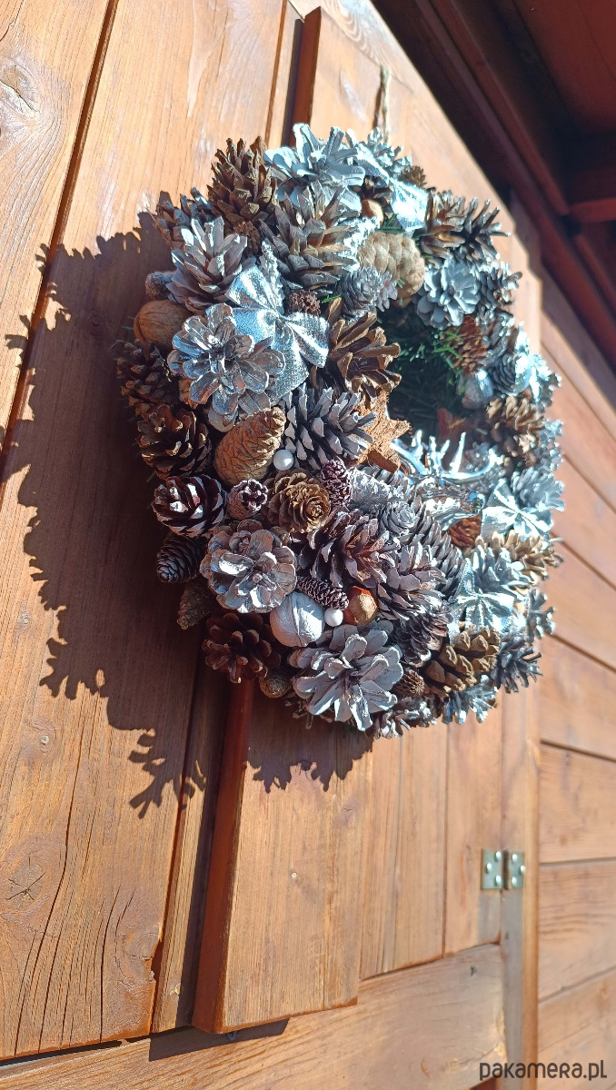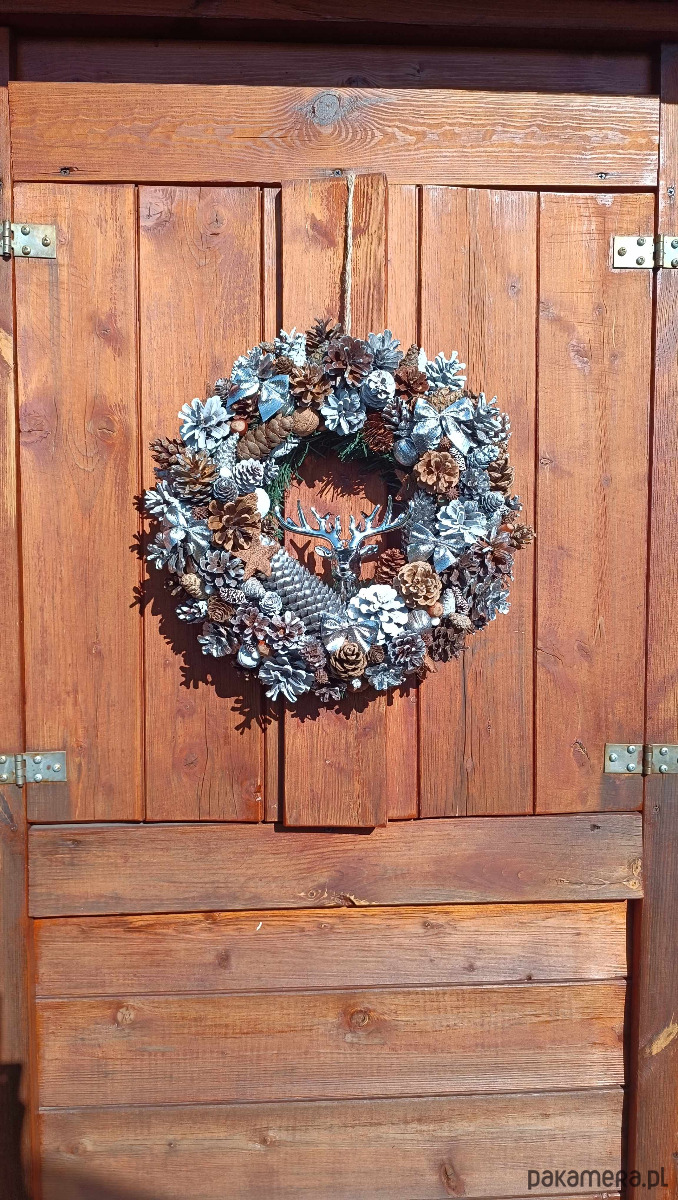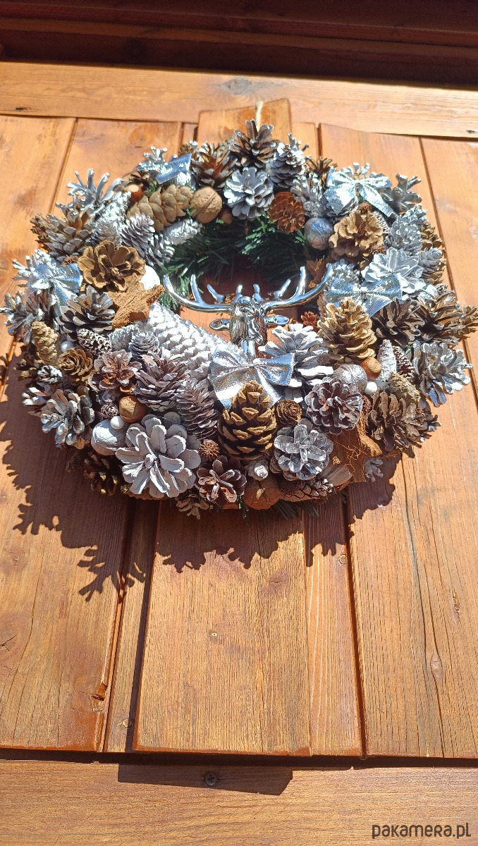 oferuję na sprzedaż własnoręcznie wykonany wianek świąteczny. Piękna naturalna dekoracja - szyszki zbierane wiosną, dobrze osuszone i oczyszczone. Malowane latem, więc zapach spray'u już zupełnie niewyczuwalny. Całość na solidnym słomianym podkładzie, średnica ok 40-45 cm, mocny sznurek do zawieszenia. Wszystko wykonane z jak największą dbałością o detale.