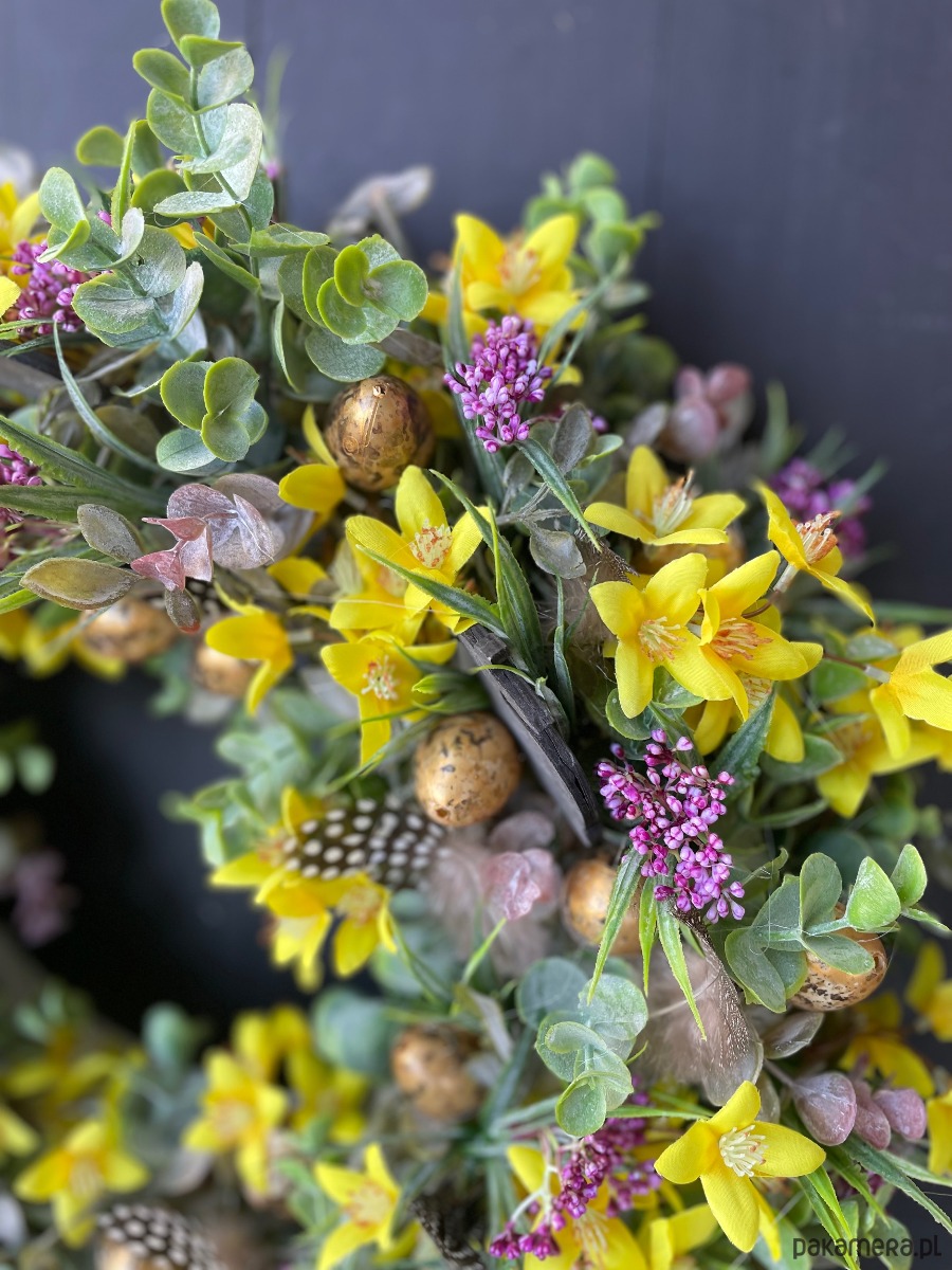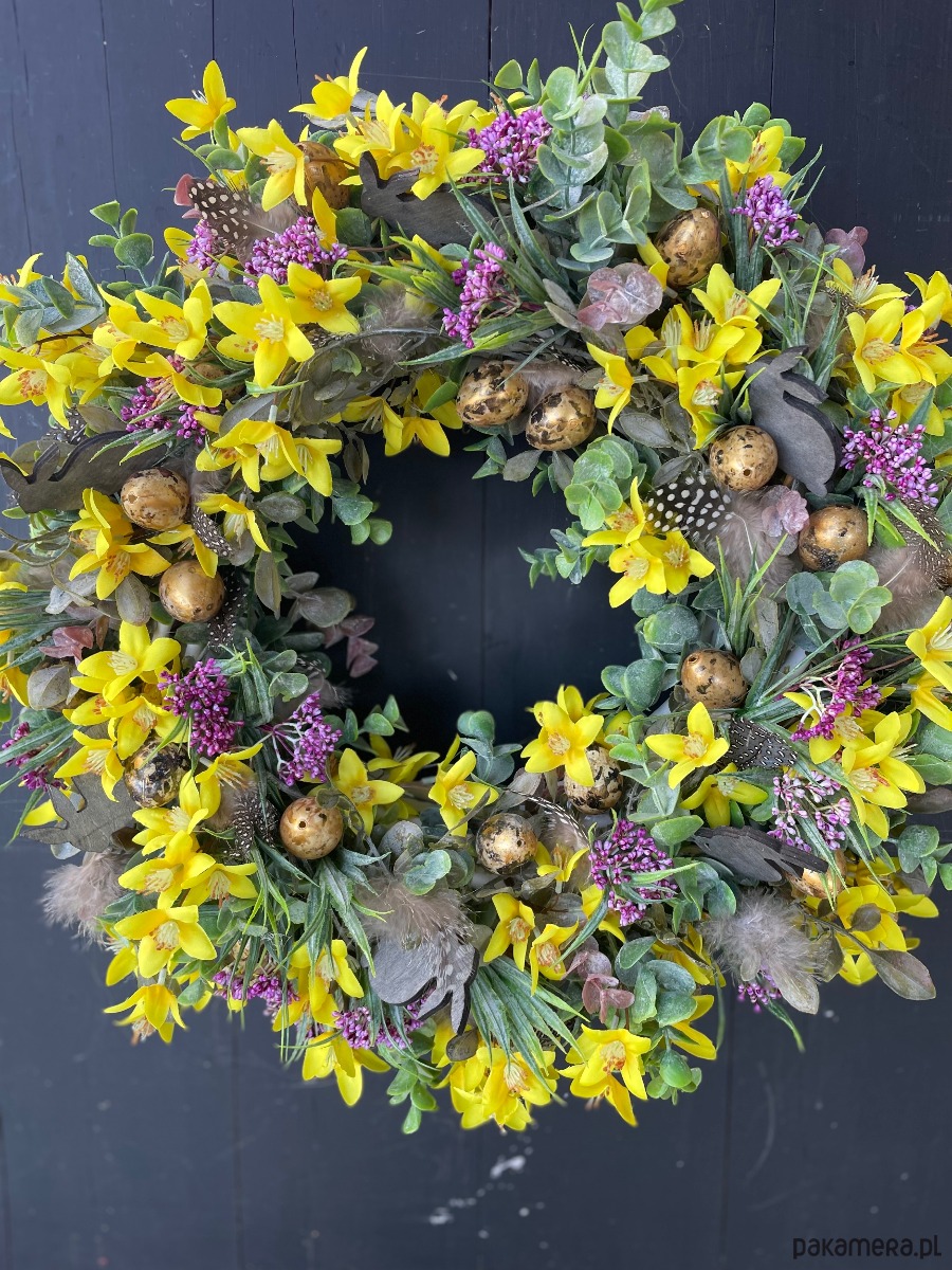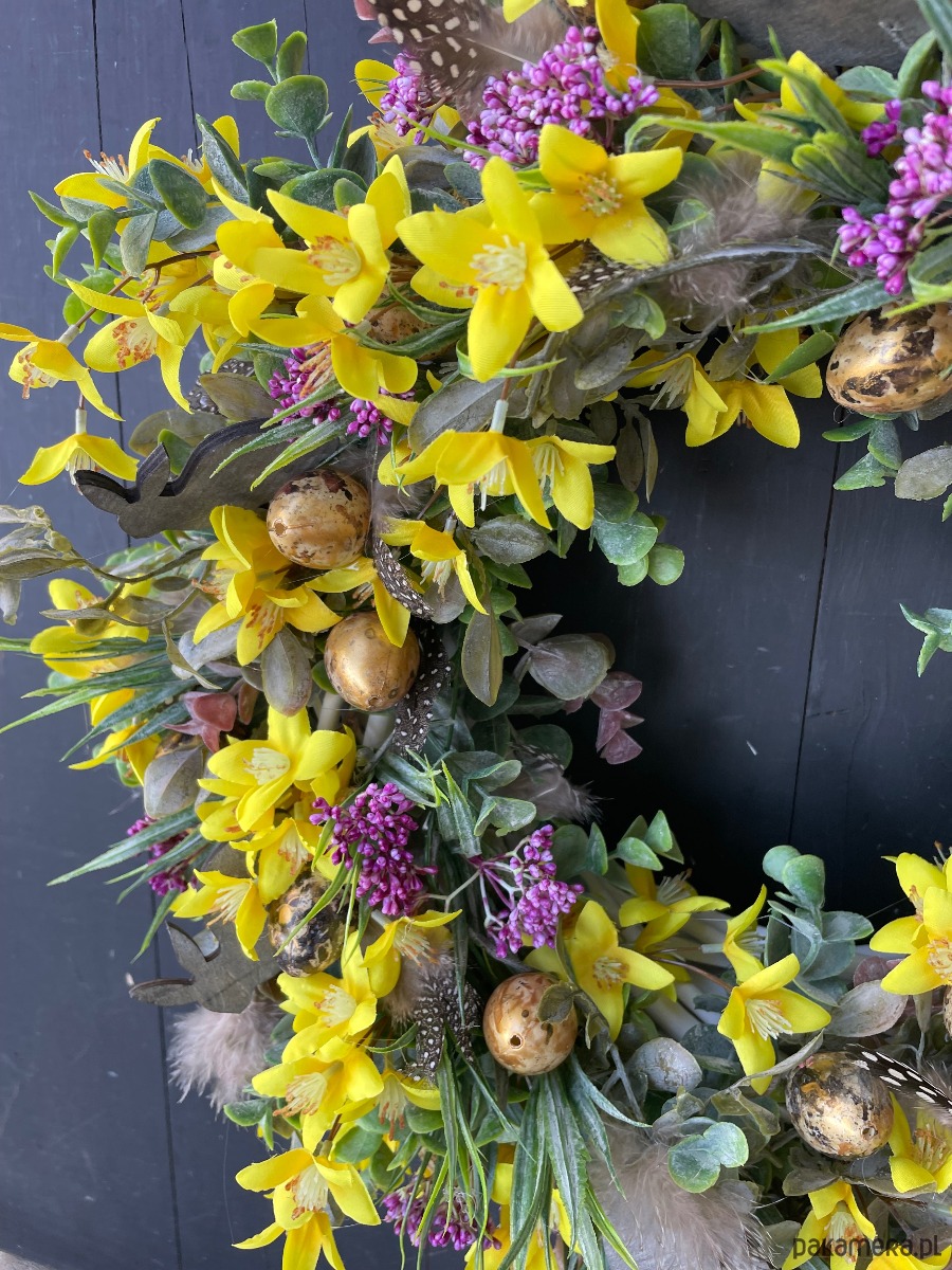 Piękny wielkanocny wianek wykonany w całości ze sztucznych elementów na podstawie z rattanu. Dominuje kolor żółty i różowy. Średnica ok 45-47cm.