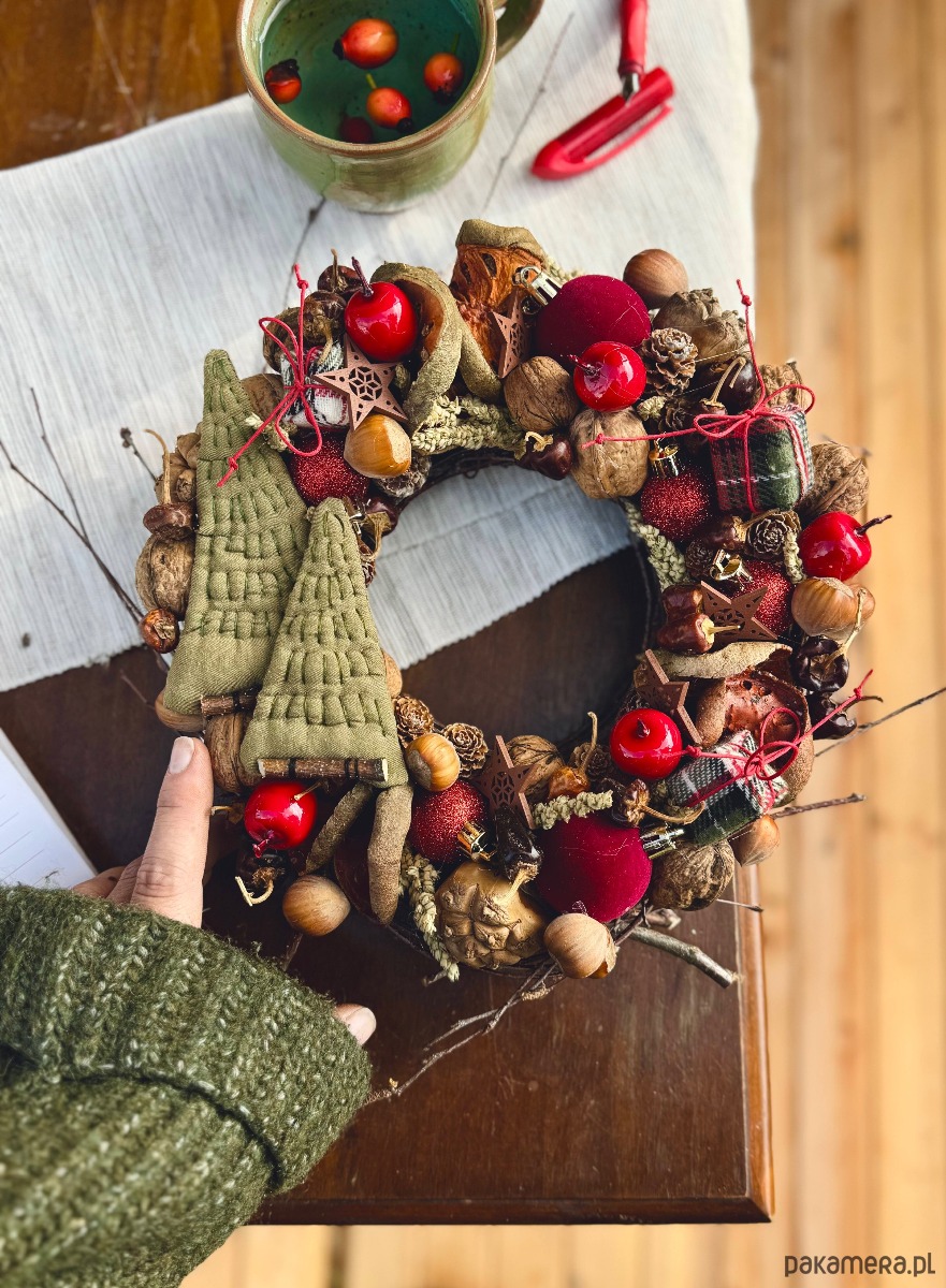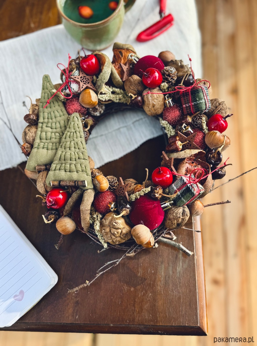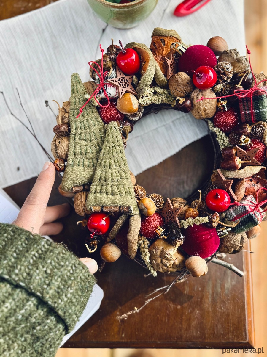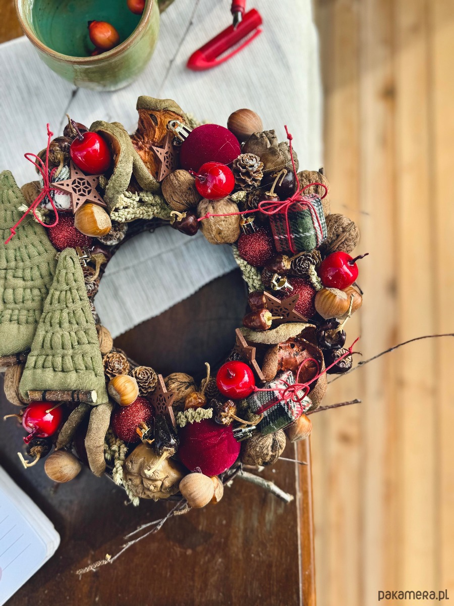 Składniki to m.in.: styropianowe jabłuszka, suszony melon, orzechy laskowe, Sorgo, bombki i bawełniane choinki.
