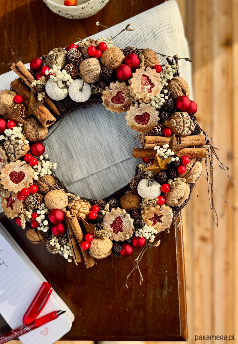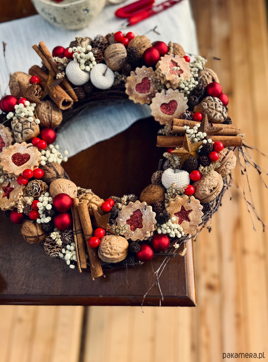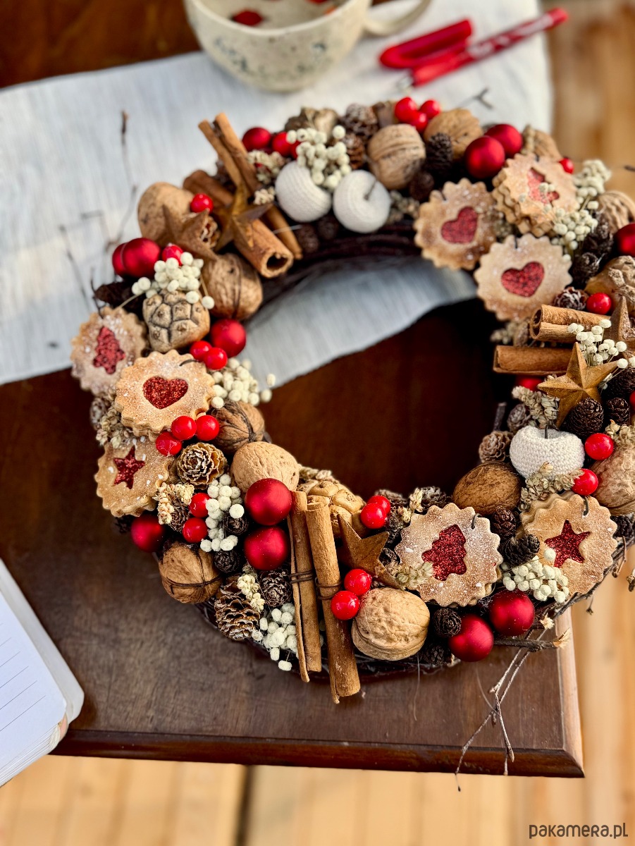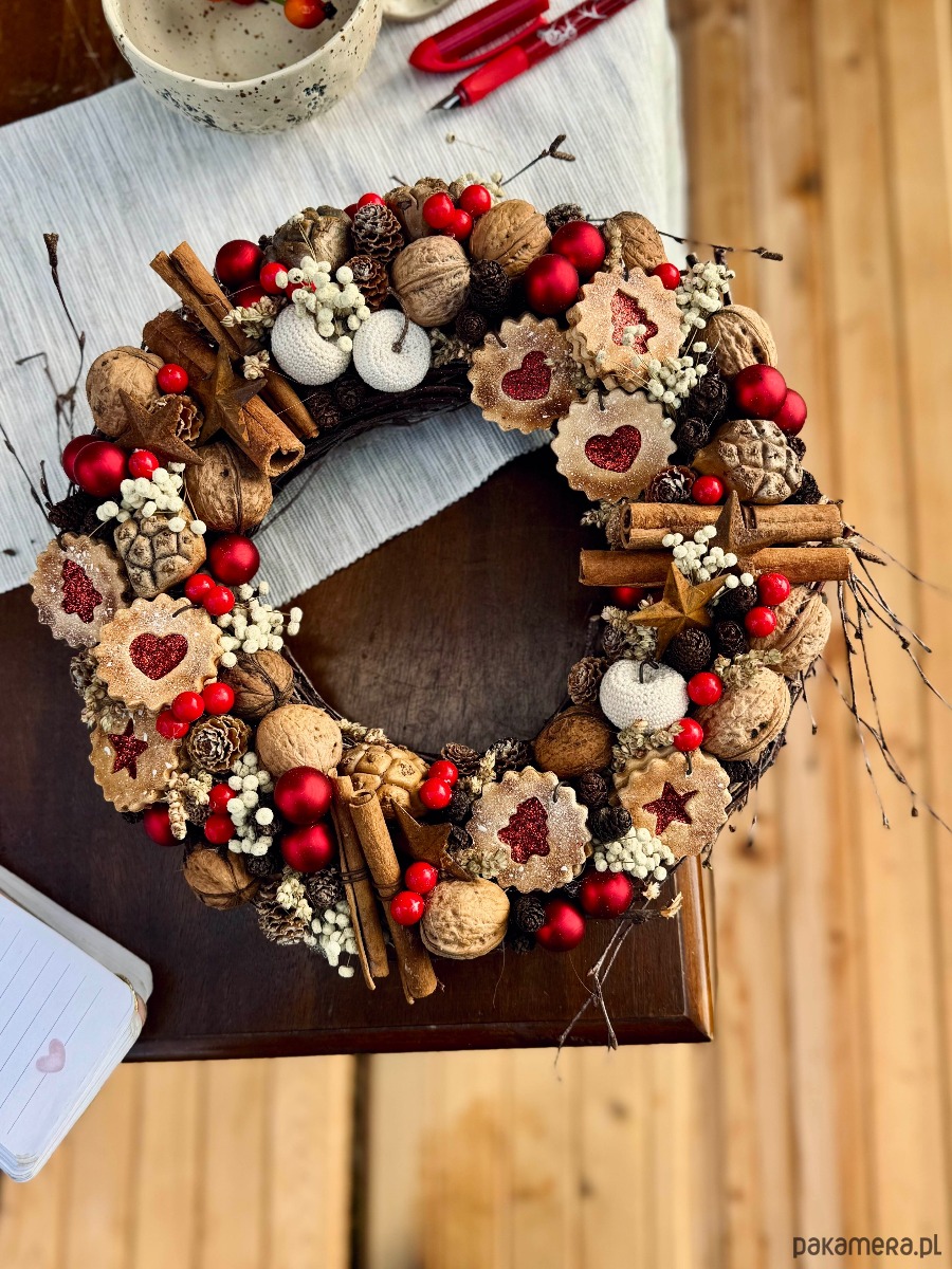 Świąteczny wianek pełen słodkości.