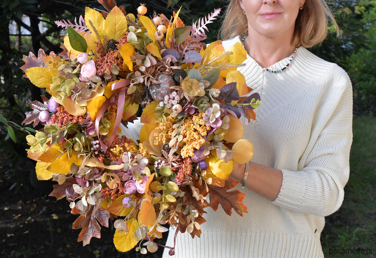 Wykonany ze sztucznych dodatków. Doskonale będzie się prezentował na stole lub drzwiach wejściowych (z tyłu ma pętelkę do zawieszenia). Każdy wianek zapakowany jest w kartonik z logo i doskonale nadaje się na prezent:)