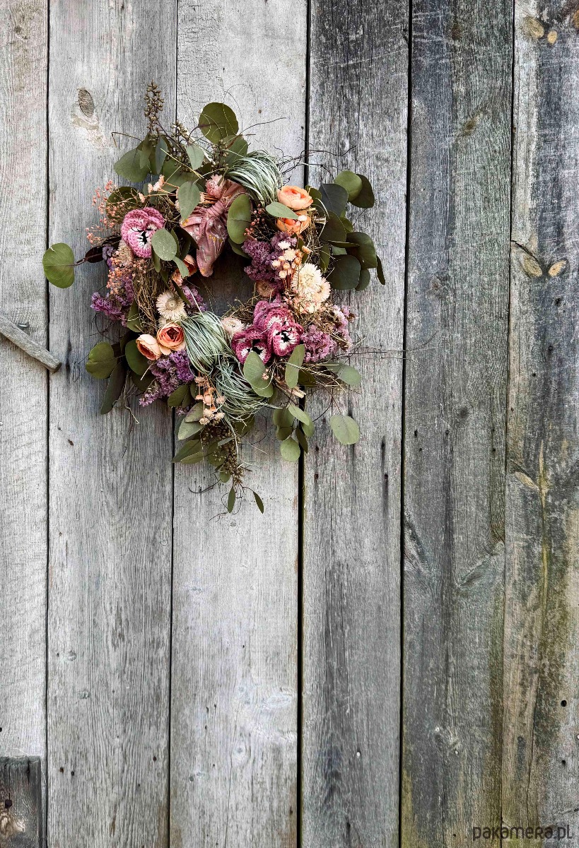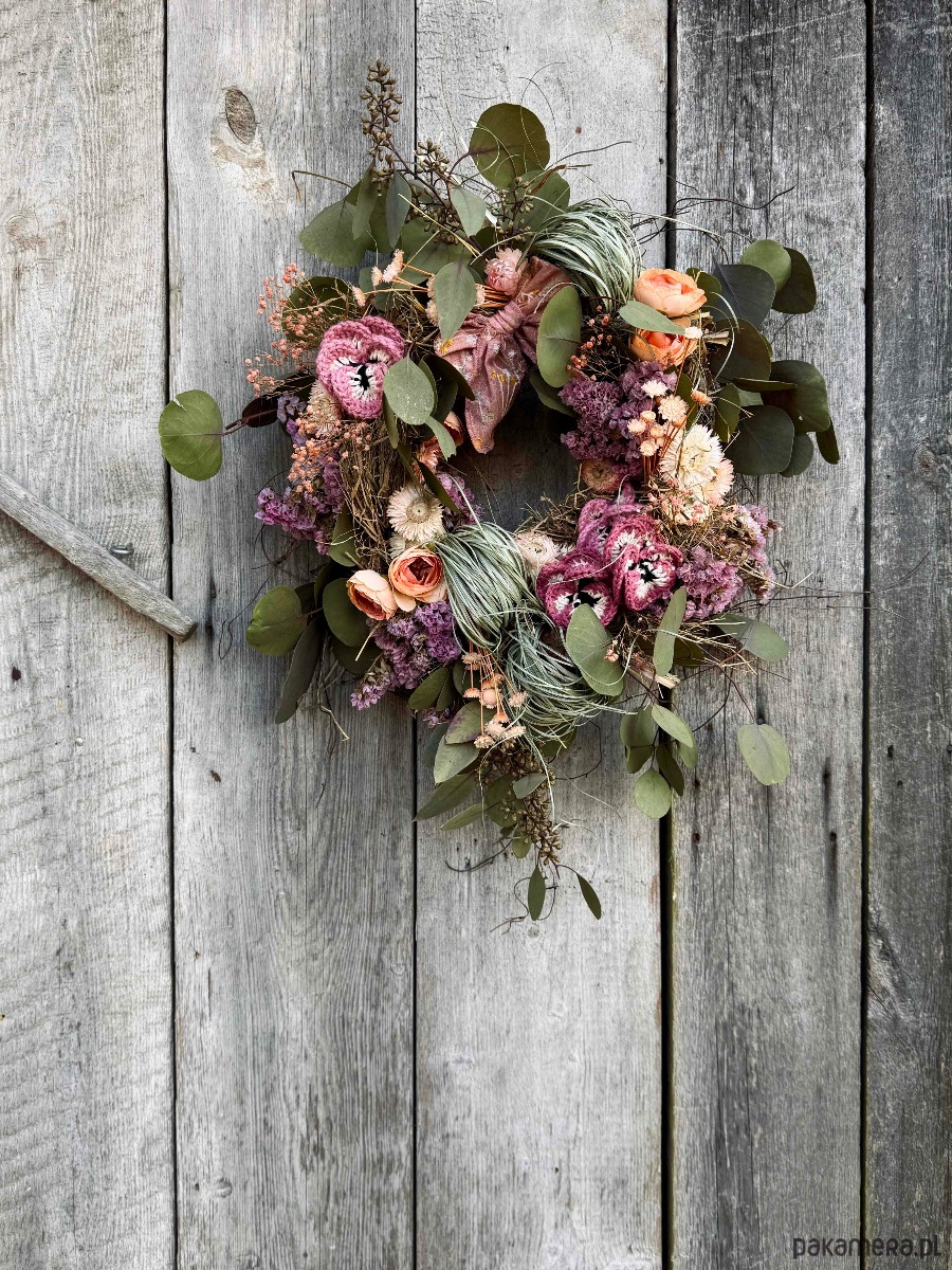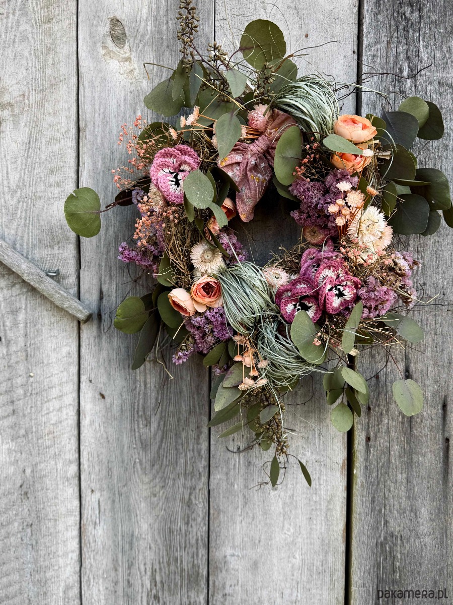 Kwiatowy wianek idealny do zawieszenia nad łóżkiem, na ścianie w poczekalni lub jak prezent dla babci.
