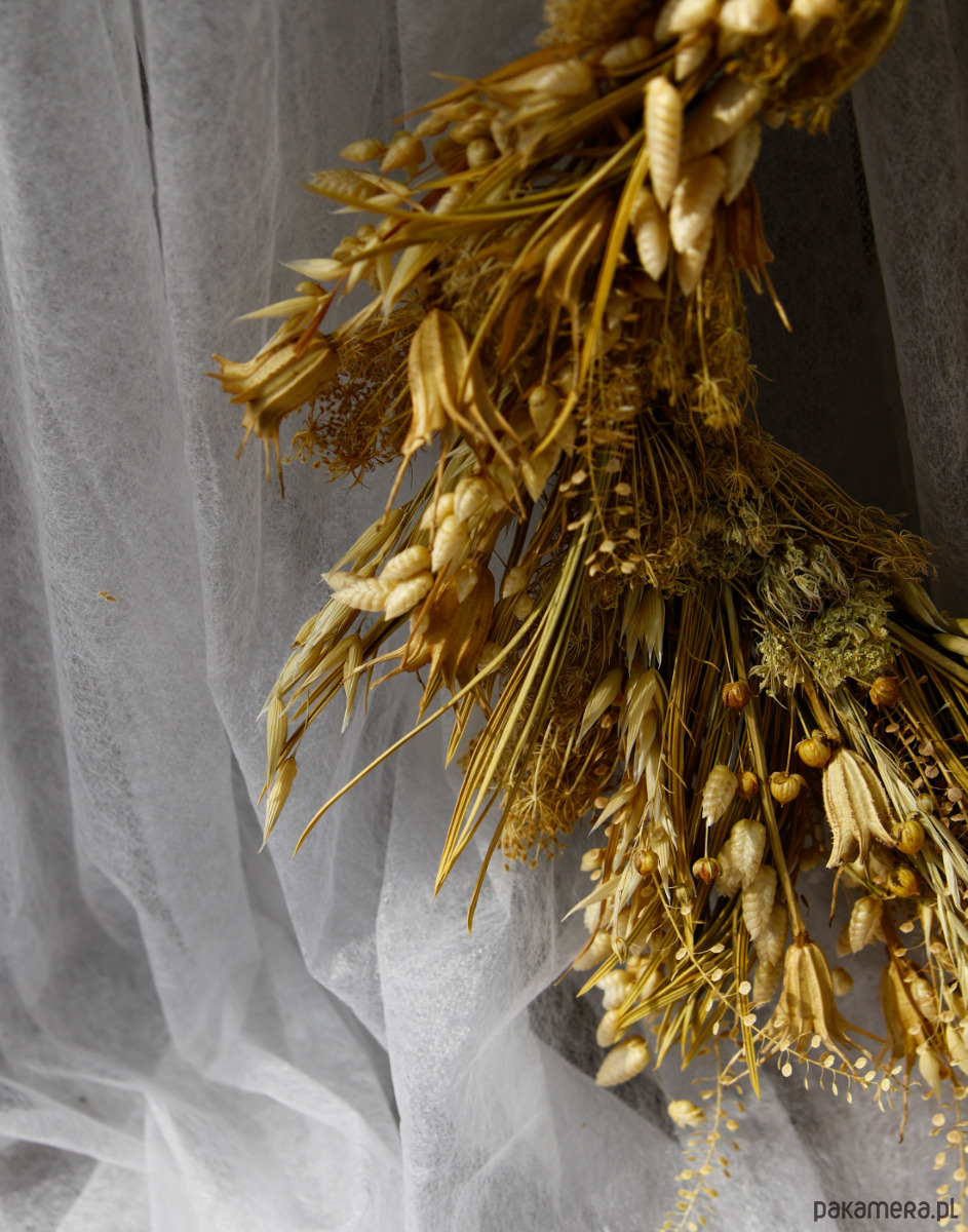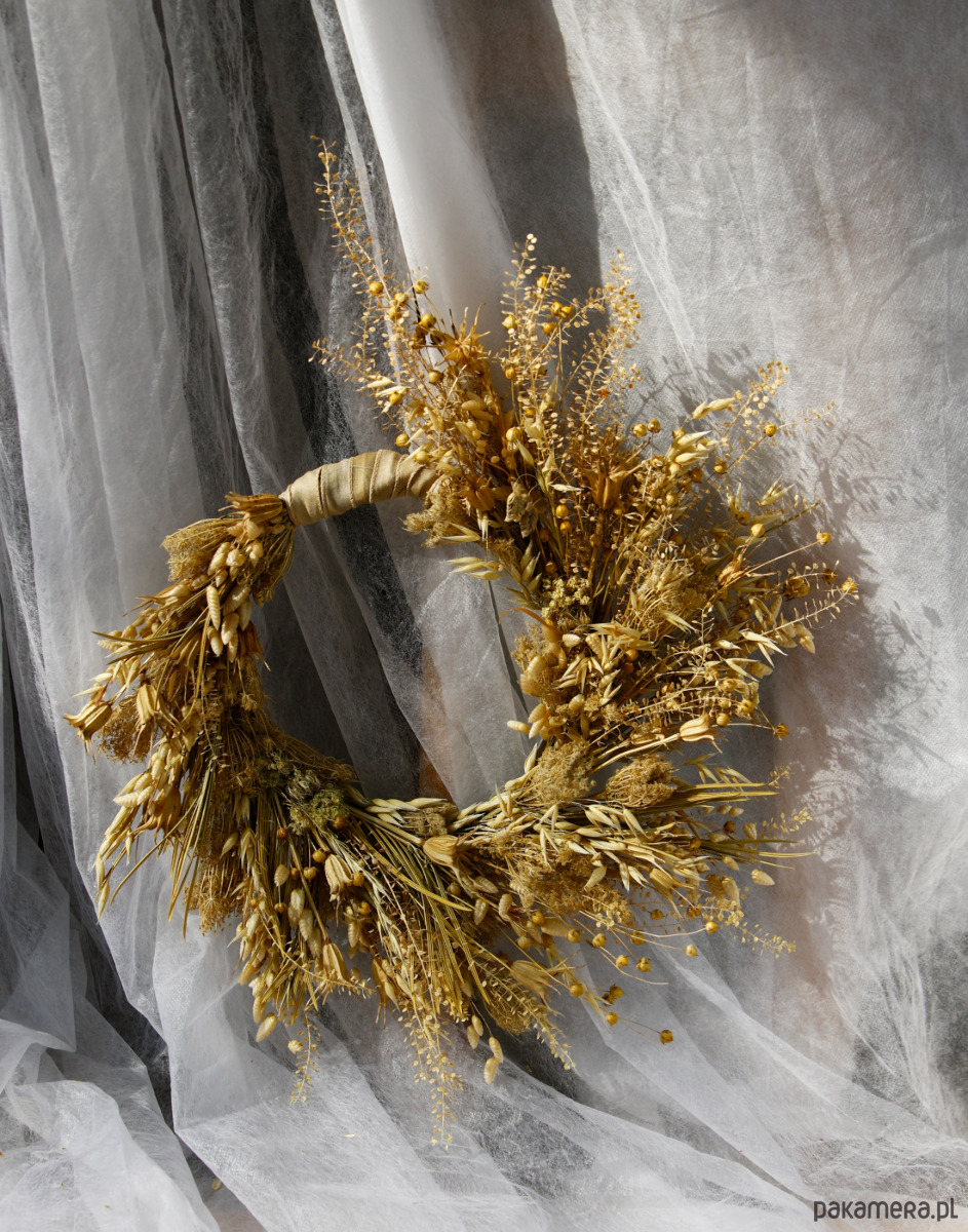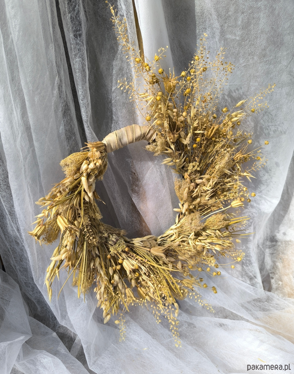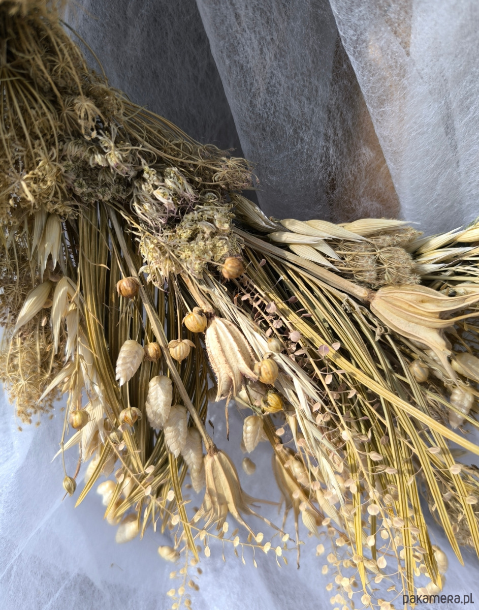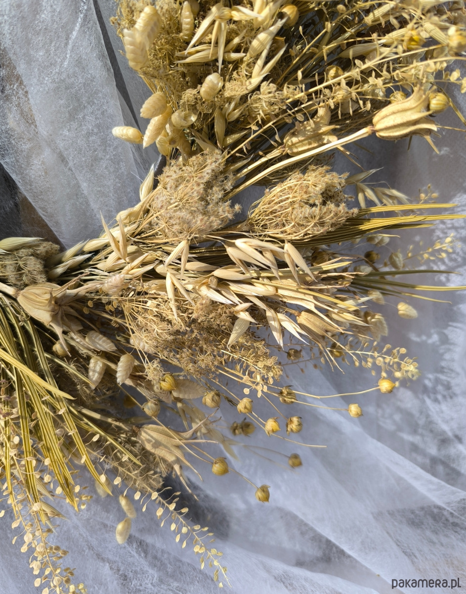 Wianek dekoracyjny z suszonych roślin. Łączy tradycję z nowoczesnością- klasyczna, okrągła forma wianka została przekształcona w asymetryczną kompozycję, tworząc rustykalną i zarazem nowoczesną dekorację. Ma lekką, ekspresyjną kompozycję Idealny do wnętrz rustykalnych, nowoczesnych, boho, minimalistycznych.
