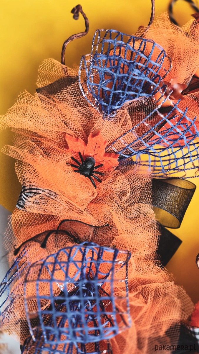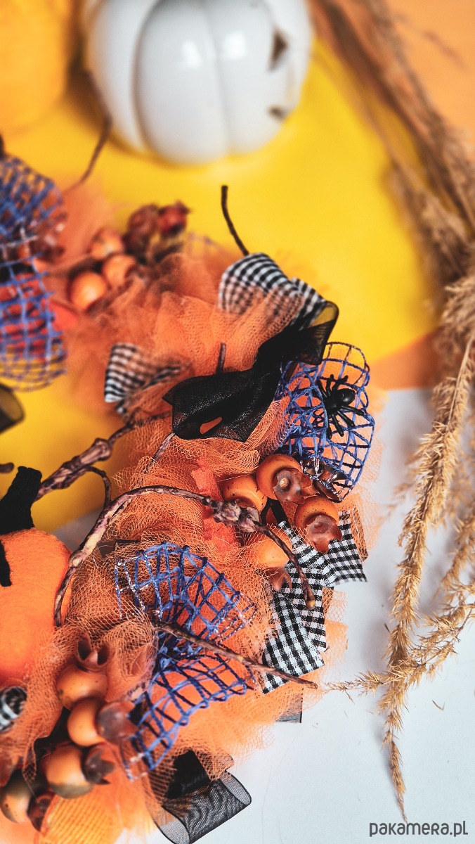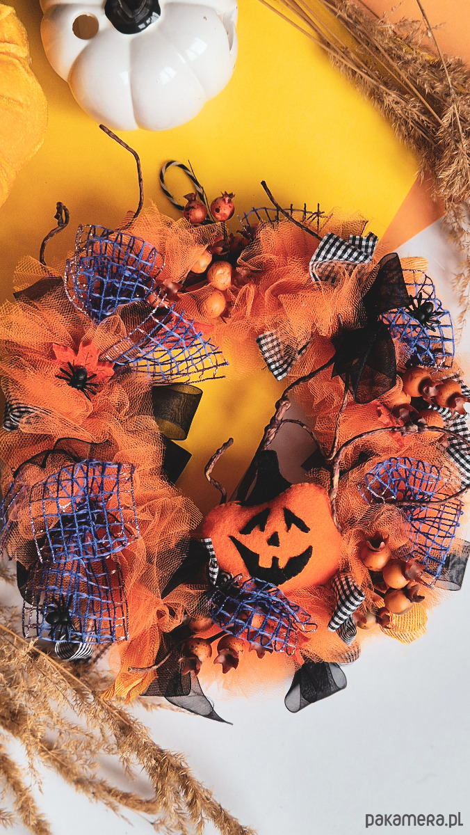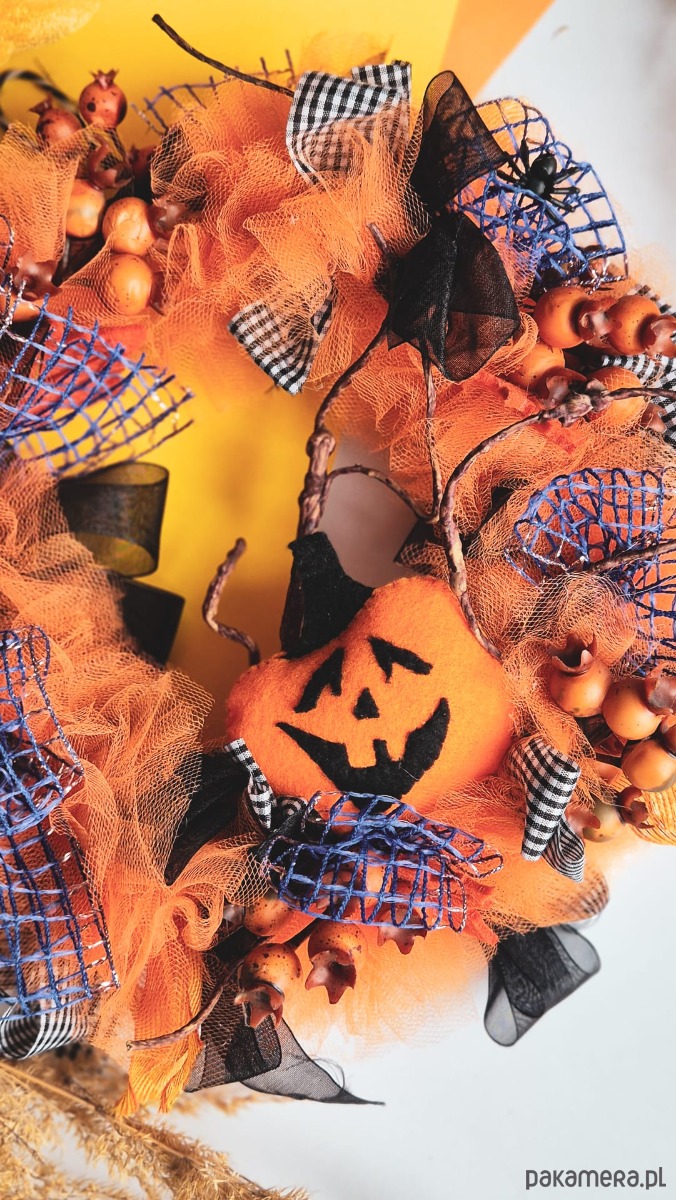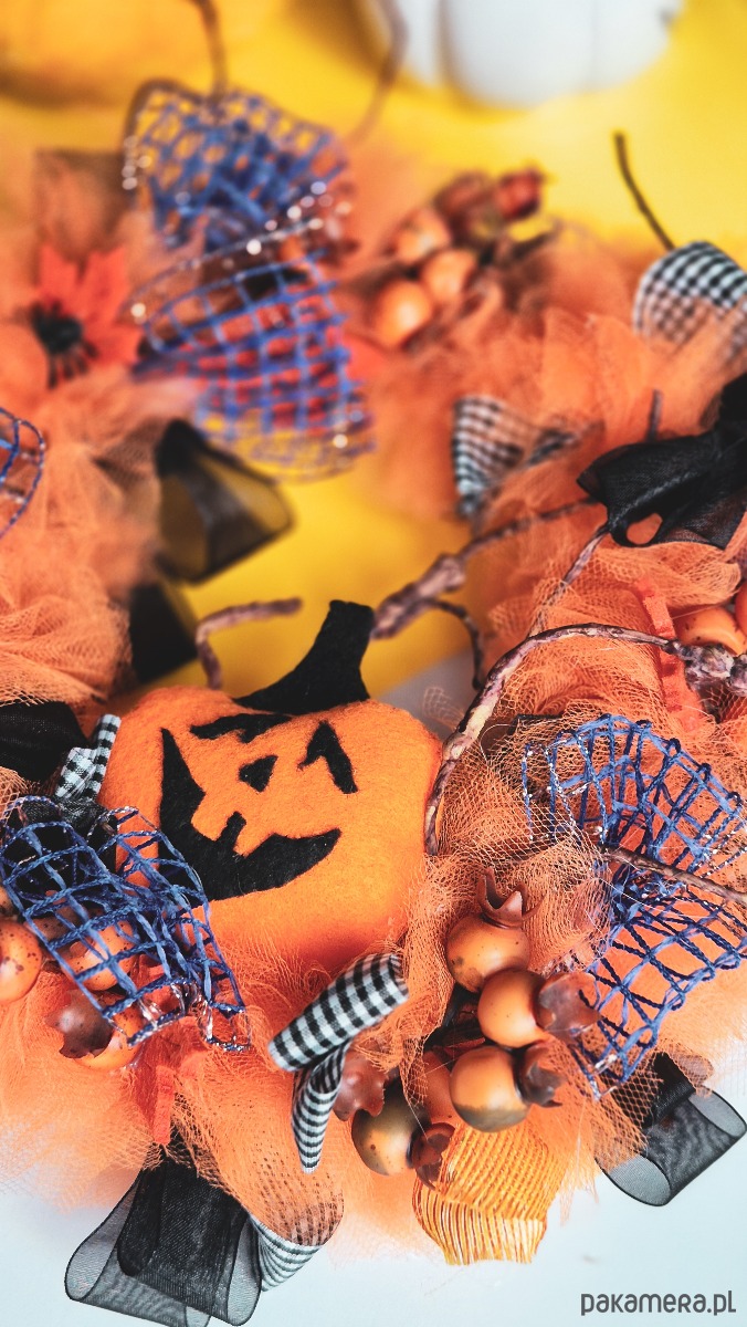 Piękny Halloweenowy wianek. Idealny jako dekoracja drzwi, ścian lub okien.