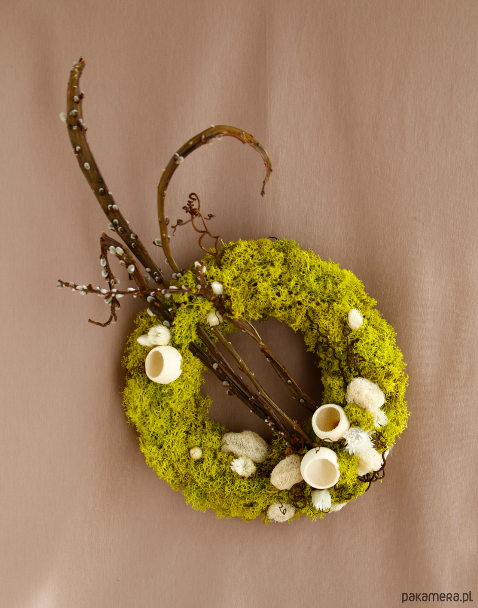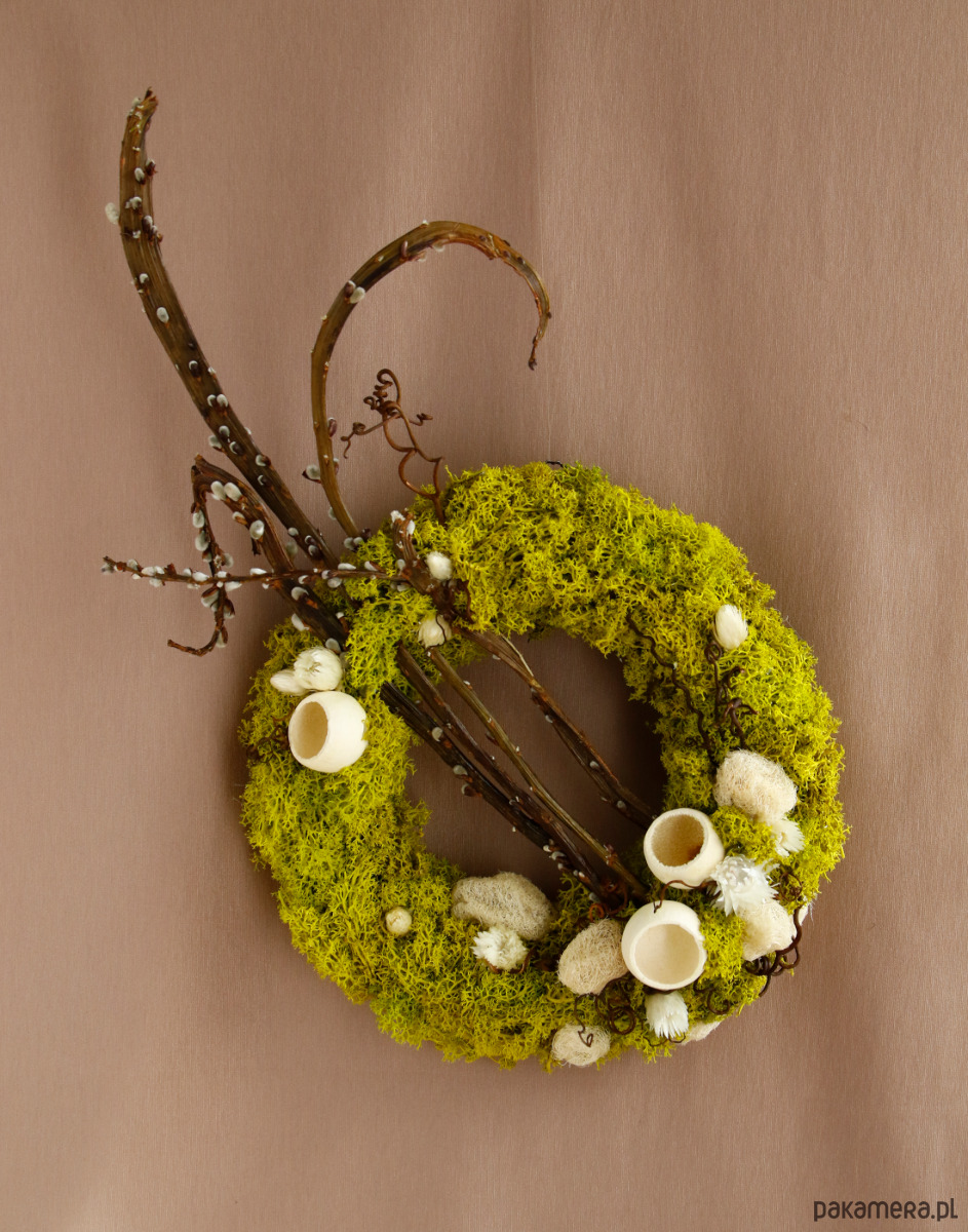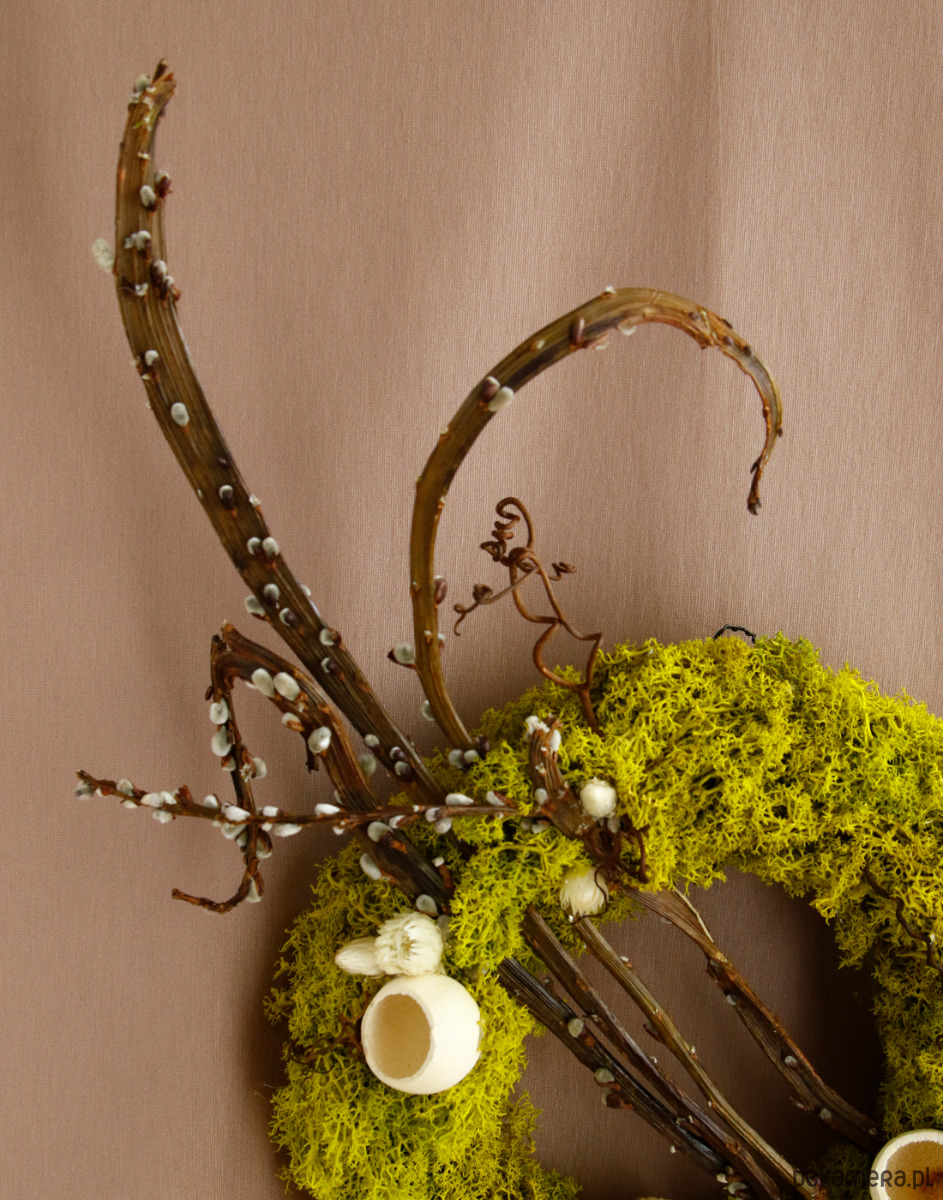 Niezwykłe, poskręcane gałęzie wierzby smoczej zachowały swój naturalny pokrój, dzięki odpowiedniej ekspozycji. Stabilizowany mech pięknie wypełnia korpus wianka i nadaje swym jasnym zielonym kolorem wiosenny klimat. Jasne dodatki suszonych roślin pięknie dopełniają kompozycję.