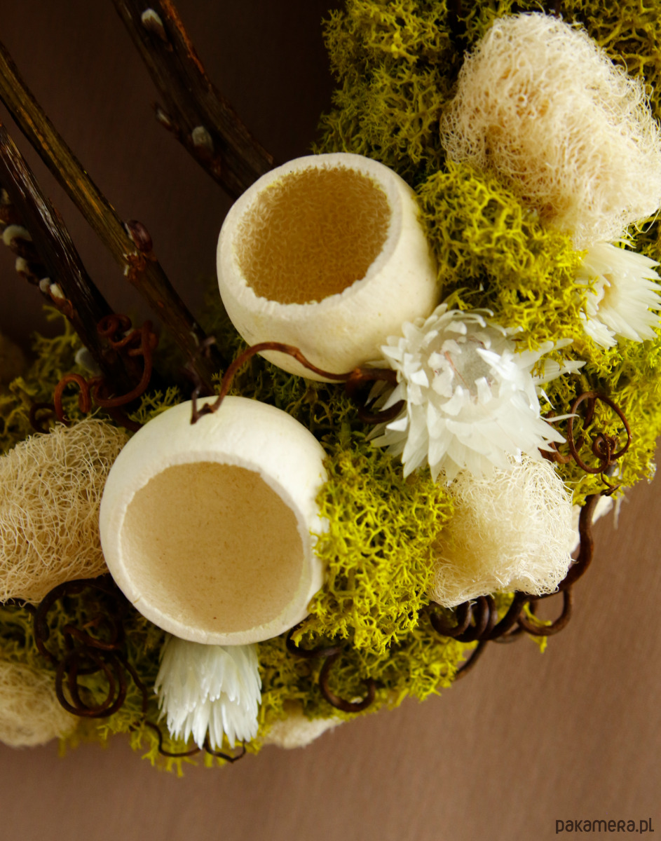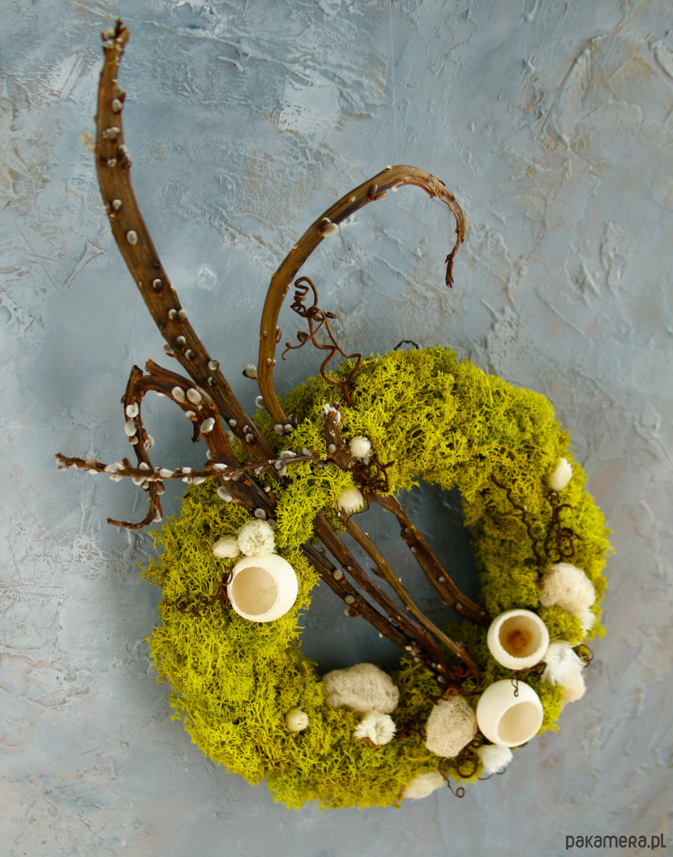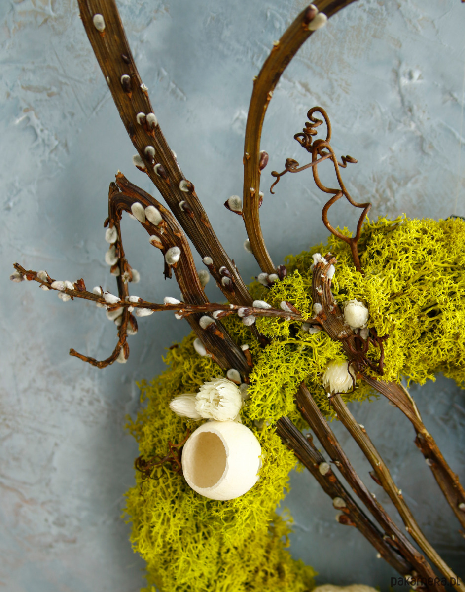 Niezwykłe, poskręcane gałęzie wierzby smoczej zachowały swój naturalny pokrój, dzięki odpowiedniej ekspozycji. Stabilizowany mech pięknie wypełnia korpus wianka i nadaje swym jasnym zielonym kolorem wiosenny klimat. Jasne dodatki suszonych roślin pięknie dopełniają kompozycję.
