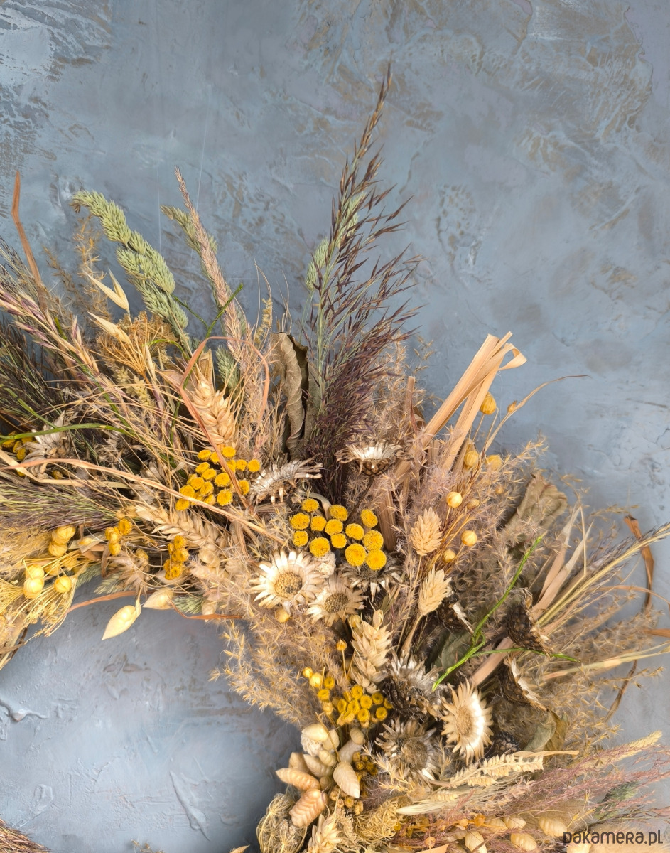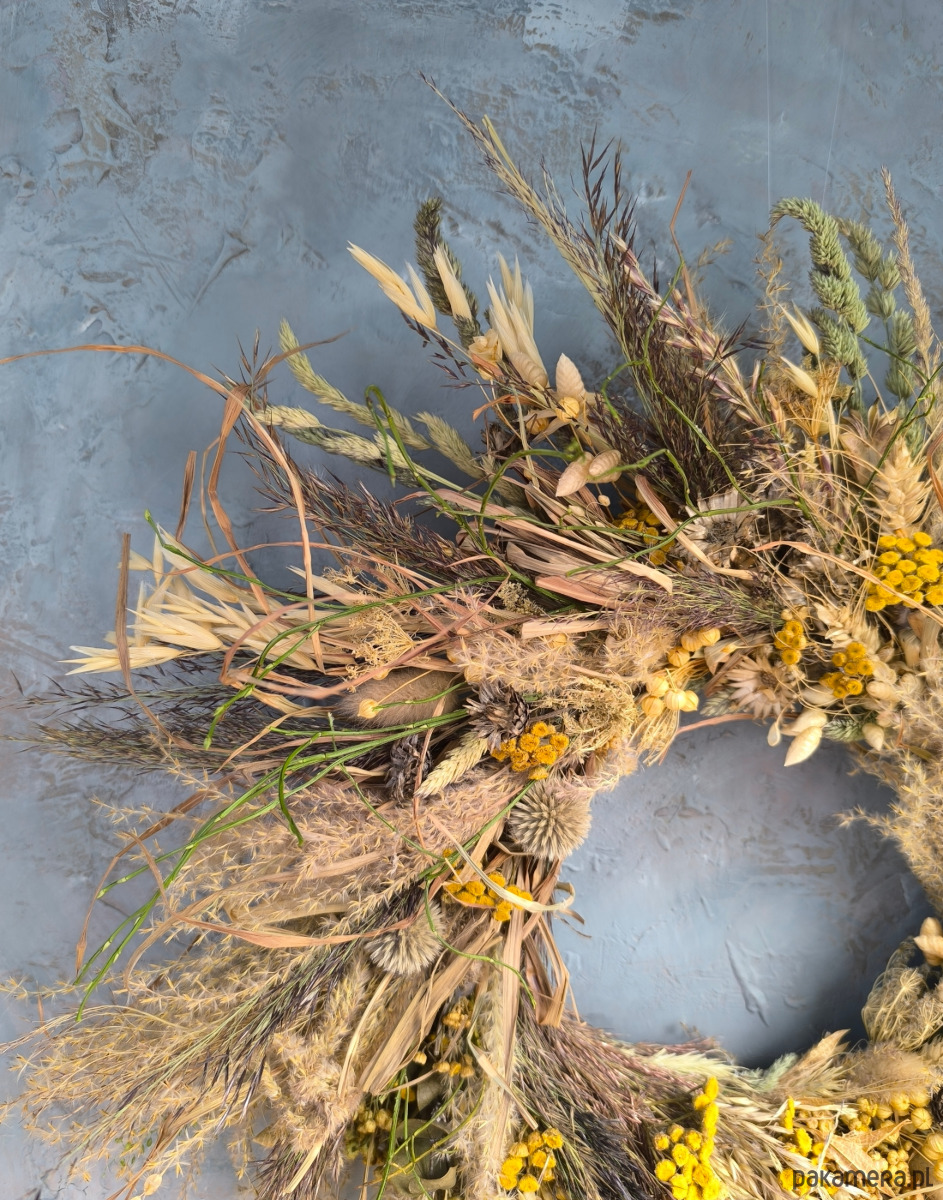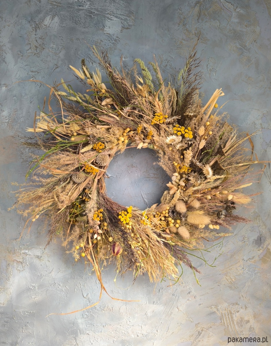 Dekoracja z suszonych roślin, ma romantyczny polny charakter. Zawiera dużo sianka, dojrzałych traw ozdobnych i roślin. Dla osób lubiących dekoracje o naturalistycznym charakterze. Zawiera piękne trawy polne i ozdobne- dmuszek, drżączkę, miskant, a także wrotycz, czarnuszkę, zboże.