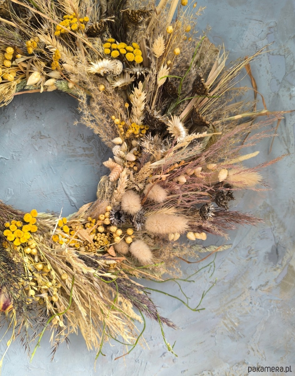 Wianek na drzwi lub ścianę. Jest to trwała dekoracja, utrwalony lakierem aby wzmocnić delikatne trawy.