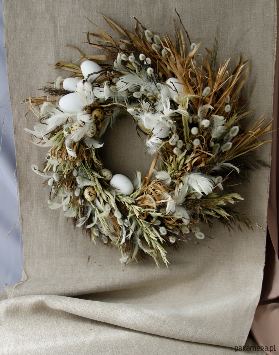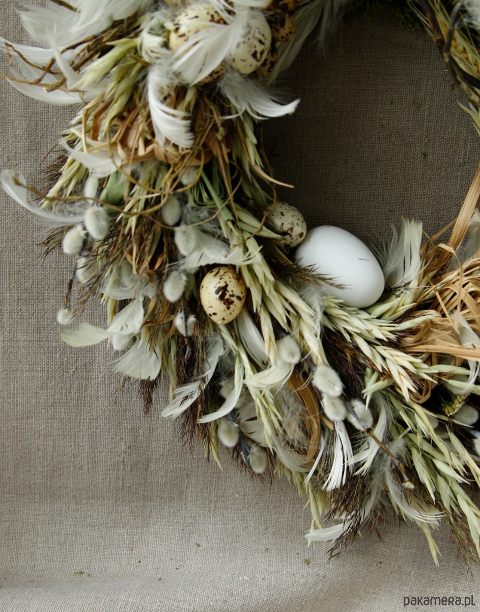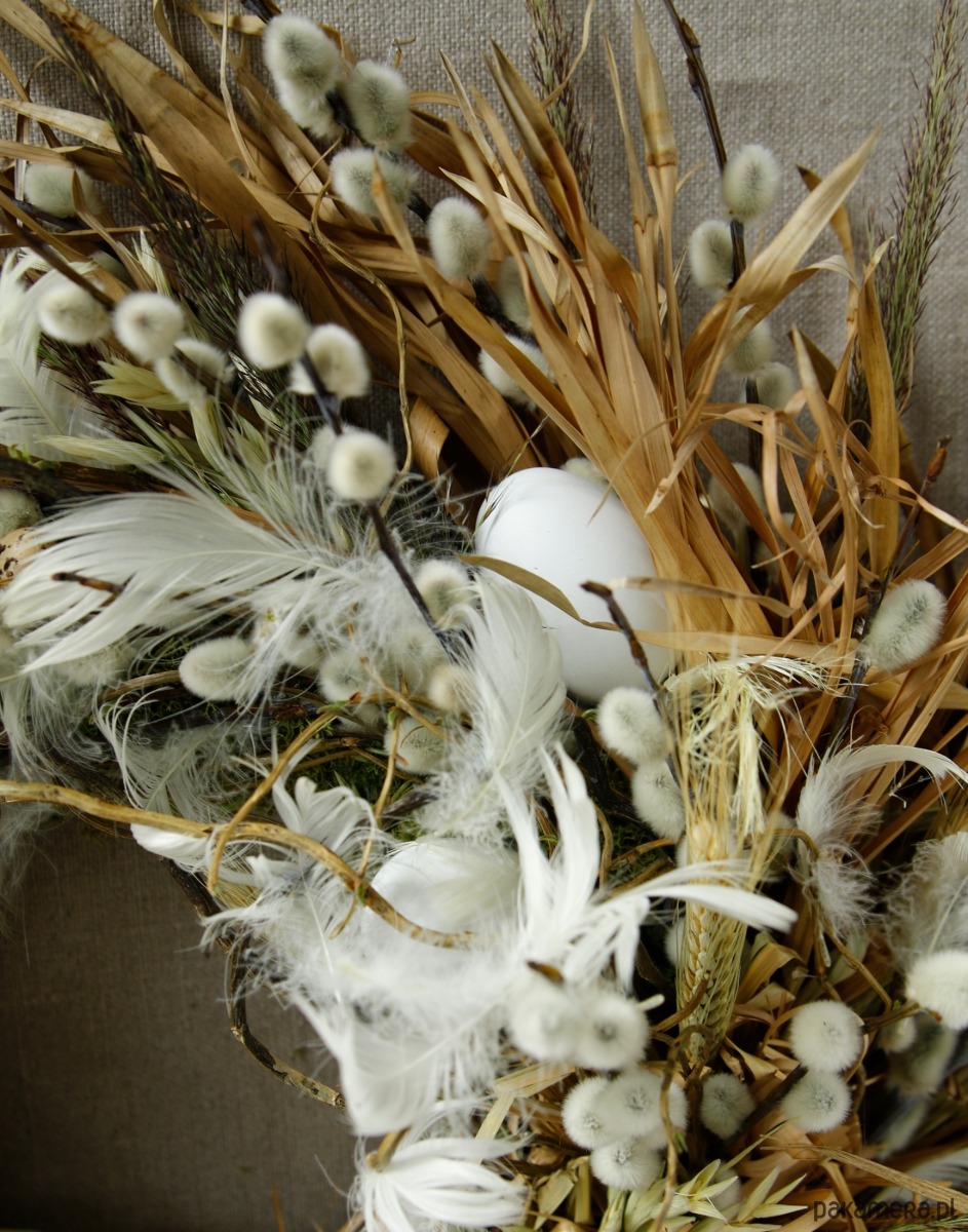 Zrobiony ręcznie z dużą dbałością o detale. Jest to oryginalna kompozycja, powstała w dużej części z naturalnych materiałów z dodatkiem dekoracji w postaci jajek i piórek które nadają wiosennego klimatu.