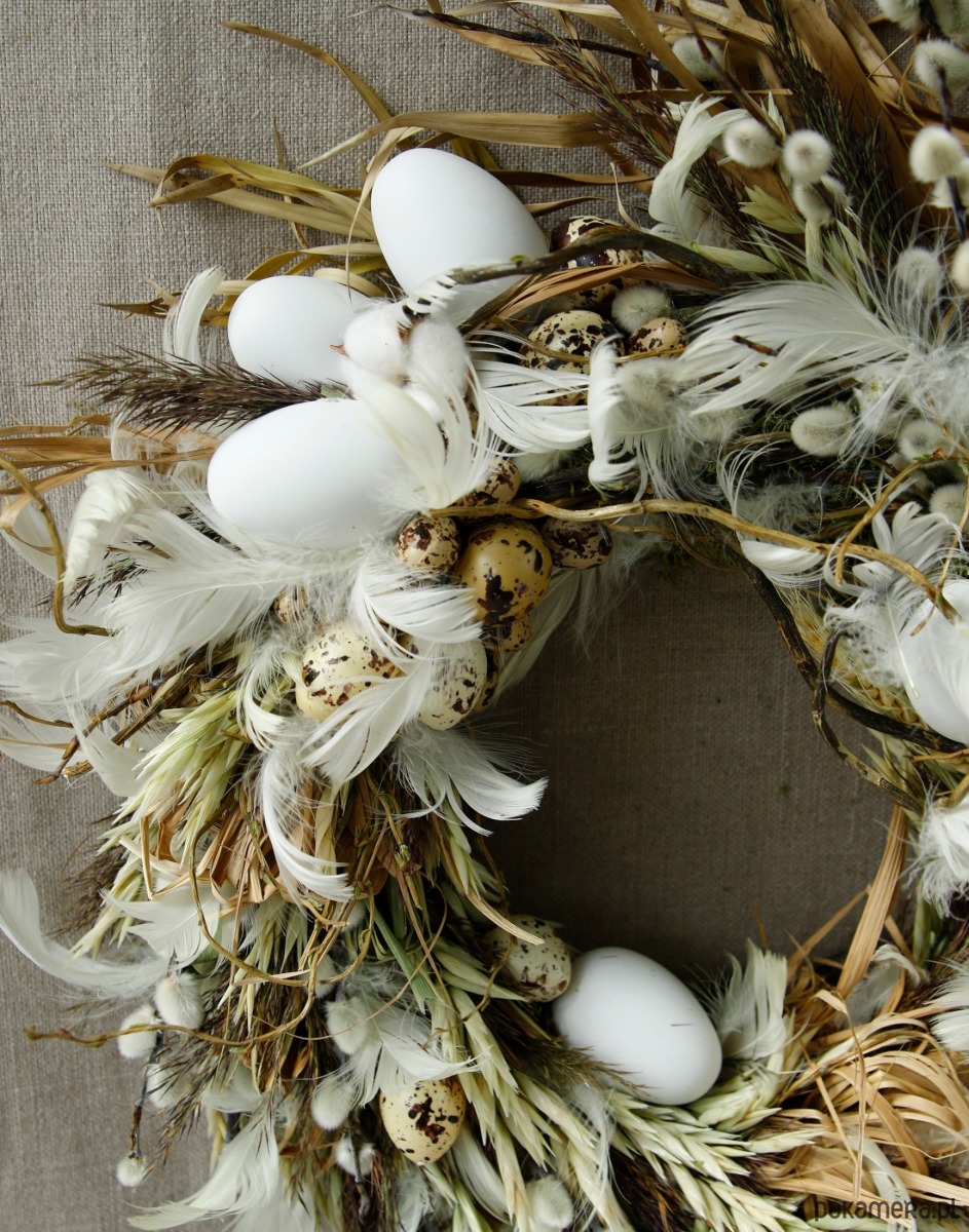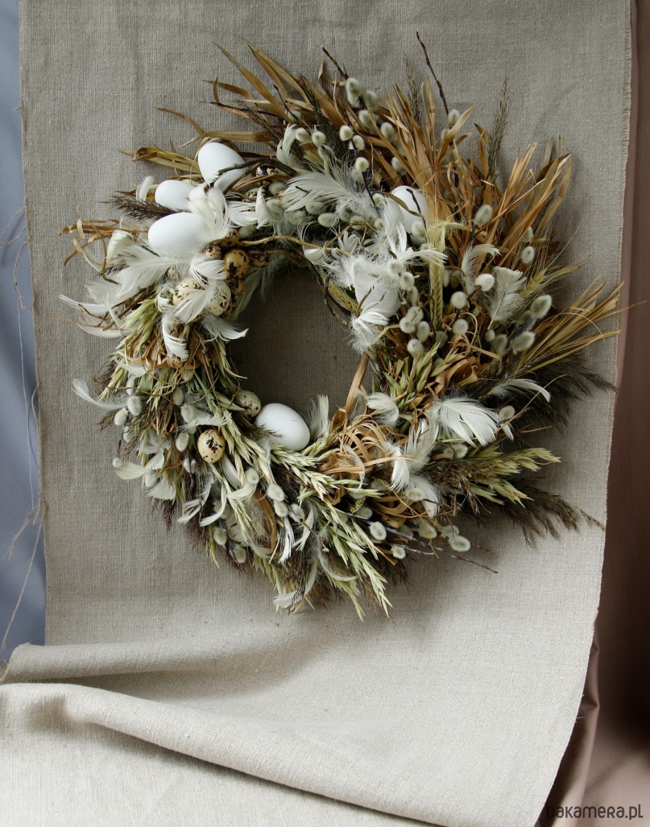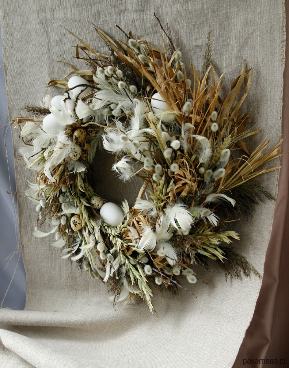Zrobiony ręcznie z dużą dbałością o detale. Jest to oryginalna kompozycja, powstała w dużej części z naturalnych materiałów z dodatkiem dekoracji w postaci jajek i piórek które nadają wiosennego klimatu.