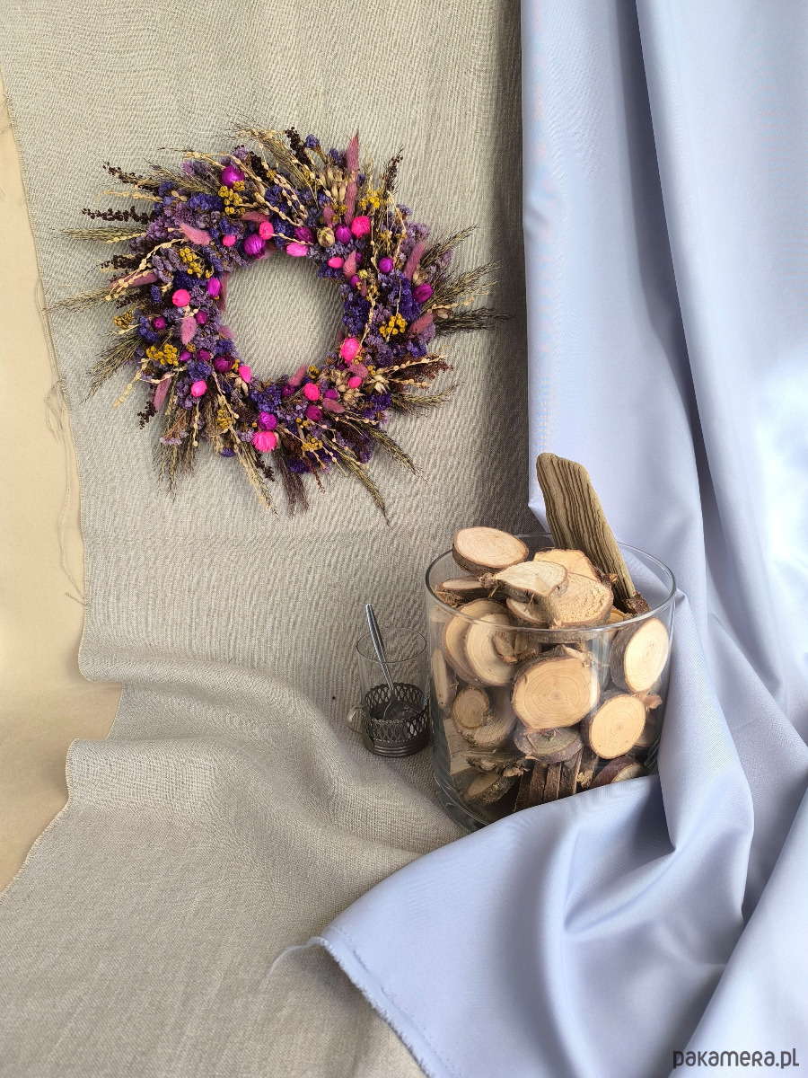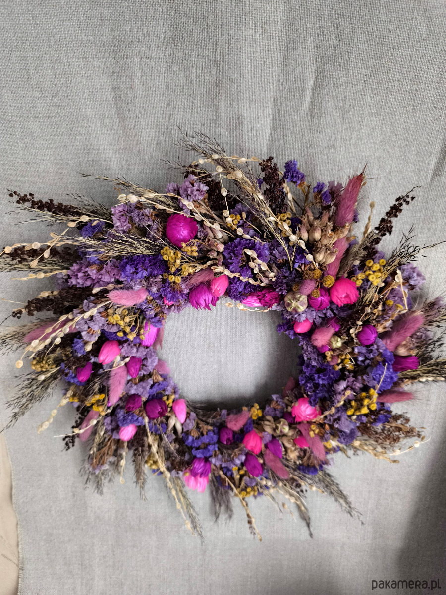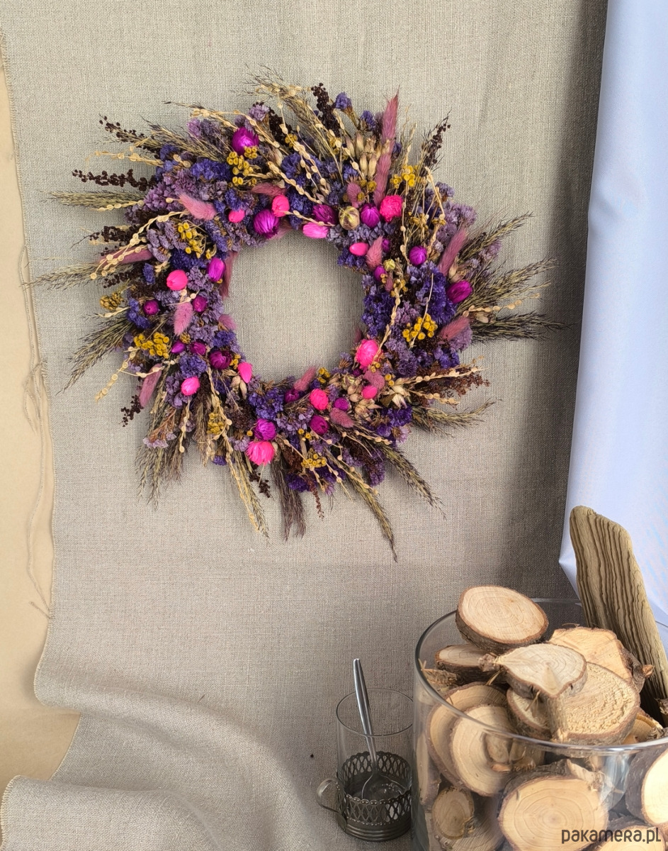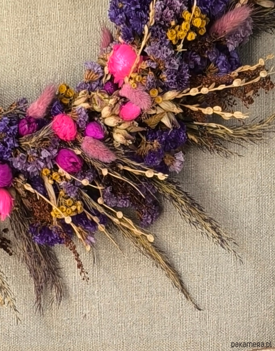 Dekoracja jest zrobione ręcznie z troską o detale. Zawiera piękne suszone rośliny i kwiaty takie jak: zatrwian, dmuszek, trzcina, wrotycz,lepidium, capblumen. Kolorystyka jest mocna i kontrastowa, żółty wrotycz ładnie komponuje się z odcieniami różu i fioletu pozostałych roślin.