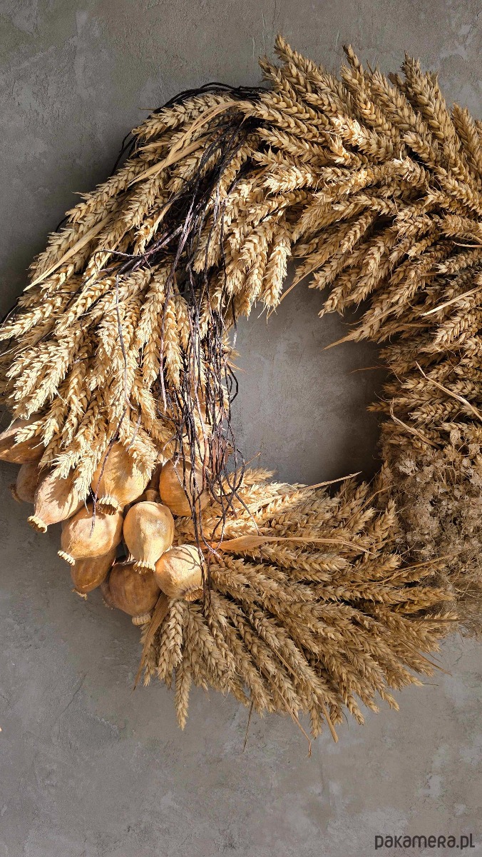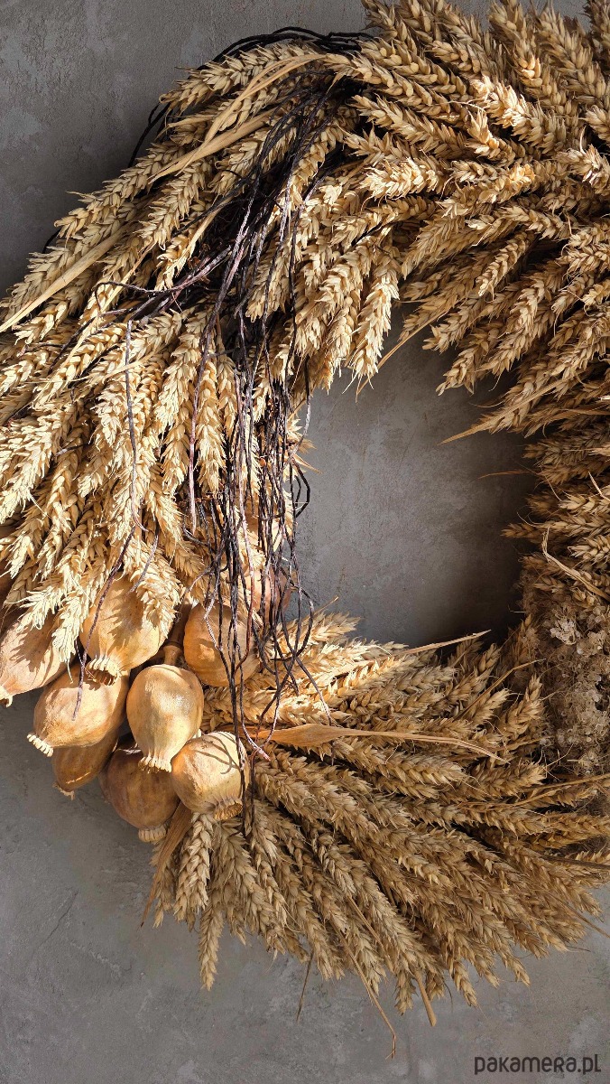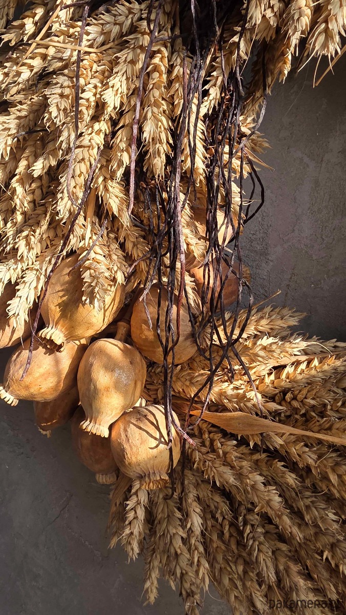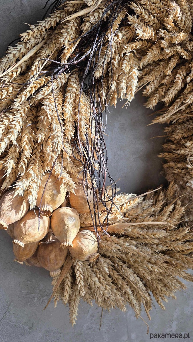 Naturalny wianek wykonany ręcznie z suszonych zbóż, kwiatów, prawdziwych makówek. Kompozycja oparta wyłącznie na naturalnych materiałach zachwyca autentycznością, strukturą i ciepłą, rustykalną kolorystyką.