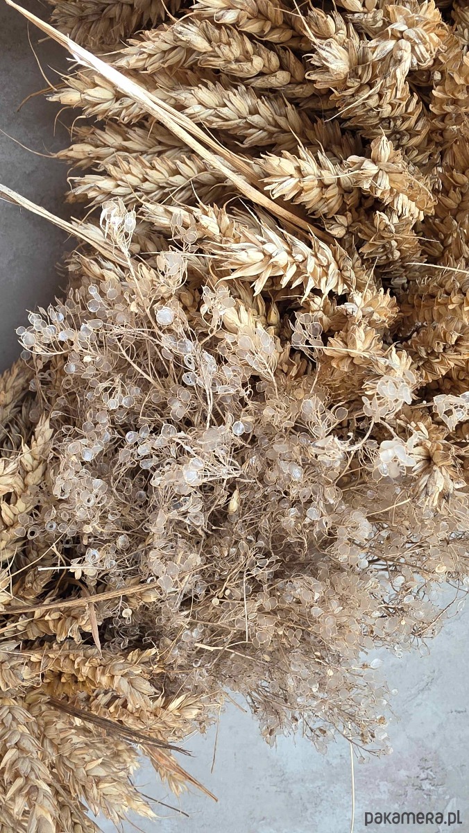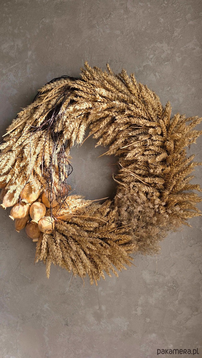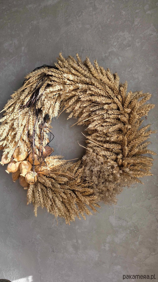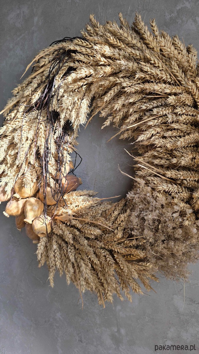 Naturalny wianek wykonany ręcznie z suszonych zbóż, kwiatów, prawdziwych makówek. Kompozycja oparta wyłącznie na naturalnych materiałach zachwyca autentycznością, strukturą i ciepłą, rustykalną kolorystyką.