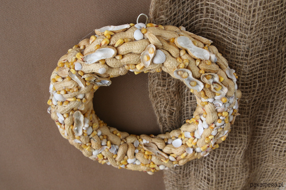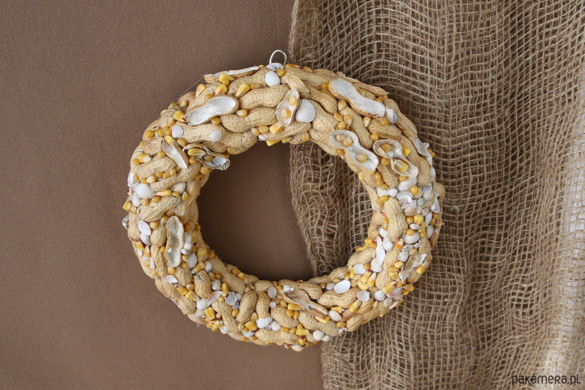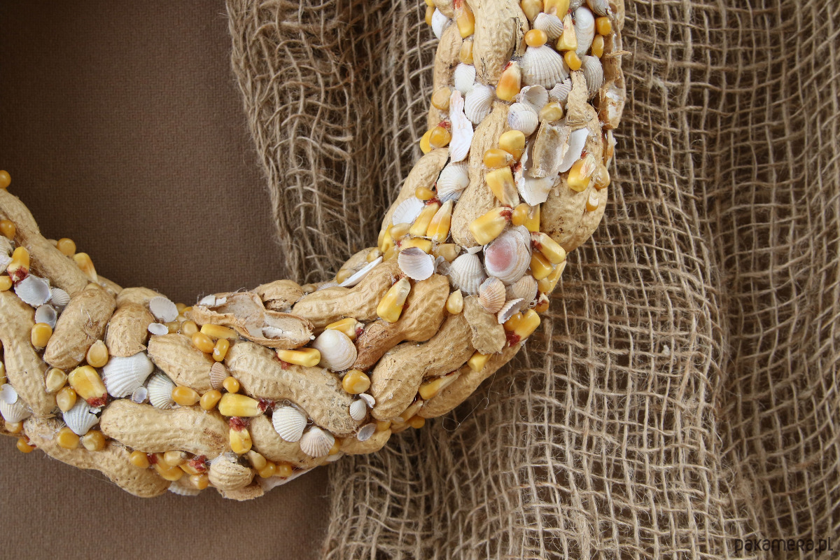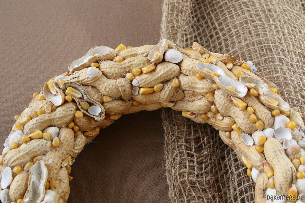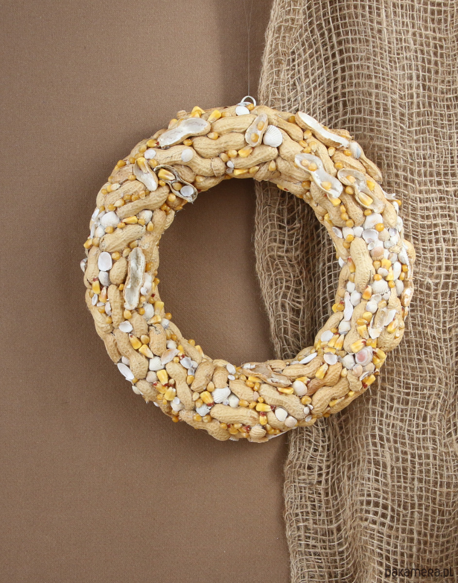 Wianek dekoracyjny ,,Orzechowa plaża". Naturalna dekoracja na ścianę, idealna na oryginalny prezent, do wystroju wnętrz. Powstał z naturalnych muszelek, orzeszków fistaszkowych w kolorze plażowego piasku i złotych kuleczek kukurydzy przywodzących