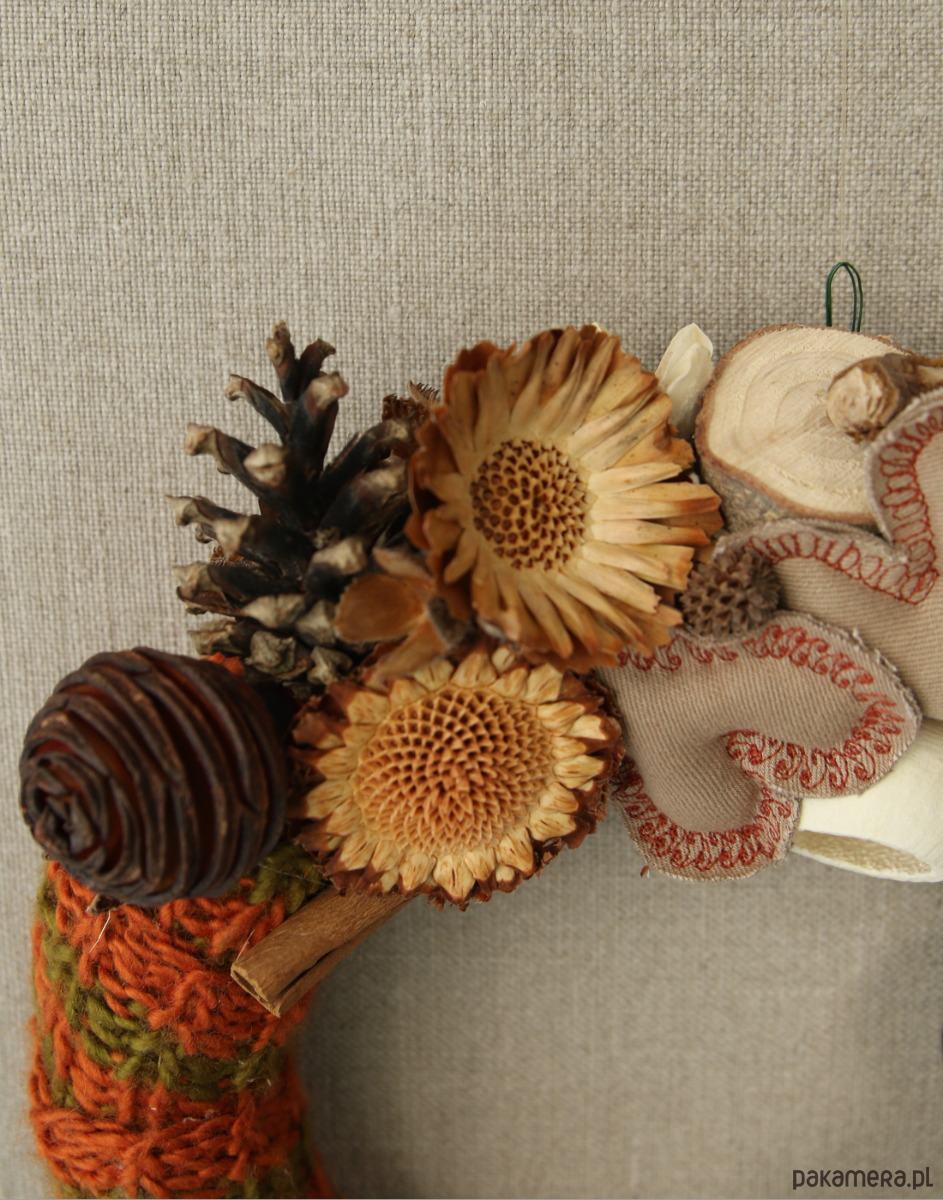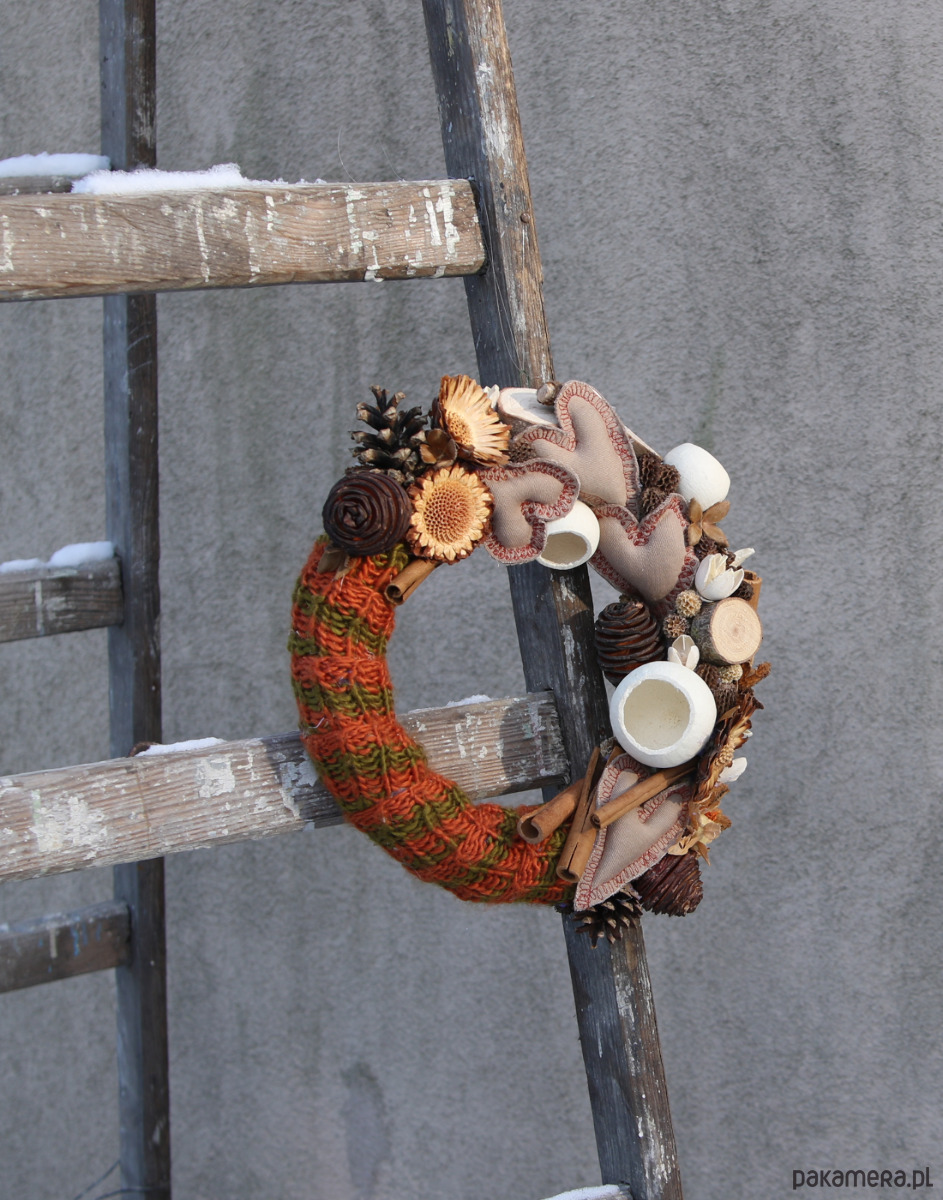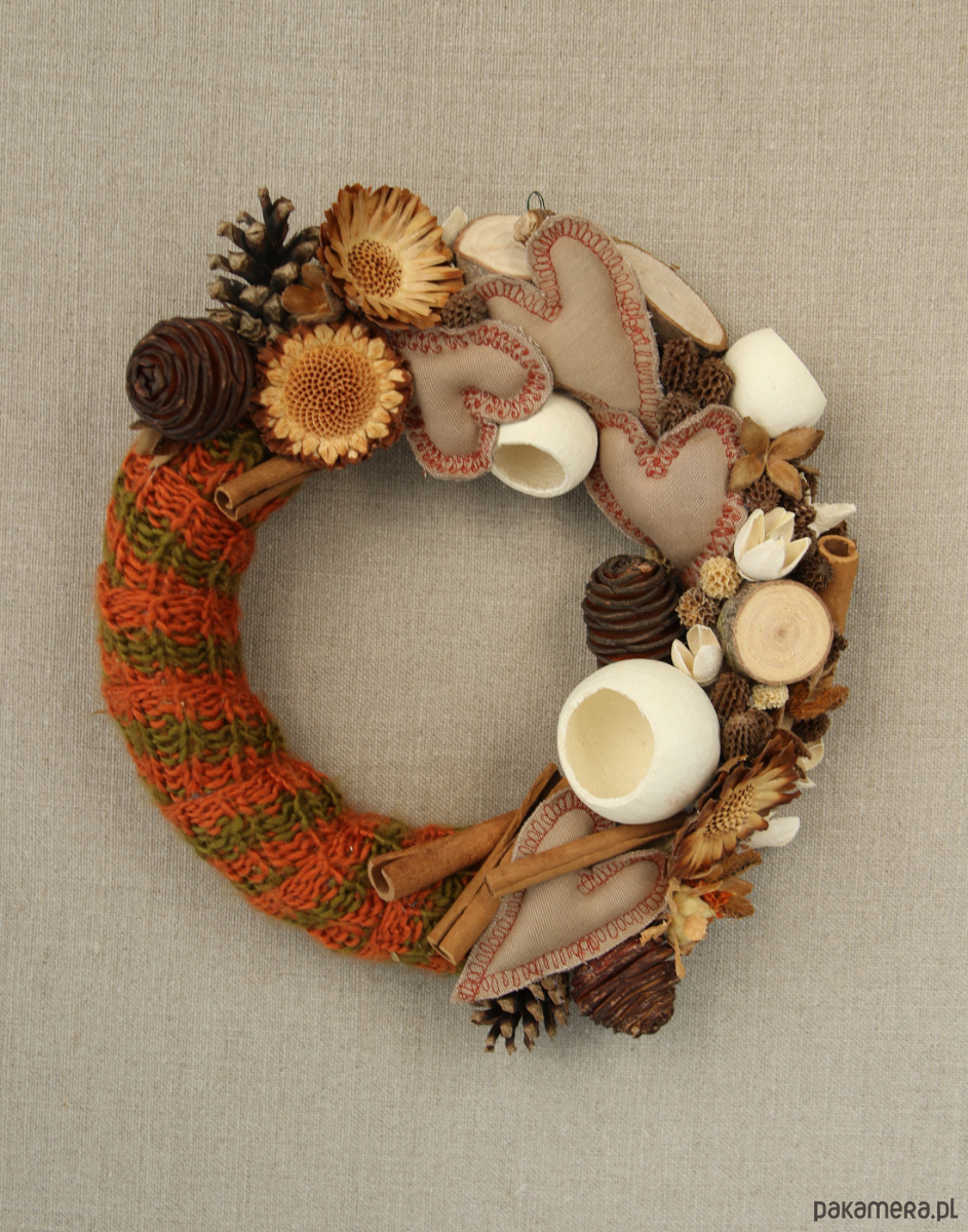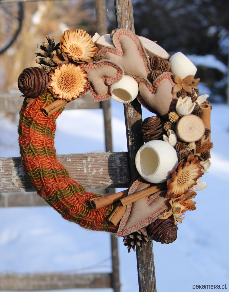 Wianek powstał na podkładzie słomianym. Jest trwały, może być ozdobą na drzwi lub nad kominek.