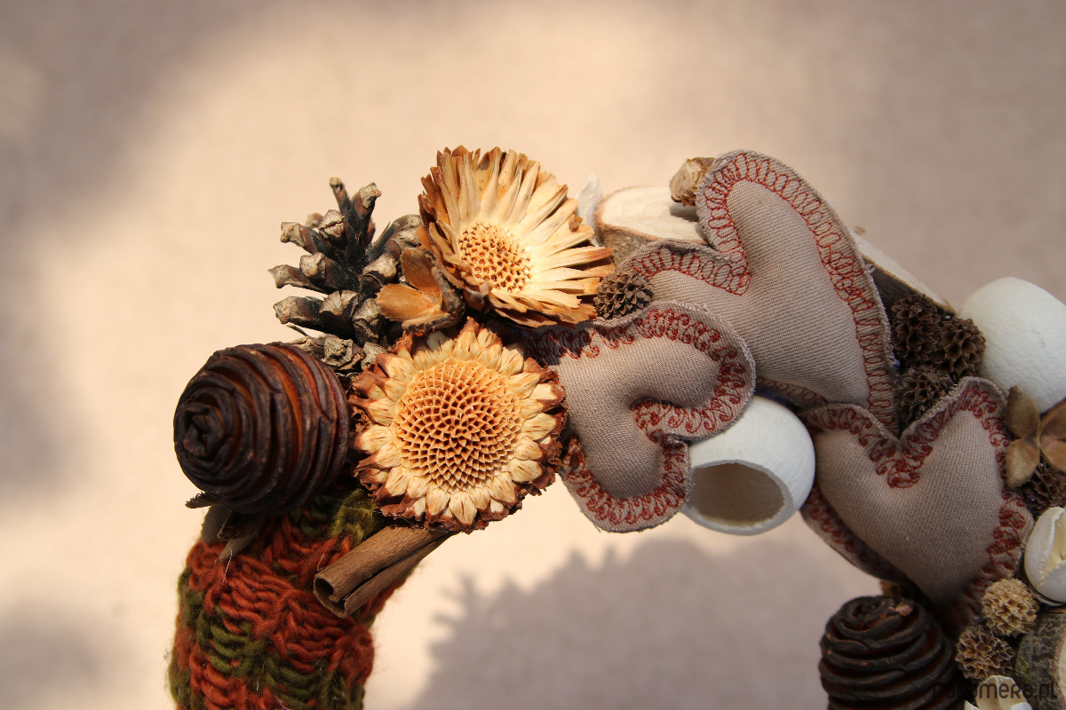 Wianek dekoracyjny z suszonymi roślinami i serduszkami. Dekoracja na ścianę znakomicie nadaje się na prezent na Walentynki lub bez okazji dla bliskiej osoby. Zawiera ciekawe gatunki suszu egzotycznego, uszyte w pracowni serduszka i zrobioną ręcznie na drutach tkaninę w kolorze marchewki z groszkiem.