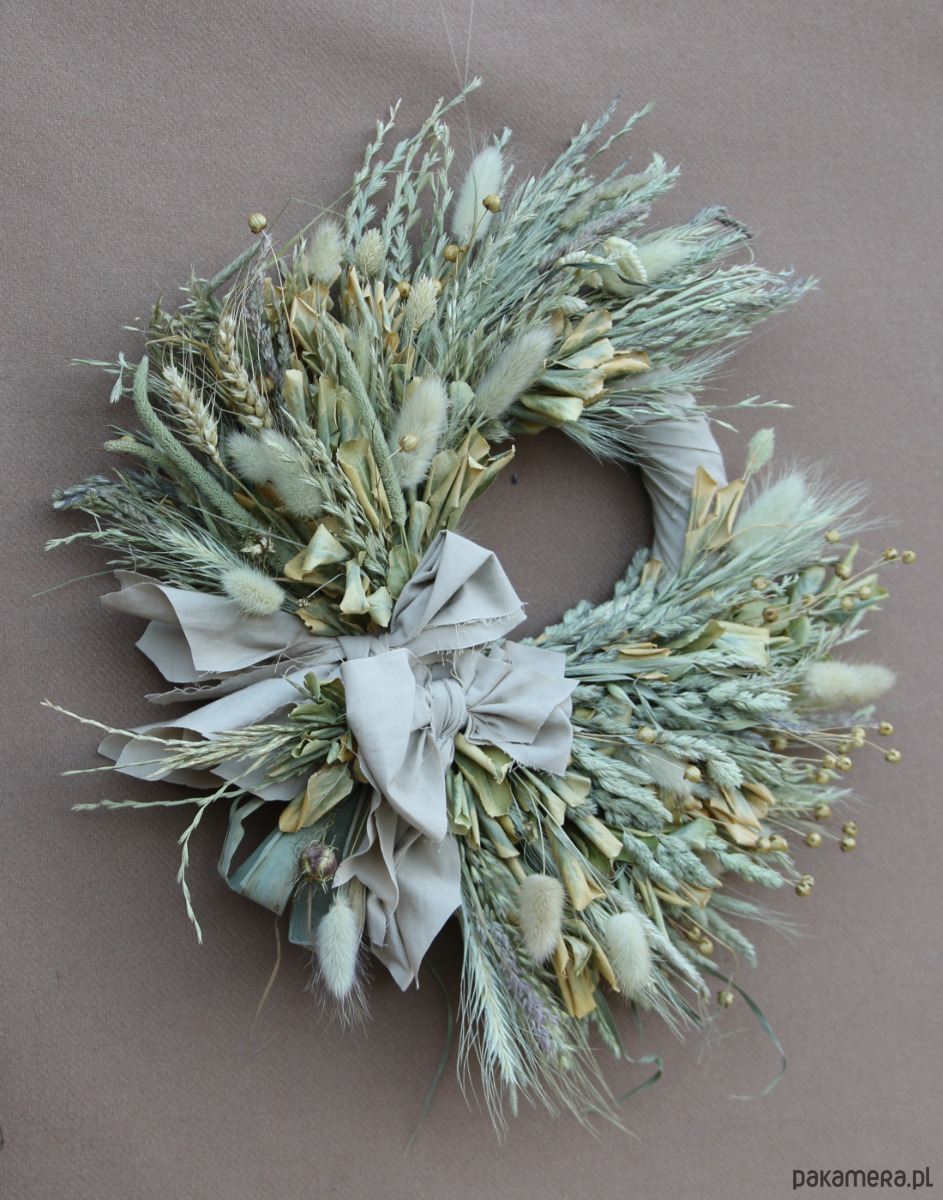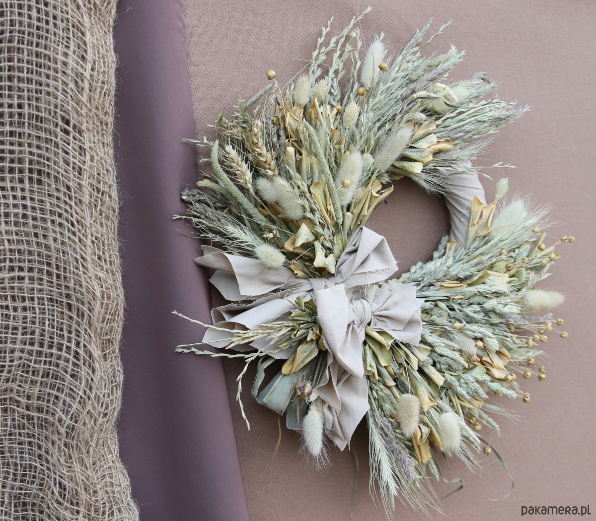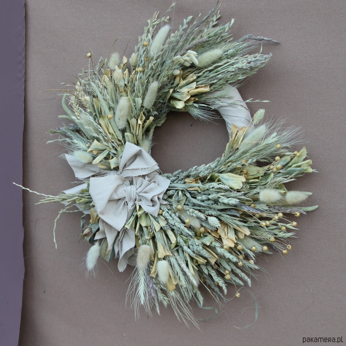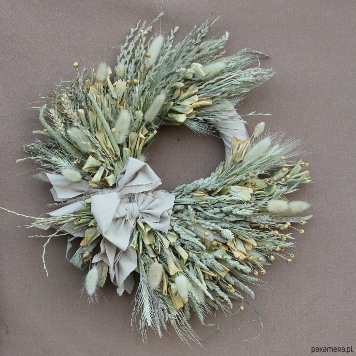 Wianek dekoracyjny ,,W szumie traw". Jest to dekoracja w stylu rustykalnym z suszonych traw, zbóż i liści. Dla wszystkich którzy kochają klimat letniej łąki i polne krajobrazy. Posiada ozdobę w formie postrzępionej, bawełnianej, organicznej kokardy.