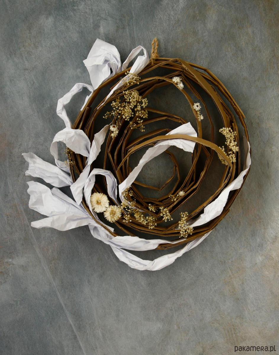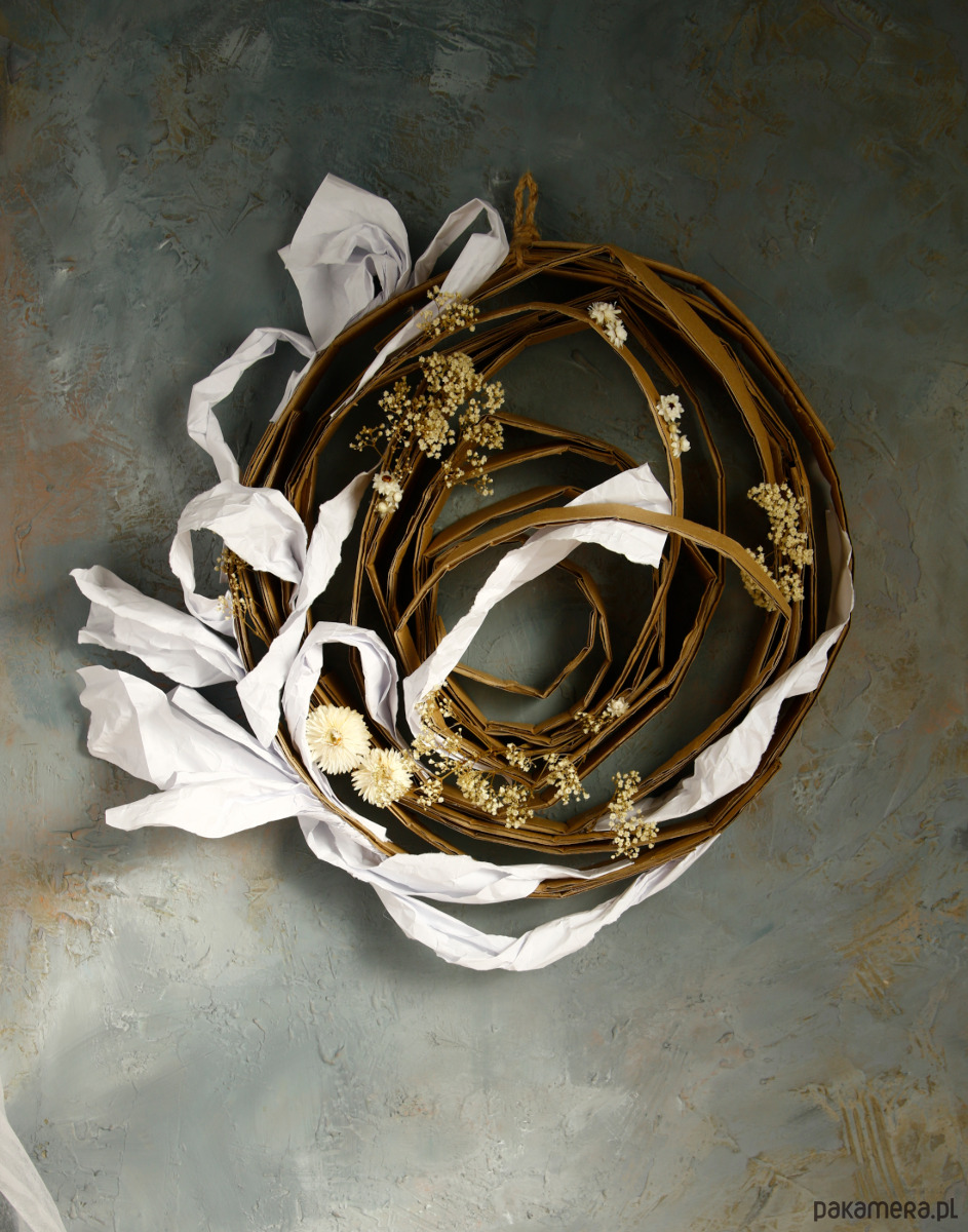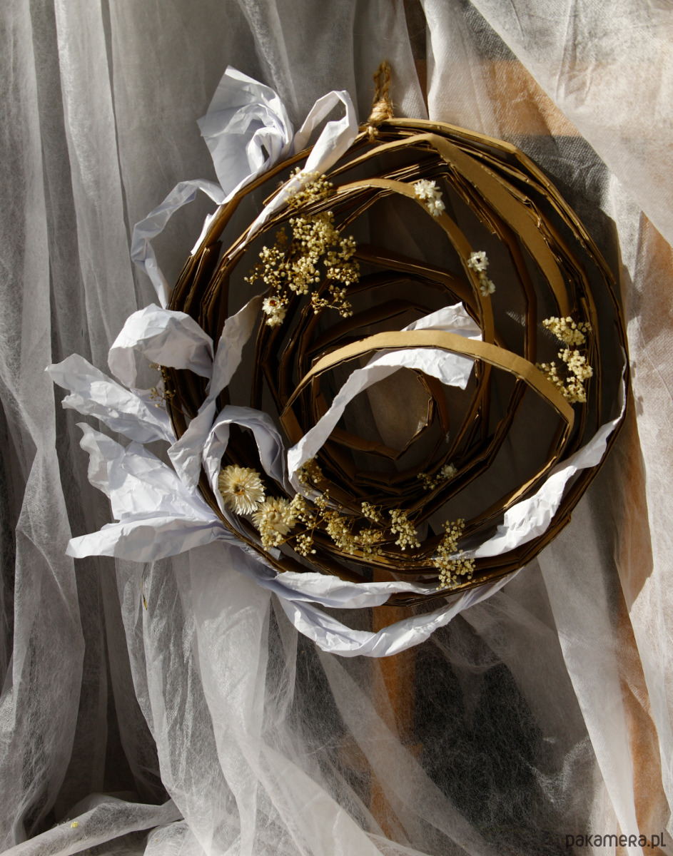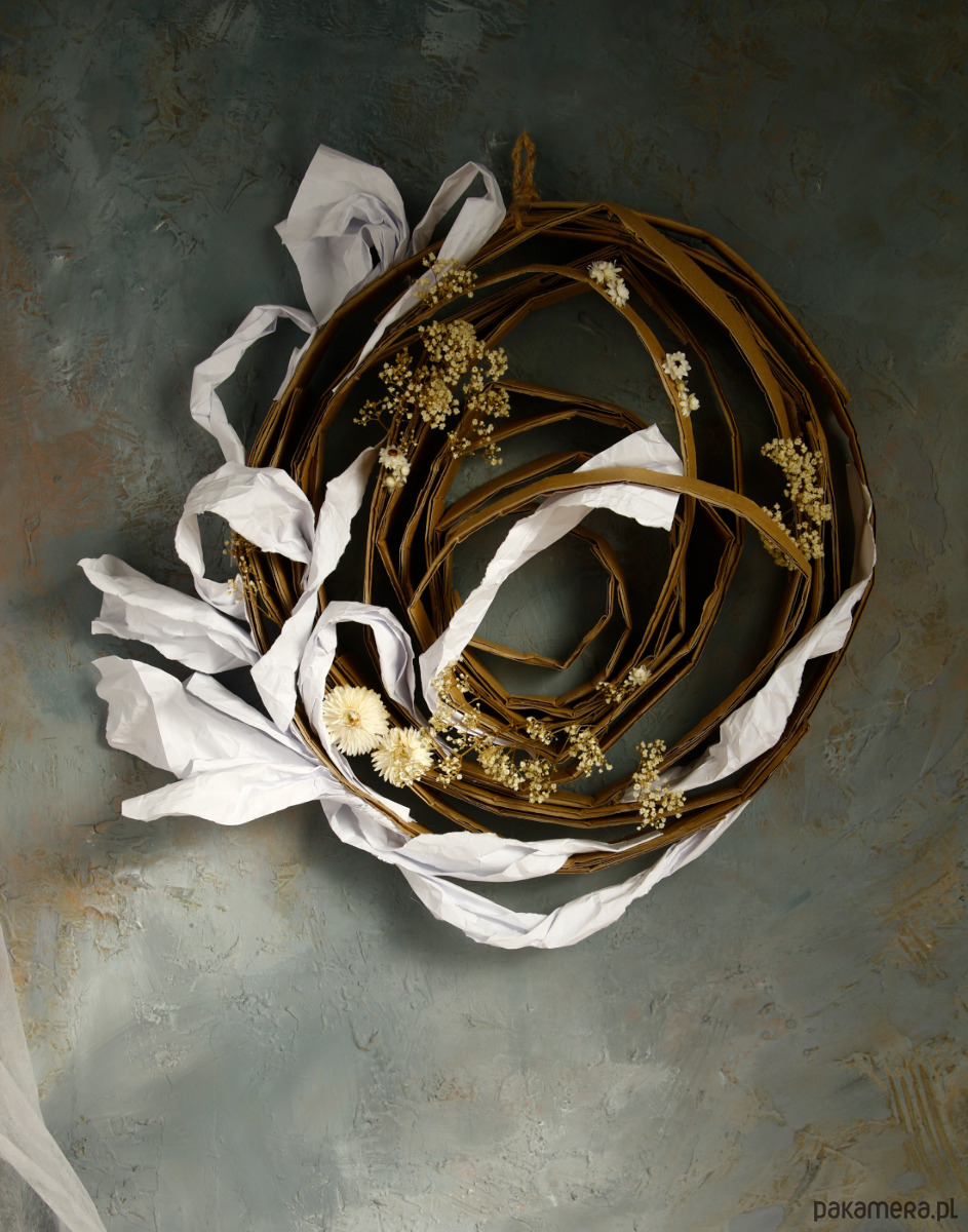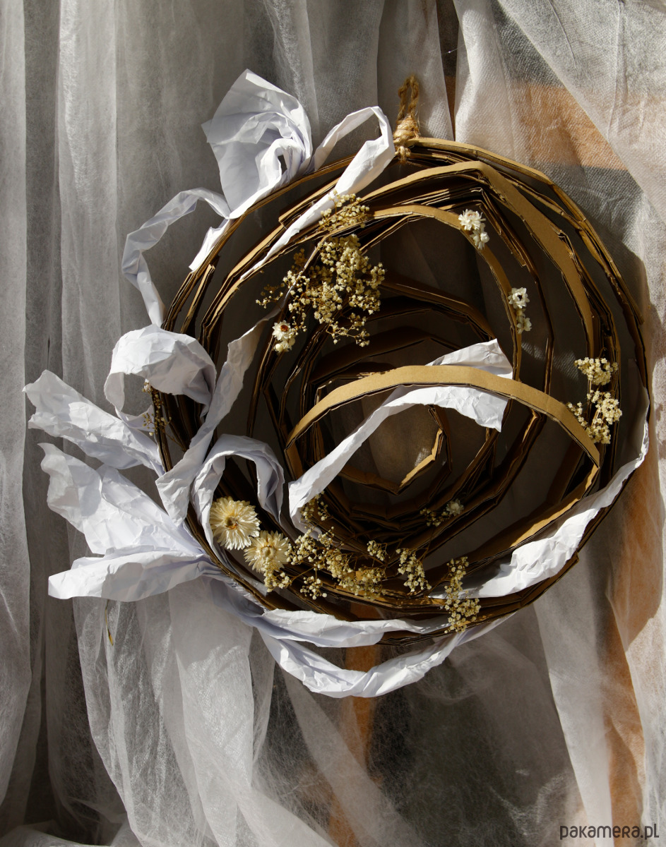 Ręcznie zrobiony podkład, konstrukcja tekturowa i papierowa, ekspresyjna w wyrazie.
