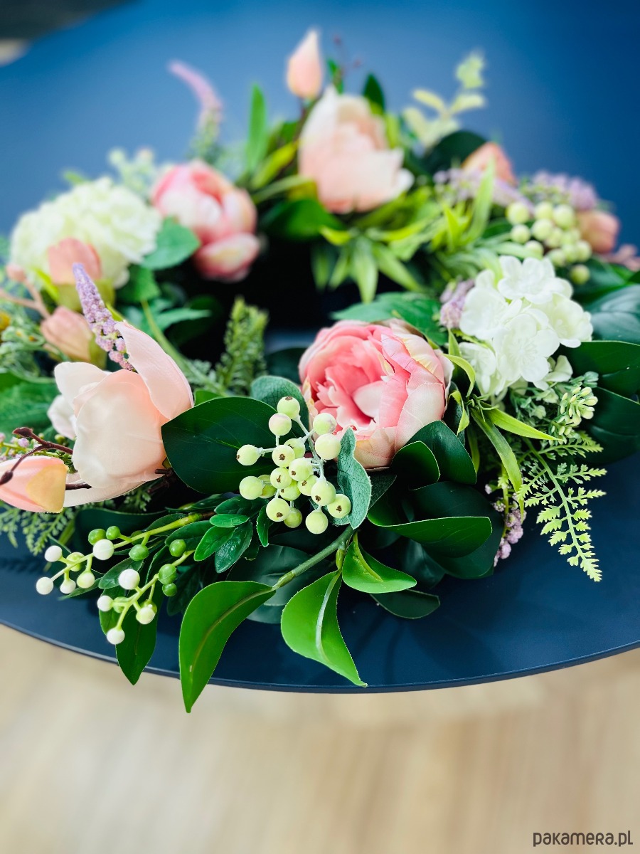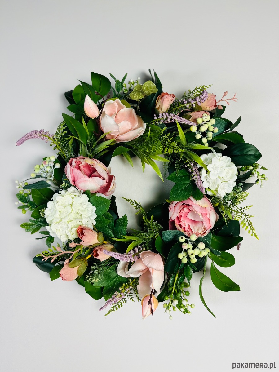 Dekoracyjny wieniec ze sztucznych kwiatów i liści. Idealnie sprawdzi się jako ozdoba drzwi wejściowych, ściany lub stołu.