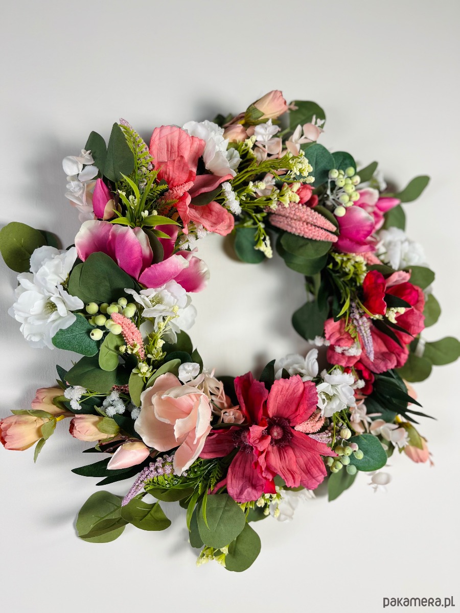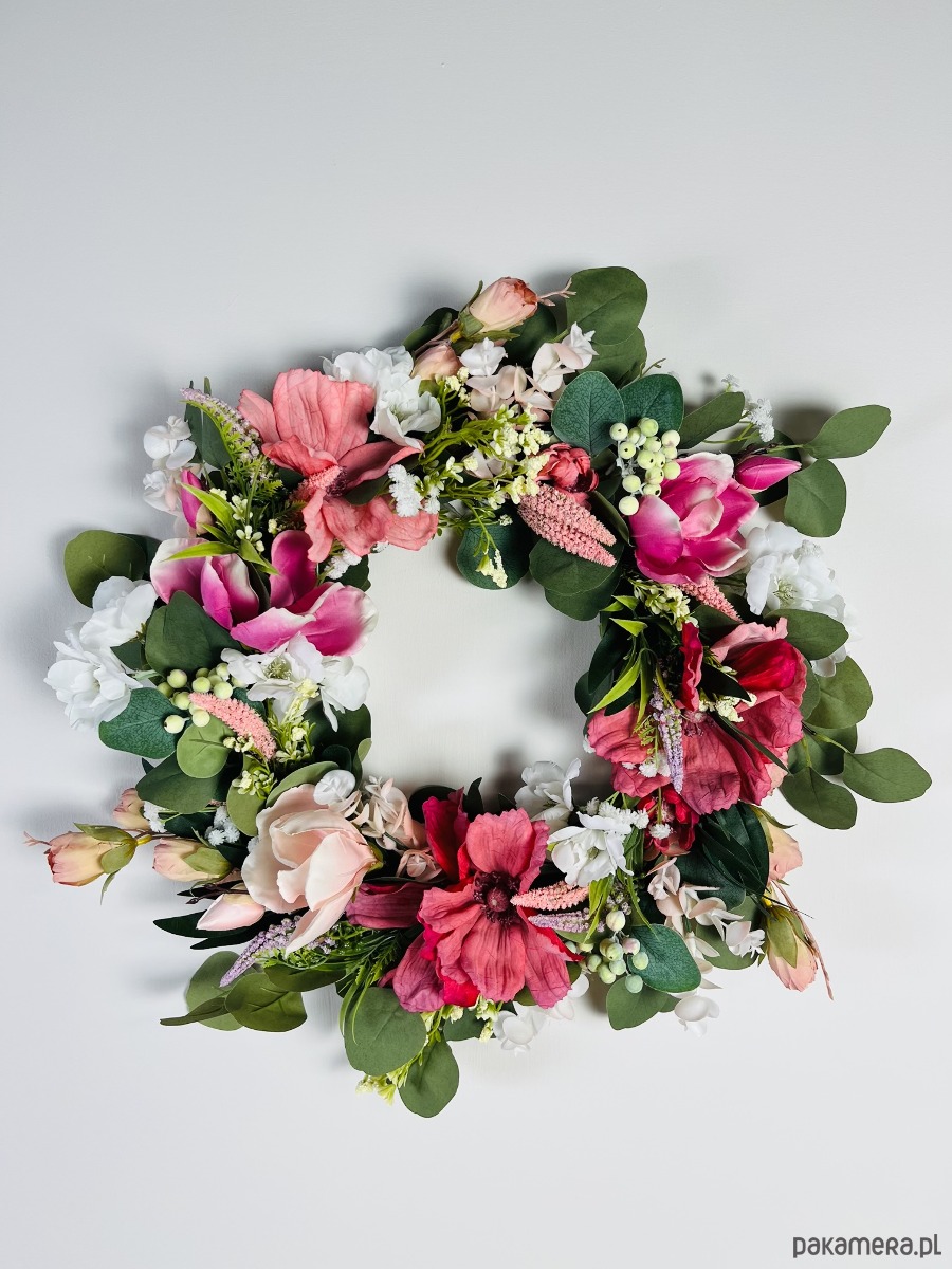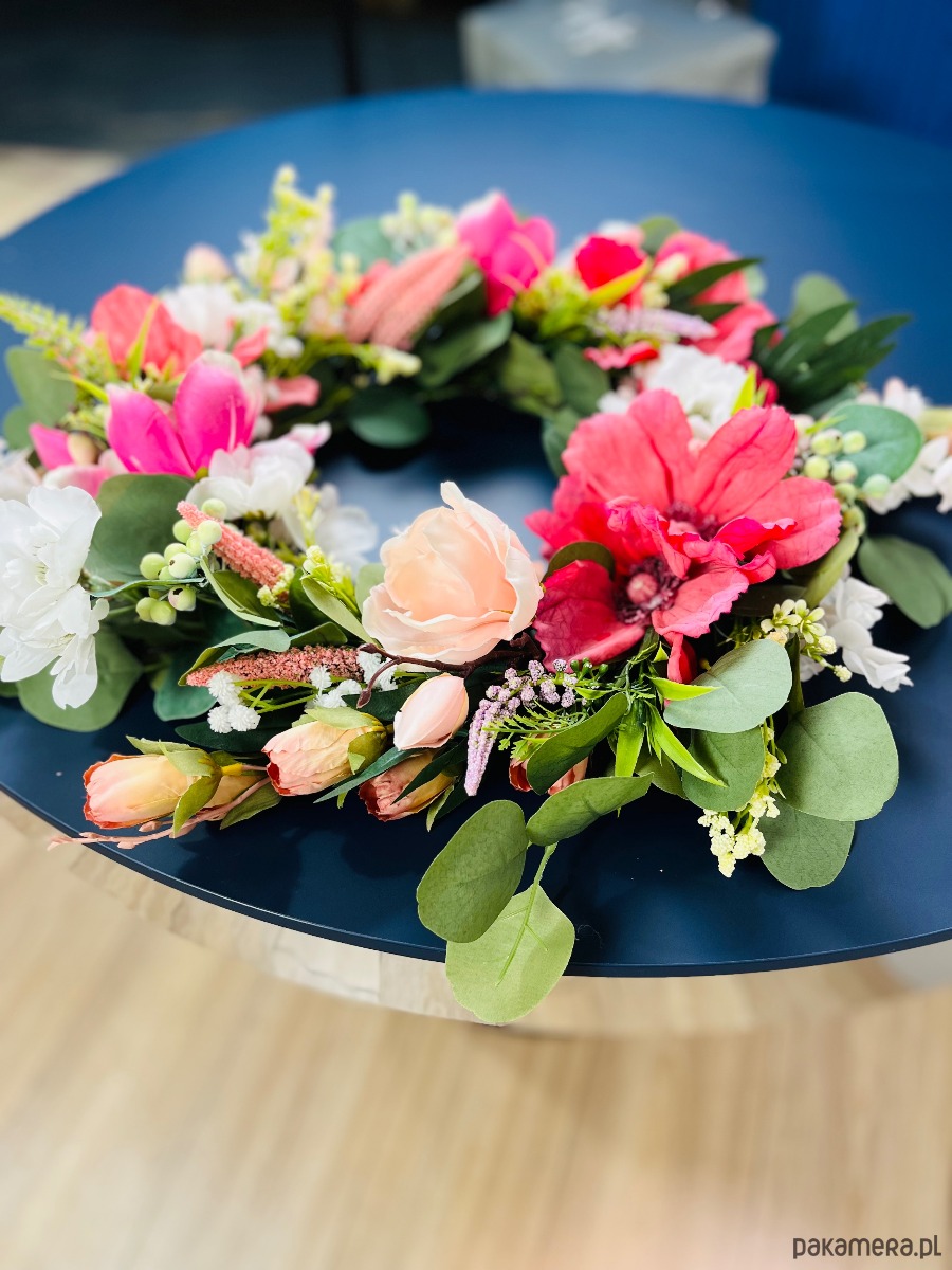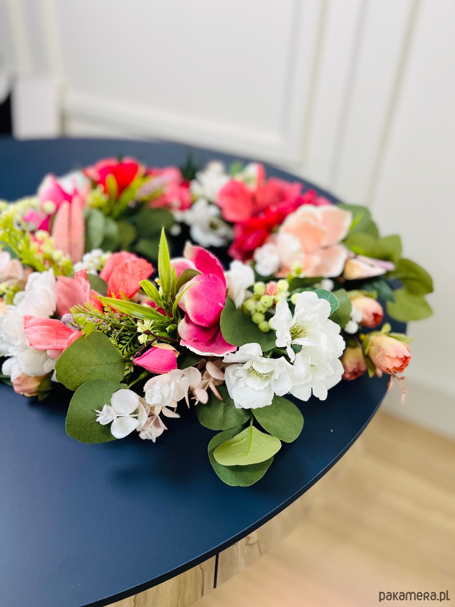Dekoracyjny wieniec ze sztucznych kwiatów i liści. Idealnie sprawdzi się jako ozdoba drzwi wejściowych, ściany lub stołu.