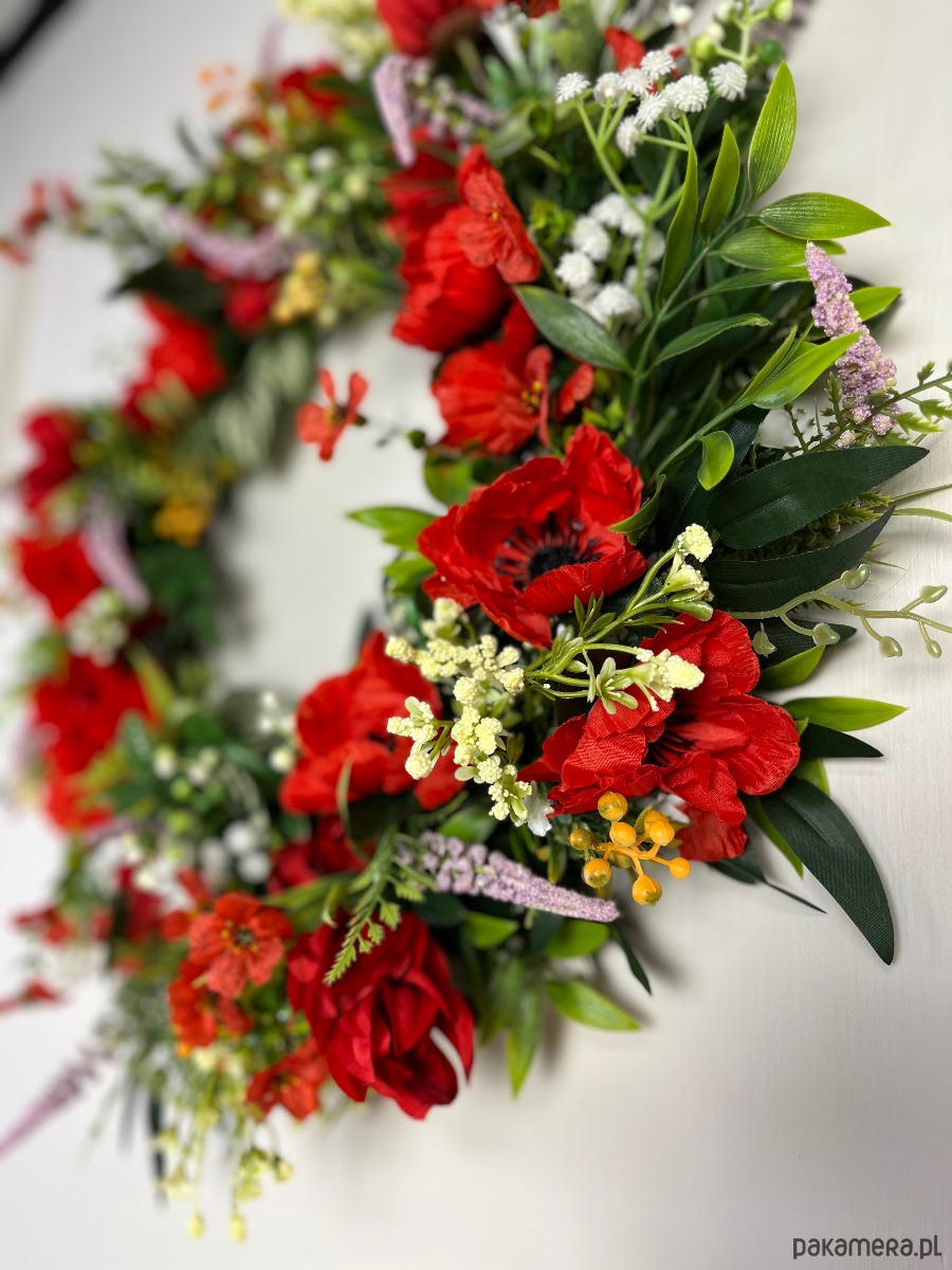Wieniec dekoracyjny jest w tonacji czerwieni.