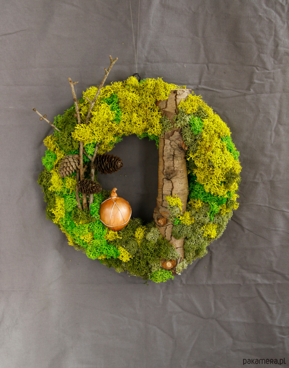 Wianek dekoracyjny, szrekowy, na drzwi lub ścianę. Zrobiony z mchu stabilizowanego, drewna i cebuli. Tworzy wiosenno- letni leśny klimat.