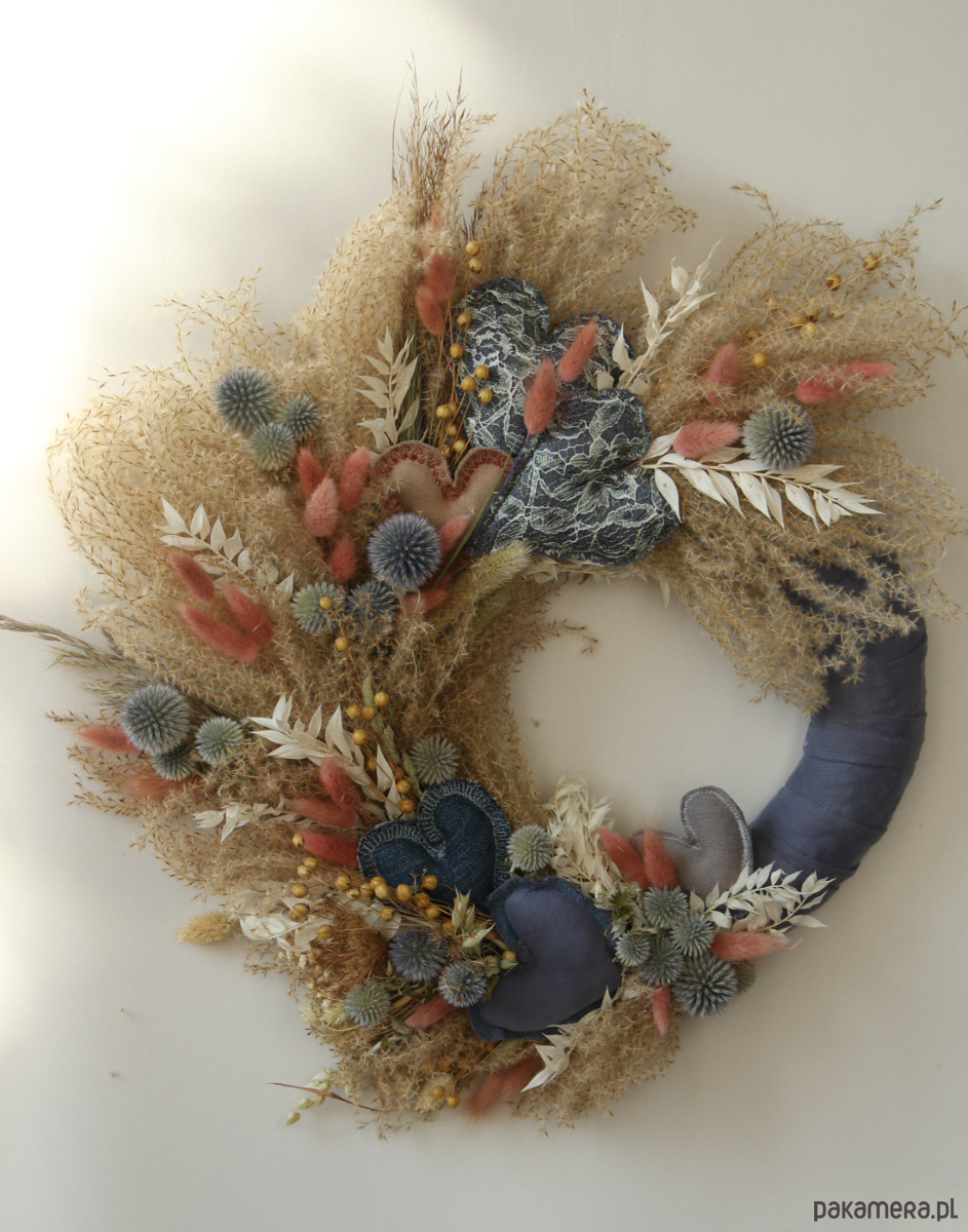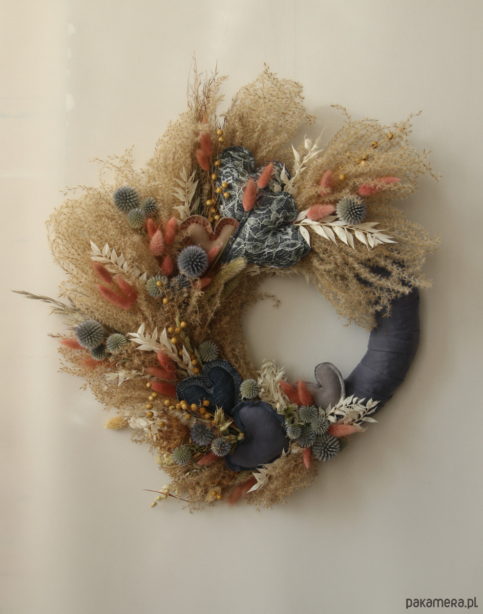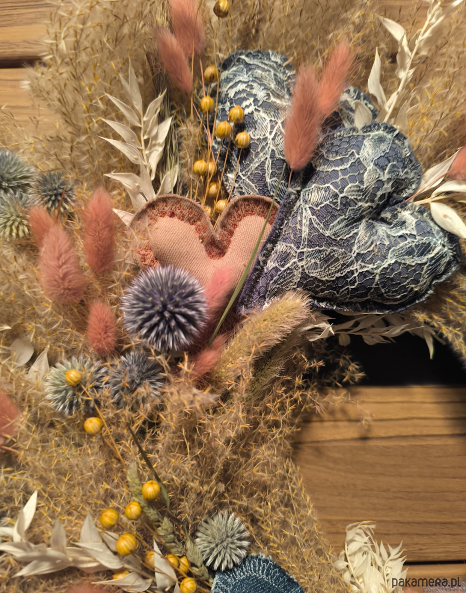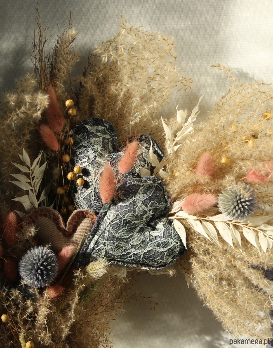 Jest zrobiony ręcznie z suszonych kwiatów i traw ozdobnych.