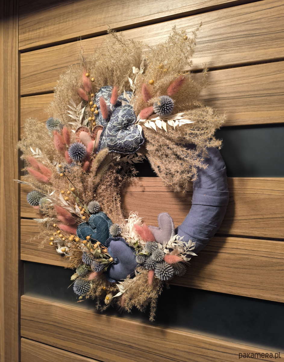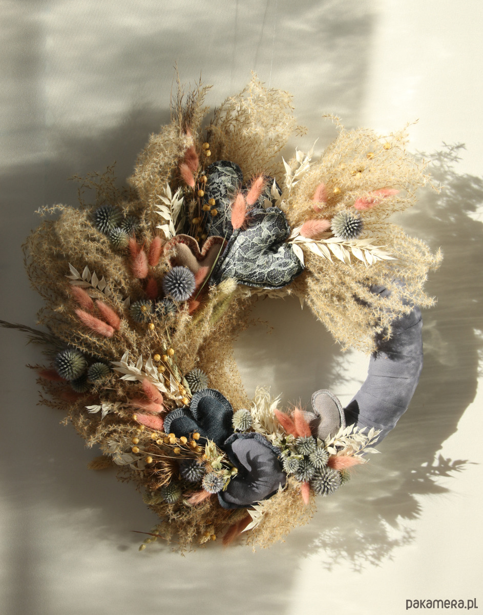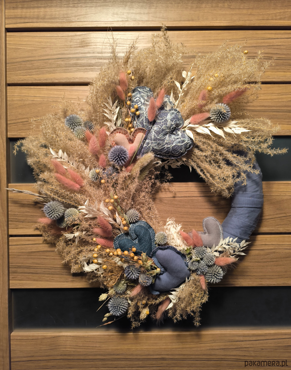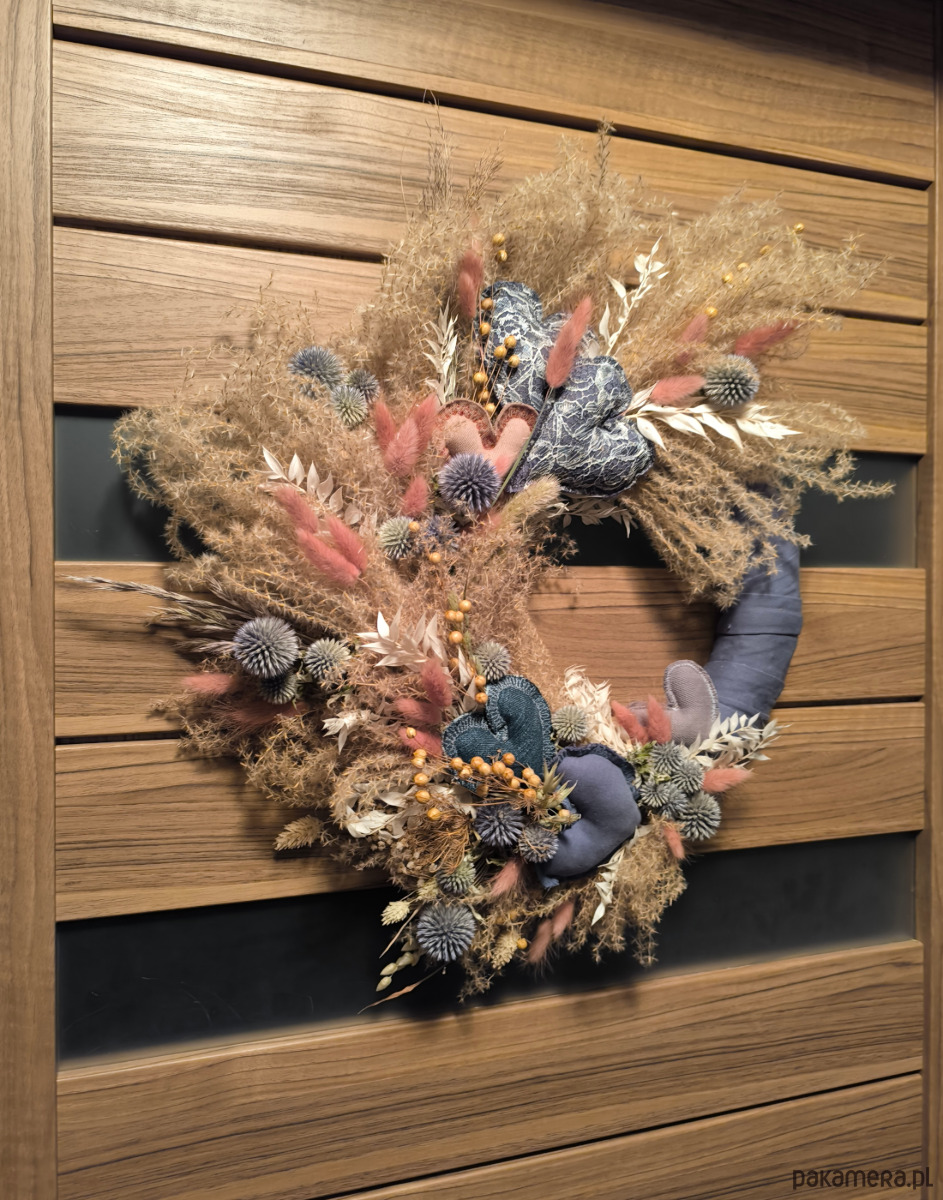 Jest zrobiony ręcznie z suszonych kwiatów i traw ozdobnych.