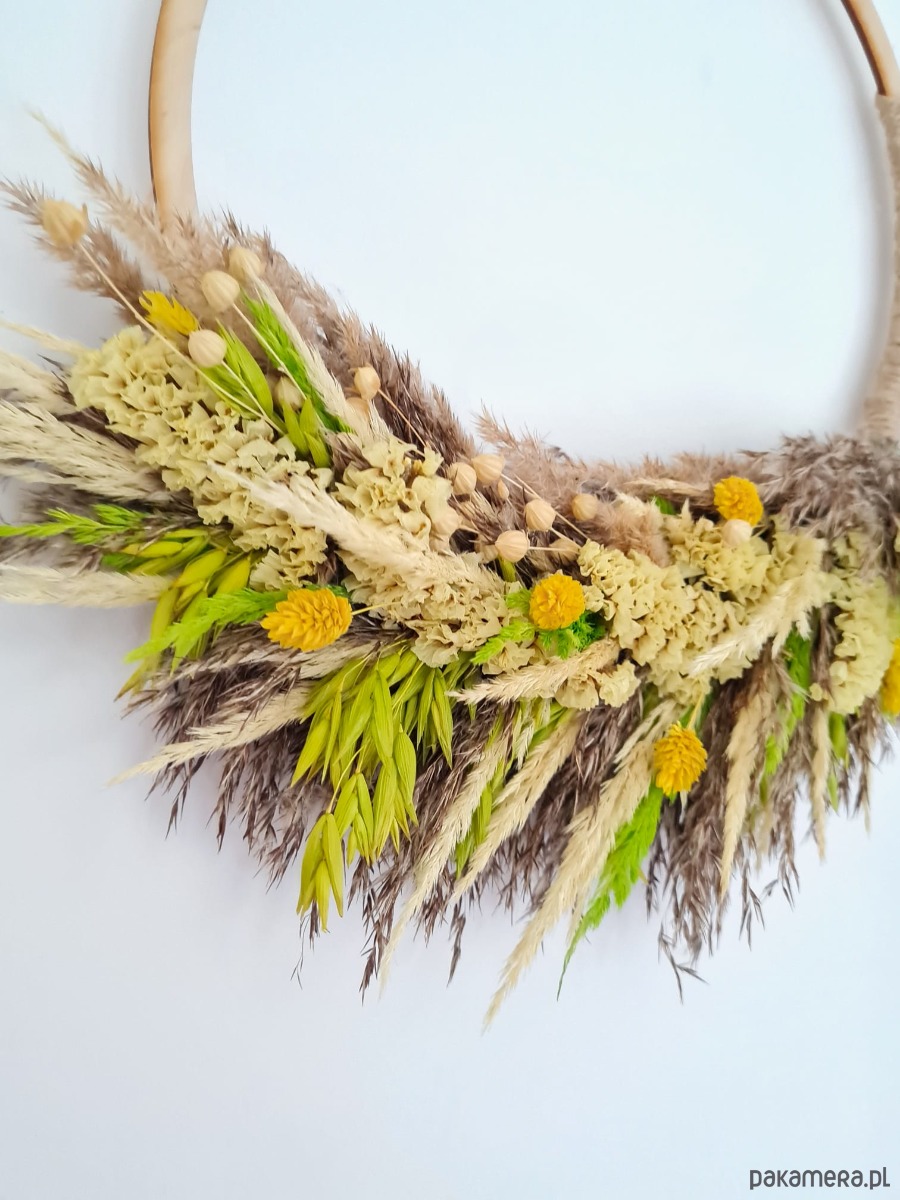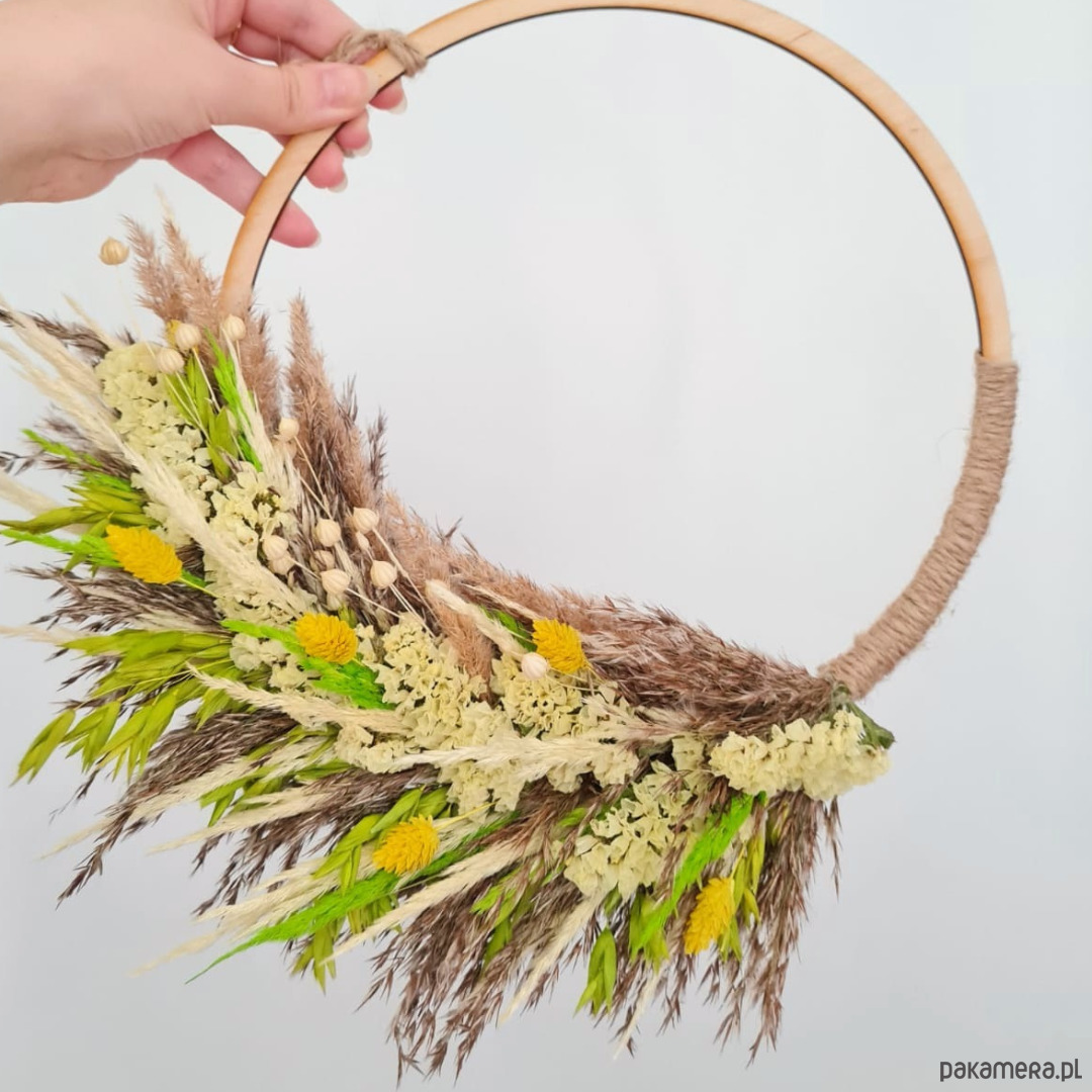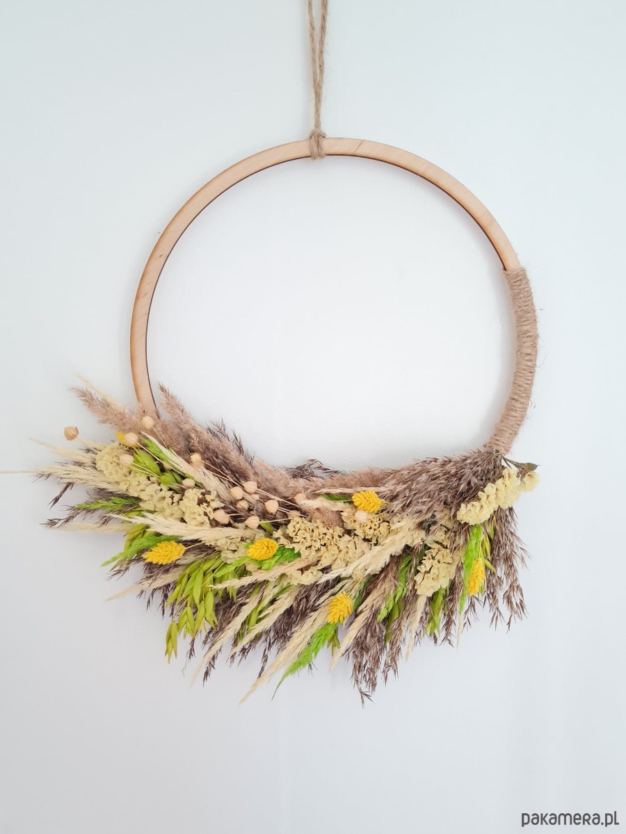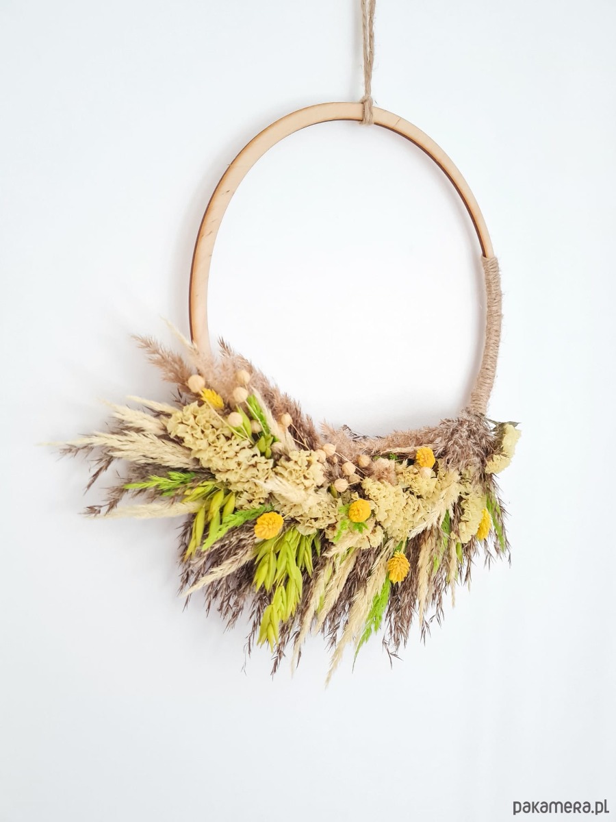 Materiał: drewniana obręcz, suszone kwiaty, sznurek jutowy/konopny