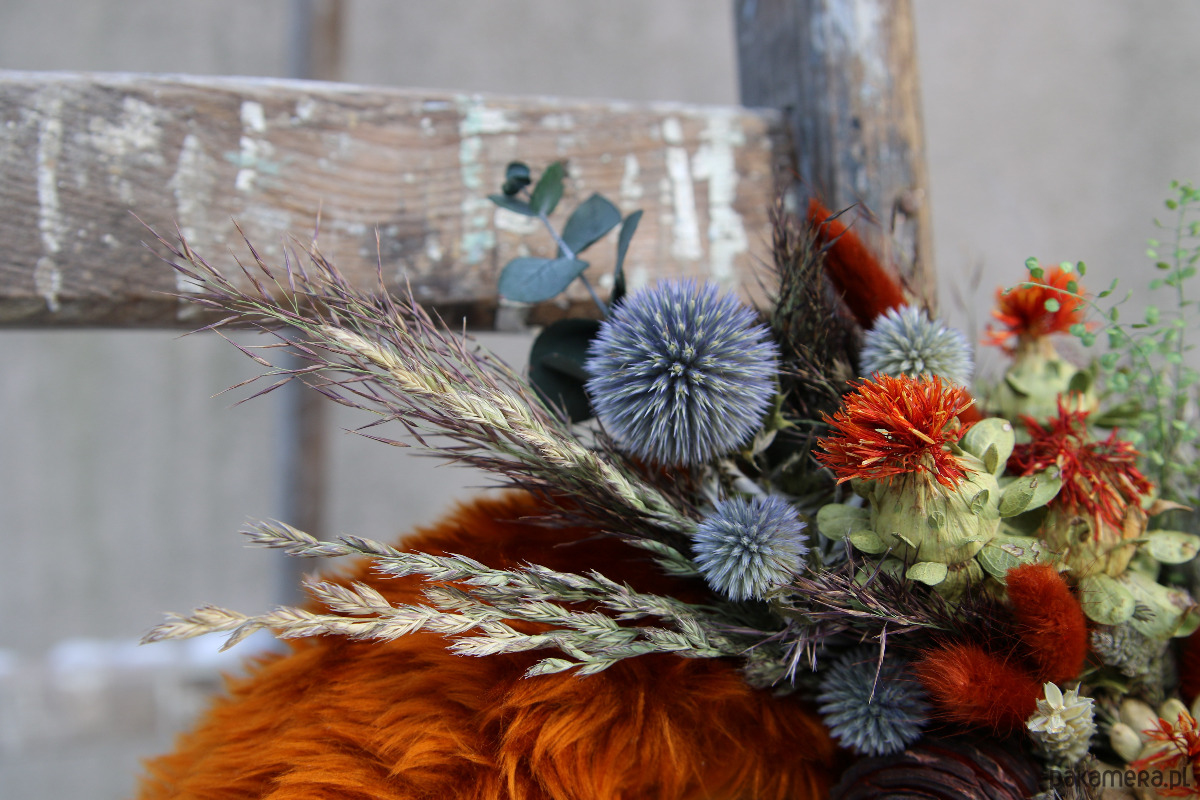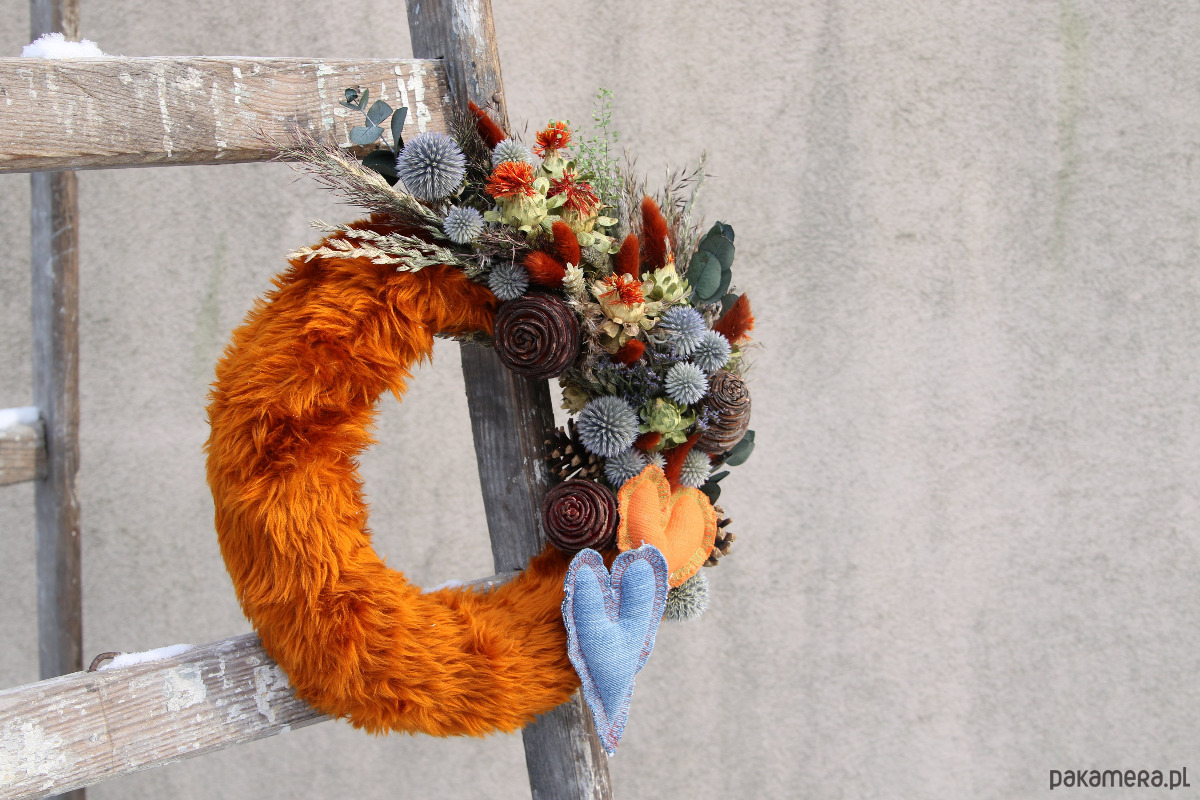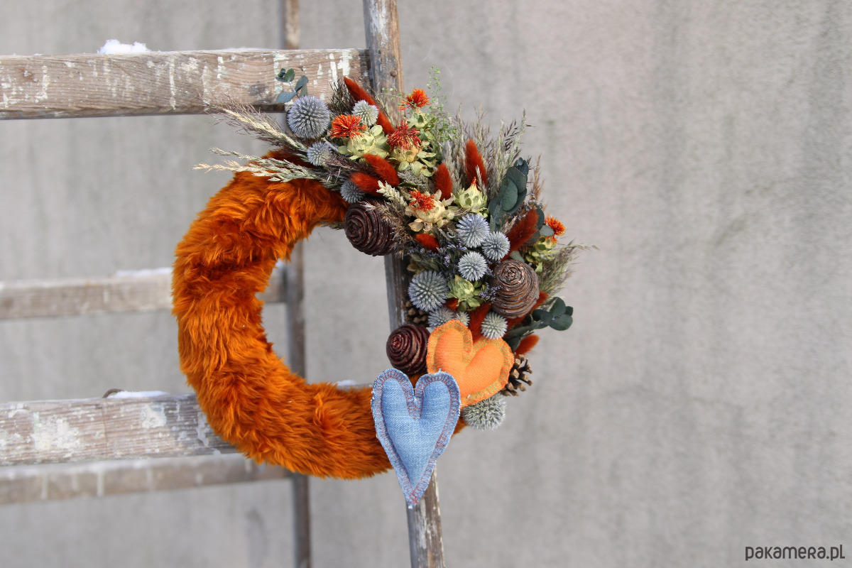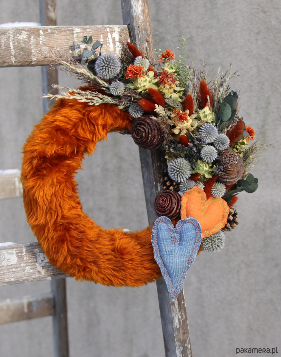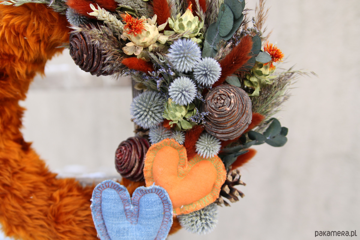 Uroczy dekoracyjny wianek na ścianę z materiałowymi serduszkami. Futerkowy, ciepły i miękki. Zawiera suszone i stabilizowane kwiaty w kontrastowych barwach, ciekawy susz egzotyczny, dmuszki brązowe super nawiązujące do futerka i naturalnie błękitny przegorzan. Jest wesoły i energetyczny. Idealny na prezent na Walentynki lub bez okazji dla bliskiej osoby.
