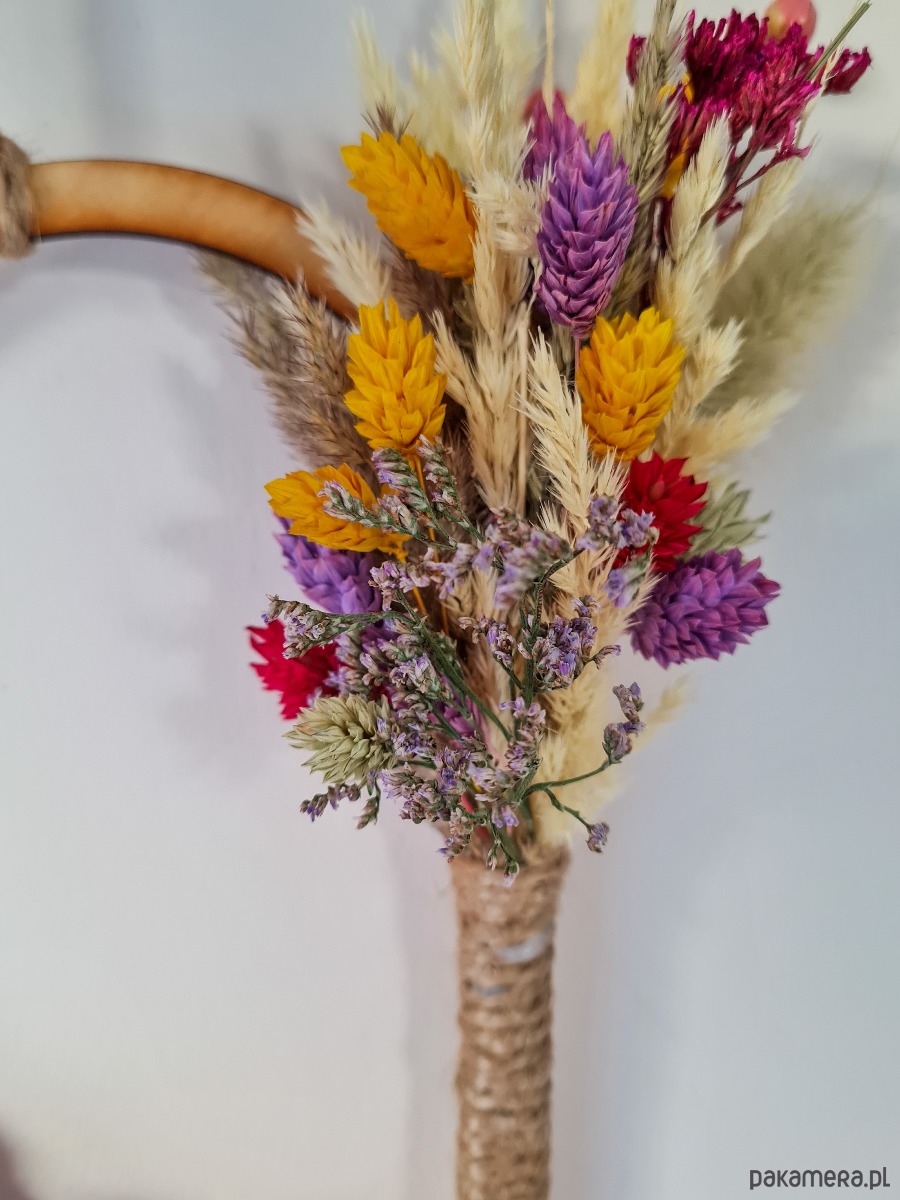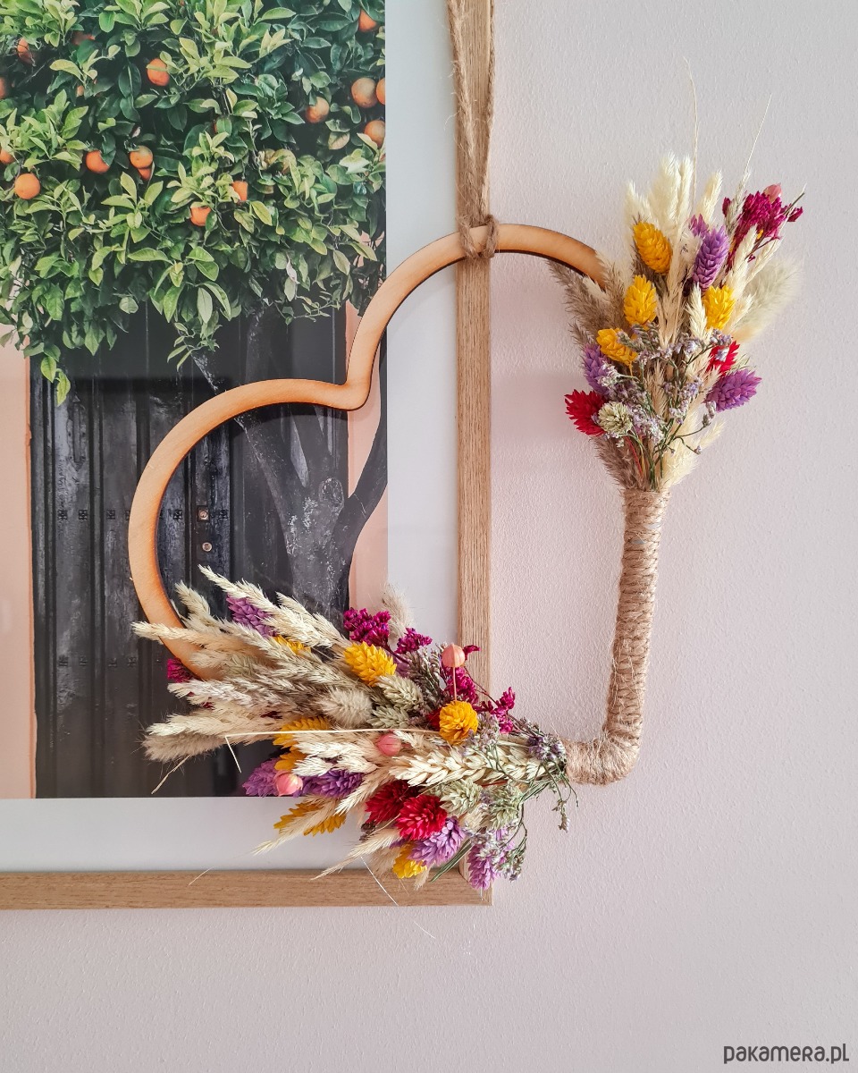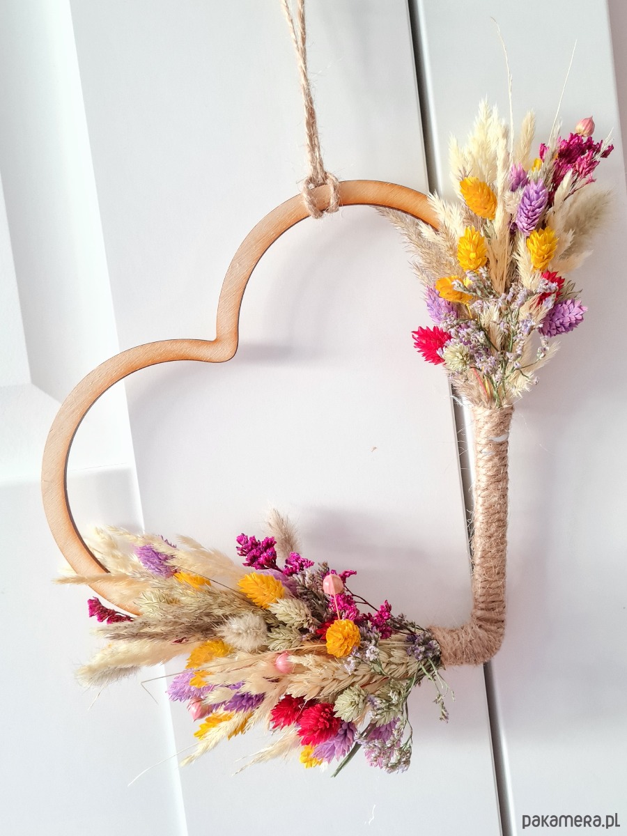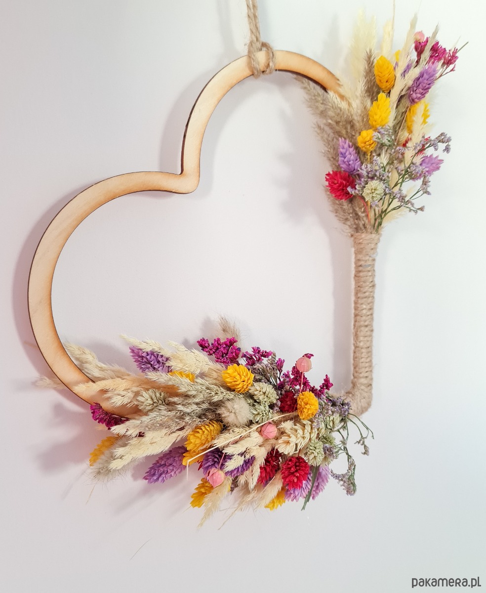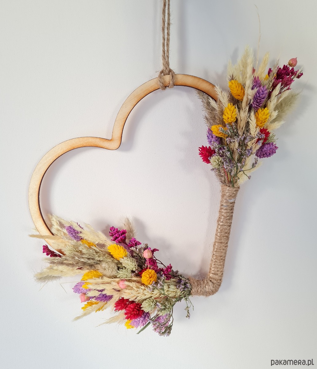 Material: suszone kwiaty, suszone trawy, naturalny sznurek jutowy, drewniane serce 20 cm.