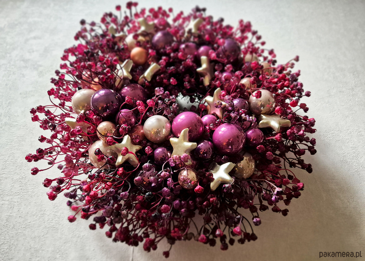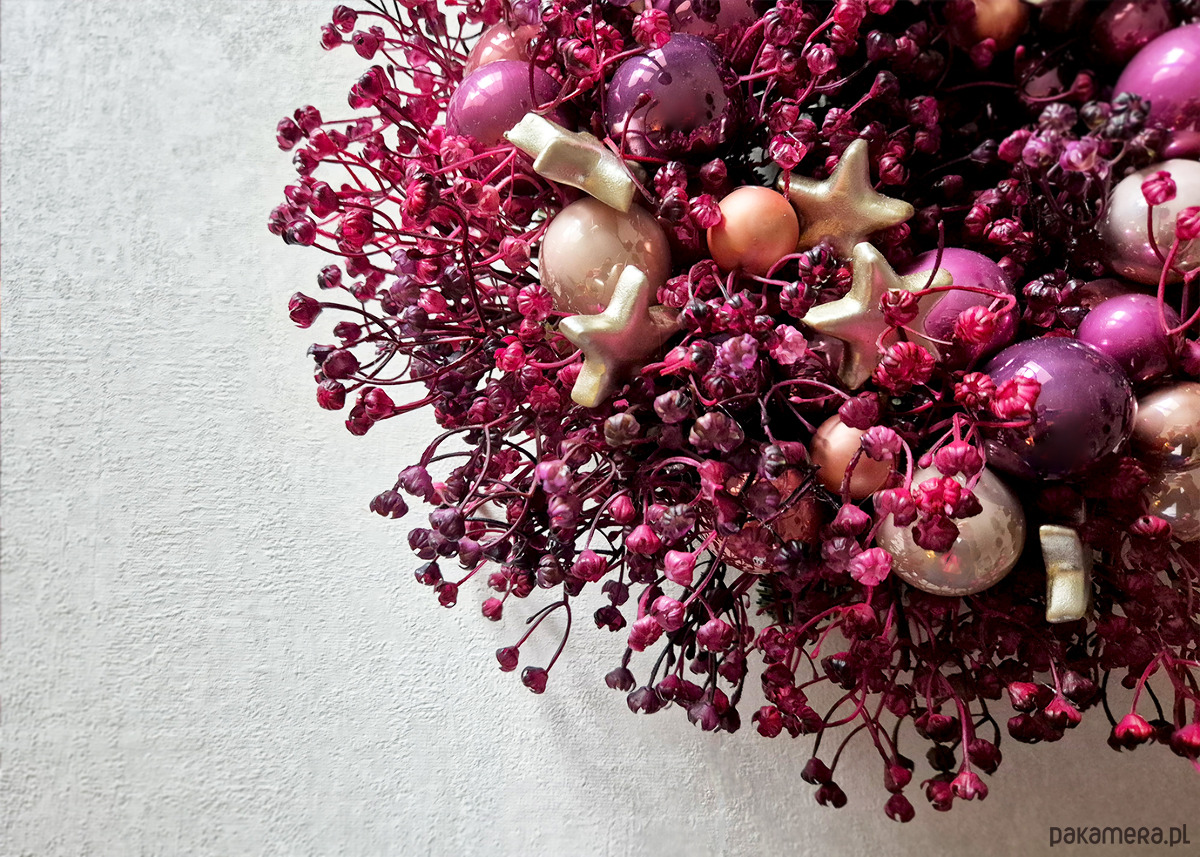 Oryginalny wianek w niebanalnej kolorystyce. Wibrujący głębokimi kolorami bordo, różu i fioletu. Wykonany na bazie wysokiej jakości imitacji gipsówki. Jednocześnie delikatny i rozgrzewający niczym świąteczny grzaniec. Średnica ok. 39cm
