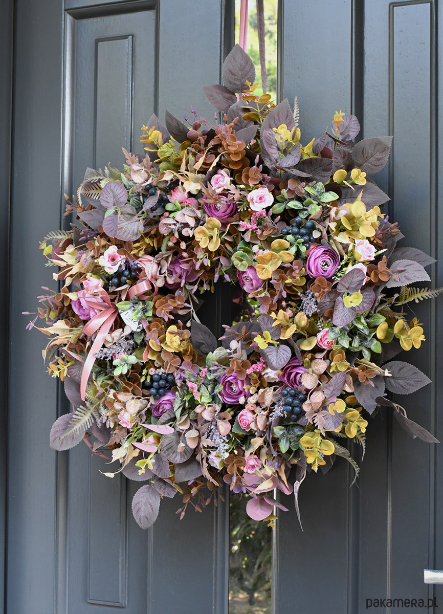 Bogato utkany wrzosem i owocami jesieni wianek w kolorze śliwki, ciepłych żółci, pomarańczy wianek na drzwi.