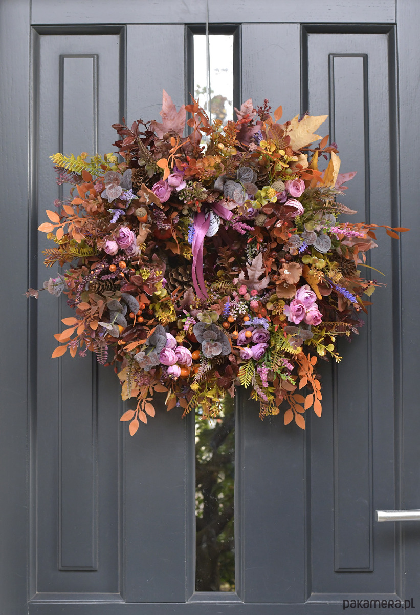 Bogato utkany wrzosem i owocami jesieni wianek w kolorze śliwki, ciepłych żółci, pomarańczy i i czerwieni.