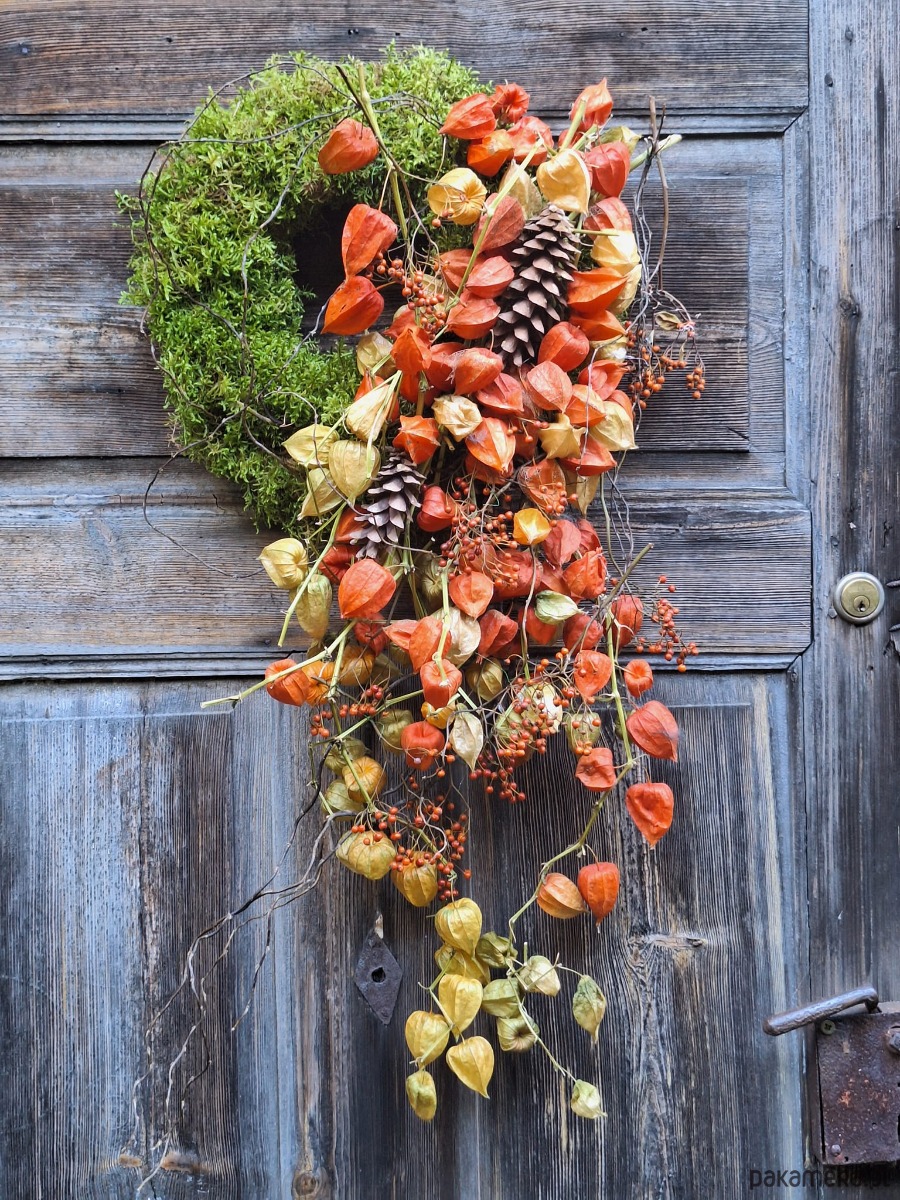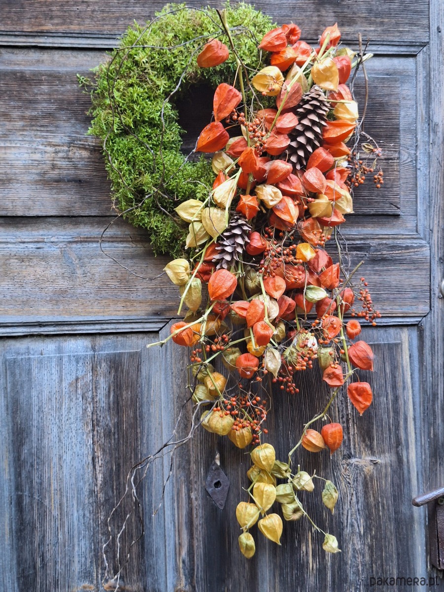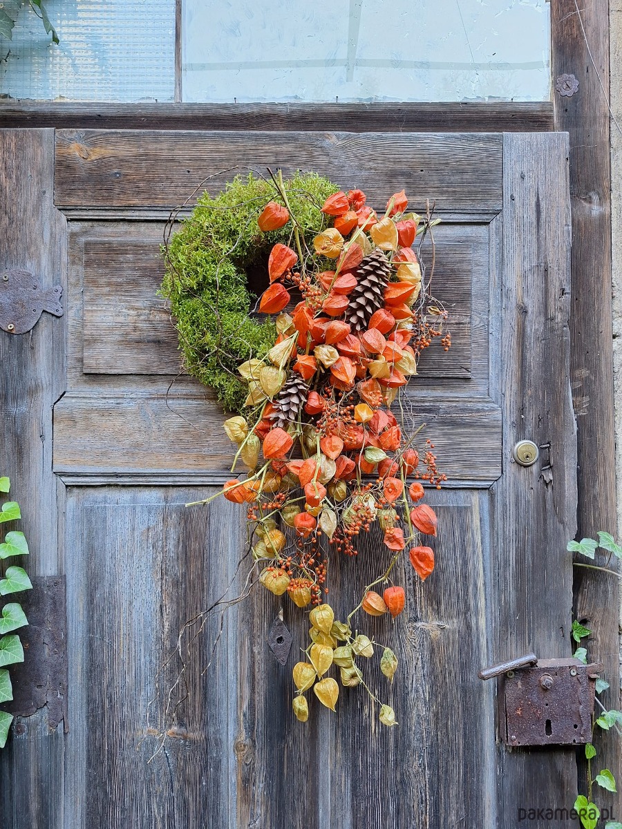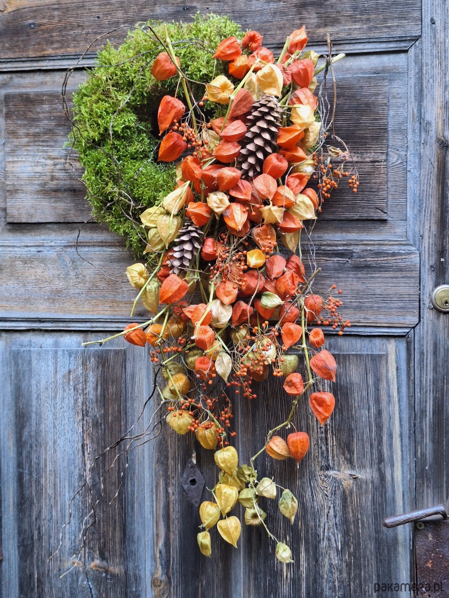 Z czasem się przebarwi i zasuszy.Średnica około 50 cm.Do wianka wykorzystałam różę i mech,miechunkę.